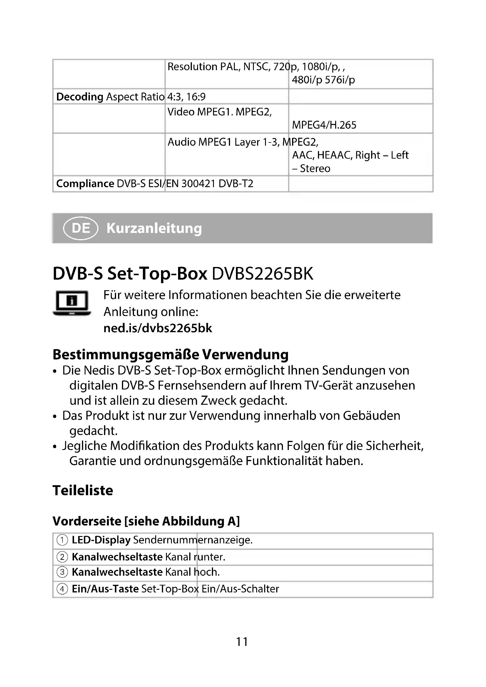 Kurzanleitung DVB-S Set-Top-Box DVBS2265BK Für weitere Informationen beachten Sie die erweiterte Anleitung online: ned.is/dvbs2265bk Bestimmungsgemäße Verwendung