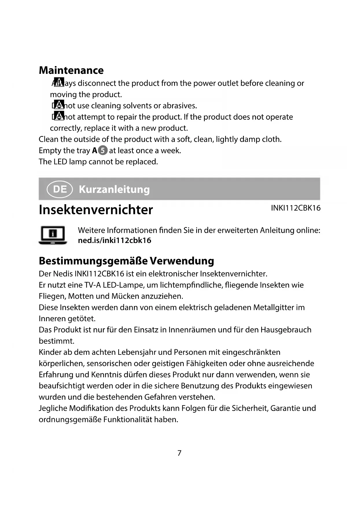 Kurzanleitung Insektenvernichter INKI112CBK16Weitere Informationen nden Sie in der erweiterten Anleitung online: ned.is/inki112cbk16 Bestimmungsgemäße Verwendung Der Nedis INKI112CBK16 ist ein elektronischer Insektenvernichter.Er nutzt eine TV-A LED-Lampe, um lichtempndliche, iegende Insekten wie Fliegen, Motten und Mücken anzuziehen.Diese Insekten werden dann von einem elektrisch geladenen Metallgitter im Inneren getötet.Das Produkt ist nur für den Einsatz in Innenräumen und für den Hausgebrauch bestimmt.Kinder ab dem achten Lebensjahr und Personen mit eingeschränkten körperlichen, sensorischen oder geistigen Fähigkeiten oder ohne ausreichende Erfahrung und Kenntnis dürfen dieses Produkt nur dann verwenden, wenn sie beaufsichtigt werden oder in die sichere Benutzung des Produkts eingewiesen wurden und die bestehenden Gefahren verstehen.Jegliche Modikation des Produkts kann Folgen für die Sicherheit, Garantie und ordnungsgemäße Funktionalität haben.8 Hauptbestandteile (Abbildung A) 1 Kettenring 2 Gehäuse 3 Metallgitter 4 Stromkabel 5 Schale Sicherheitshinweise