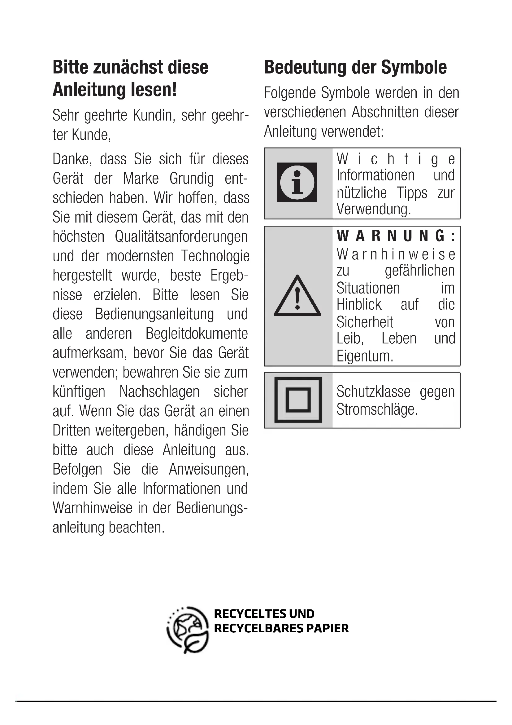 WARNUNG: Warnhinweise zu gefährlichen Situationen im Hinblick auf die Sicherheit von Leib, Leben und Eigentum. Schutzklasse gegen Stromschläge. RECYCELTES UND