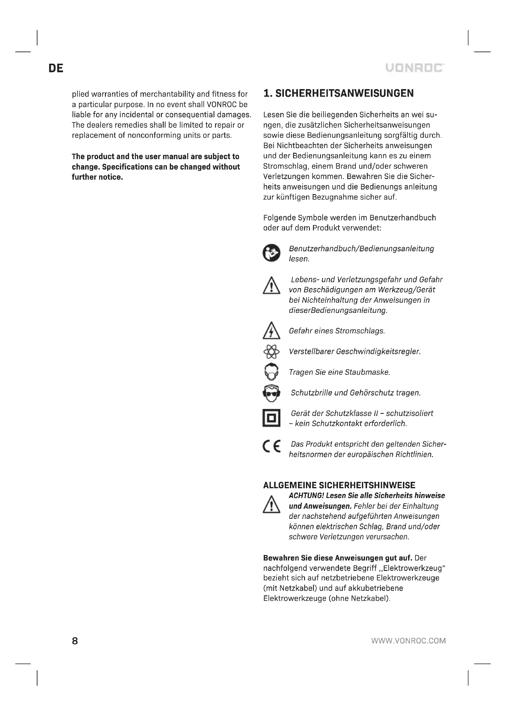 Lesen Sie die beiliegenden Sicherheits an wei su- ngen, die zusätzlichen Sicherheitsanweisungen sowie diese Bedienungsanleitung sorgfältig durch. Bei Nichtbeachten der Sicherheits anweisungen und der Bedienungsanleitung kann es zu einem Stromschlag, einem Brand und/oder schweren Verletzungen kommen. Bewahren Sie die Sicher- heits anweisungen und die Bedienungs anleitung zur künftigen Bezugnahme sicher auf. Folgende Symbole werden im Benutzerhandbuch oder auf dem Produkt verwendet: Benutzerhandbuch/Bedienungsanleitung lesen. Lebens- und Verletzungsgefahr und Gefahr von Beschädigungen am Werkzeug/Gerät bei Nichteinhaltung der Anweisungen in dieser Bedienungs anleitung. Gefahr eines Stromschlags. Verstellbarer Geschwindigkeitsregler. Tragen Sie eine Staubmaske. Schutzbrille und Gehörschutz tragen. Gerät der Schutzklasse II – schutzisoliert – kein Schutzkontakt erforderlich. Das Produkt entspricht den geltenden Sicher- heitsnormen der europäischen Richtlinien. ALLGEMEINE SICHERHEITSHINWEISE ACHTUNG! Lesen Sie alle Sicherheits hinweise und Anweisungen. Fehler bei der Einhaltung der nachstehend aufgeführten Anweisungen können elektrischen Schlag, Brand und/oder schwere Verletzungen verursachen. Bewahren Sie diese Anweisungen gut auf. Der nachfolgend verwendete Begriff ,,Elektrowerkzeug” bezieht sich auf netzbetriebene Elektrowerkzeuge (mit Netzkabel) und auf akkubetriebene Elektrowerkzeuge (ohne Netzkabel).DE