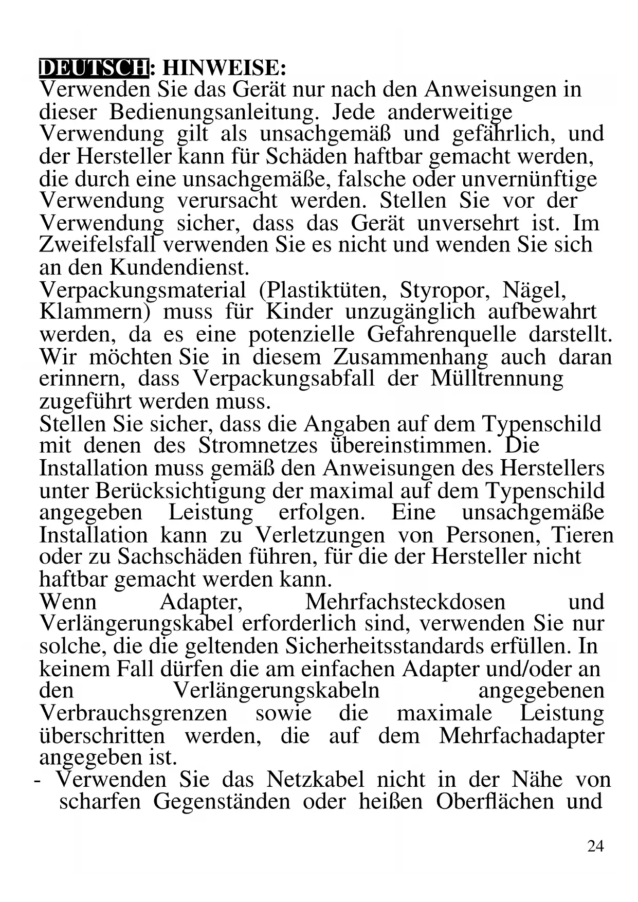 - Oscilation horizontale24 DEUTSCH: HINWEISE: Verwenden Sie das Gerät nur nach den Anweisungen in dieser Bedienungsanleitung. Jede anderweitige Verwendung gilt als unsachgemäß und gefährlich, und der Hersteller kann für Schäden haftbar gemacht werden, die durch eine unsachgemäße, falsche oder unvernünftige Verwendung verursacht werden. Stellen Sie vor der Verwendung sicher, dass das Gerät unversehrt ist. Im Zweifelsfall verwenden Sie es nicht und wenden Sie sich an den Kundendienst. Verpackungsmaterial (Plastiktüten, Styropor, Nägel, Klammern) muss für Kinder unzugänglich aufbewahrt werden, da es eine potenzielle Gefahrenquelle darstellt. Wir möchten Sie in diesem Zusammenhang auch daran erinnern, dass Verpackungsabfall der Mülltrennung zugeführt werden muss. Stellen Sie sicher, dass die Angaben auf dem Typenschild mit denen des Stromnetzes übereinstimmen. Die Installation muss gemäß den Anweisungen des Herstellers unter Berücksichtigung der maximal auf dem Typenschild angegeben Leistung erfolgen. Eine unsachgemäße Installation kann zu Verletzungen von Personen, Tieren oder zu Sachschäden führen, für die der Hersteller nicht haftbar gemacht werden kann. Wenn Adapter, Mehrfachsteckdosen und Verlängerungskabel erforderlich sind, verwenden Sie nur solche, die die geltenden Sicherheitsstandards erfüllen. In keinem Fall dürfen die am einfachen Adapter und/oder an den Verlängerungskabeln angegebenen Verbrauchsgrenzen sowie die maximale Leistung überschritten werden, die auf dem Mehrfachadapter angegeben ist. - Verwenden Sie das Netzkabel nicht in der Nähe von scharfen Gegenständen oder heißen Oberflächen und25 ziehen Sie den Netzstecker nicht am Netzkabel aus der Steckdose. Lassen Sie es nicht von der Arbeitsplatte baumeln, wo ein Kind es halten könnte. Verwenden Sie das Gerät im Falle von Schäden am Netzkabel, Stecker oder im Falle von Kurzschlüssen nicht und lassen Sie es in einer Vertragswerkstatt reparieren. - Setzen Sie das Gerät keinen ungünstigen Wetterbedingungen, wie z. B. Regen, Feuchtigkeit, Frost, aus und bewahren Sie es an einem trockenen Ort auf. Fassen Sie das Gerät nicht mit nassen Händen an und verwenden Sie es nicht barfuß. - Dieses Gerät kann von Kindern ab 8 Jahren und von Personen mit eingeschränkten körperlichen, sensorischen oder geistigen Fähigkeiten oder mangelnder Erfahrung und Kenntnissen verwendet werden, wenn sie beaufsichtigt oder instruiert wurden, um das Gerät sicher zu verwenden und die damit verbundenen Gefahren zu verstehen. Kinder dürfen nicht mit dem Gerät spielen. Reinigung und Benutzerwartung dürfen nicht von Kindern ohne Aufsicht durchgeführt werden. - Kinder dürfen nicht mit dem Gerät spielen. - Bewahren Sie das Gerät und sein Netzanschluss außerhalb der Reichweite von Kinder unter 8 Jahren. Wenn das Netzkabel beschädigt ist oder wenn ein Fehler vorliegt, darf das Gerät nicht manipuliert werden. Jede Reparatur muss vom Hersteller oder seinem technischen Kundendienst oder in jedem Fall von einer Person mit ähnlicher Qualifikation durchgeführt werden, um jegliches Risiko zu vermeiden. Die Nichtbeachtung der vorstehenden Bestimmungen kann die Sicherheit des Geräts beeinträchtigen und die Garantiebedingungen ungültig machen.26 WARNUNG: Dieses Gerät enthält eine Heizfunktion. Oberflächen, außer die funktionellen Oberflächen können hohe Temperaturen entwickeln. Da die Temperaturen von verschiedene Personen unterschiedlich wahrgenommen werden, sollte dieses Gerät mit VORSICHT verwendet werden. Halten Sie das Gerät ausschließlich auf Griffflächen die abhalten und verwenden Sie solche Hitzeschutzmaßen. Dieses Gerät ist nur für den Hausgebrauch oder gleichwertiges bestimmt, in Situationen wie bspw.: Kantinen in kleinen Firmen oder ähnliche Arbeitsumgebungen, von Kunden in Hotels, Motels oder andere Art von touristische Unterkunft, wie ländlicher oder Wohn –Tourismus. Das Gerät darf nicht mit einer Zeitschaltuhr oder mit einem separaten Fernwirksystem betrieben werden Führen Sie vor jedem Gebrauch das Netzkabel aus. Setzen Sie das Produkt keinen Stößen aus, es könnte beschädigt werden. Verwenden Sie nur originale und kompatible Teile und Zubehör. Halten Sie das Gerät fern von brennbaren Materialien, Wärmequellen, Dampf-und kalte Zonen. BEDIENUNGSANLEITUNG Montieren Sie das Gerät völlig und folgen Sie der Anleitung sorgfältig. Stecken Sie den Stecker nicht hinein, wenn Sie mit der Montage noch nicht fertig sind. Betreiben Sie nie das Gerät unbewacht. Nach jeder Nutzung, ziehen Sie immer den Stecker aus der Steckdose. Dafür ziehen Sie am Stecker, nicht am Kabel. Tauchen Sie das Gerät nicht in Wasser oder andere Flüssigkeiten und vermeiden Sie Spritze auf es. Bevor Sie das Gerät reinigen, ziehen Sie den Stecker aus der Steckdose.27 G5V001 Vor jeder Nutzung, rollen Sie das Kabel ab. Stecken Sie keine Gegenstände in die Schutzgitter. Verstopfen Sie die Schutzgitter nicht. Stellen Sie das Gerät auf feste, stabile Flächen, von Fenstern oder Luftströmen fern.
