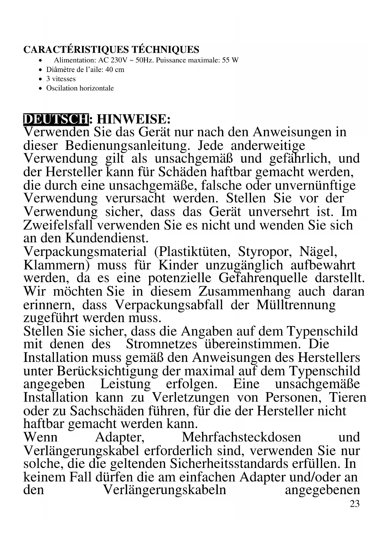 DEUTSCH: HINWEISE: Verwenden Sie das Gerät nur nach den Anweisungen in dieser Bedienungsanleitung. Jede anderweitige Verwendung gilt als unsachgemäß und gefährlich, und der Hersteller kann für Schäden haftbar gemacht werden, die durch eine unsachgemäße, falsche oder unvernünftige Verwendung verursacht werden. Stellen Sie vor der Verwendung sicher, dass das Gerät unversehrt ist. Im Zweifelsfall verwenden Sie es nicht und wenden Sie sich an den Kundendienst. Verpackungsmaterial (Plastiktüten, Styropor, Nägel, Klammern) muss für Kinder unzugänglich aufbewahrt werden, da es eine potenzielle Gefahrenquelle darstellt. Wir möchten Sie in diesem Zusammenhang auch daran erinnern, dass Verpackungsabfall der Mülltrennung zugeführt werden muss. Stellen Sie sicher, dass die Angaben auf dem Typenschild mit denen des Stromnetzes übereinstimmen. Die Installation muss gemäß den Anweisungen des Herstellers unter Berücksichtigung der maximal auf dem Typenschild angegeben Leistung erfolgen. Eine unsachgemäße Installation kann zu Verletzungen von Personen, Tieren oder zu Sachschäden führen, für die der Hersteller nicht haftbar gemacht werden kann. Wenn Adapter, Mehrfachsteckdosen und Verlängerungskabel erforderlich sind, verwenden Sie nur solche, die die geltenden Sicherheitsstandards erfüllen. In keinem Fall dürfen die am einfachen Adapter und/oder an den Verlängerungskabeln angegebenen24 Verbrauchsgrenzen sowie die maximale Leistung überschritten werden, die auf dem Mehrfachadapter angegeben ist. - Verwenden Sie das Netzkabel nicht in der Nähe von scharfen Gegenständen oder heißen Oberflächen und ziehen Sie den Netzstecker nicht am Netzkabel aus der Steckdose. Lassen Sie es nicht von der Arbeitsplatte baumeln, wo ein Kind es halten könnte. Verwenden Sie das Gerät im Falle von Schäden am Netzkabel, Stecker oder im Falle von Kurzschlüssen nicht und lassen Sie es in einer Vertragswerkstatt reparieren. - Setzen Sie das Gerät keinen ungünstigen Wetterbedingungen, wie z. B. Regen, Feuchtigkeit, Frost, aus und bewahren Sie es an einem trockenen Ort auf. Fassen Sie das Gerät nicht mit nassen Händen an und verwenden Sie es nicht barfuß. - Dieses Gerät kann von Kindern ab 8 Jahren und von Personen mit eingeschränkten körperlichen, sensorischen oder geistigen Fähigkeiten oder mangelnder Erfahrung und Kenntnissen verwendet werden, wenn sie beaufsichtigt oder instruiert wurden, um das Gerät sicher zu verwenden und die damit verbundenen Gefahren zu verstehen. Kinder dürfen nicht mit dem Gerät spielen. Reinigung und Benutzerwartung dürfen nicht von Kindern ohne Aufsicht durchgeführt werden. - Kinder dürfen nicht mit dem Gerät spielen. - Bewahren Sie das Gerät und sein Netzanschluss außerhalb der Reichweite von Kinder unter 8 Jahren. Wenn das Netzkabel beschädigt ist oder wenn ein Fehler vorliegt, darf das Gerät nicht manipuliert werden. Jede Reparatur muss vom Hersteller oder seinem technischen Kundendienst oder in jedem Fall von einer Person mit ähnlicher Qualifikation durchgeführt werden, um jegliches Risiko zu vermeiden. Die Nichtbeachtung der25 vorstehenden Bestimmungen kann die Sicherheit des Geräts beeinträchtigen und die Garantiebedingungen ungültig machen. WARNUNG: Dieses Gerät enthält eine Heizfunktion. Oberflächen, außer die funktionellen Oberflächen können hohe Temperaturen entwickeln. Da die Temperaturen von verschiedene Personen unterschiedlich wahrgenommen werden, sollte dieses Gerät mit VORSICHT verwendet werden. Halten Sie das Gerät ausschließlich auf Griffflächen die abhalten und verwenden Sie solche Hitzeschutzmaßen. Dieses Gerät ist nur für den Hausgebrauch oder gleichwertiges bestimmt, in Situationen wie bspw.: Kantinen in kleinen Firmen oder ähnliche Arbeitsumgebungen, von Kunden in Hotels, Motels oder andere Art von touristische Unterkunft, wie ländlicher oder Wohn –Tourismus. Das Gerät darf nicht mit einer Zeitschaltuhr oder mit einem separaten Fernwirksystem betrieben werden Führen Sie vor jedem Gebrauch das Netzkabel aus. Setzen Sie das Produkt keinen Stößen aus, es könnte beschädigt werden. Verwenden Sie nur originale und kompatible Teile und Zubehör. Halten Sie das Gerät fern von brennbaren Materialien, Wärmequellen, Dampf-und kalte Zonen. BEDIENUNGSANLEITUNG Montieren Sie das Gerät völlig und folgen Sie der Anleitung sorgfältig. Stecken Sie den Stecker nicht hinein, wenn Sie mit der Montage noch nicht fertig sind. Betreiben Sie nie das Gerät unbewacht. Nach jeder Nutzung, ziehen Sie immer den Stecker aus der Steckdose. Dafür ziehen Sie am Stecker, nicht am Kabel. Tauchen Sie das Gerät nicht in Wasser oder andere Flüssigkeiten26 und vermeiden Sie Spritze auf es. Bevor Sie das Gerät reinigen, ziehen Sie den Stecker aus der Steckdose. Vor jeder Nutzung, rollen Sie das Kabel ab. Stecken Sie keine Gegenstände in die Schutzgitter. Verstopfen Sie die Schutzgitter nicht. Stellen Sie das Gerät auf feste, stabile Flächen, von Fenstern oder Luftströmen fern.