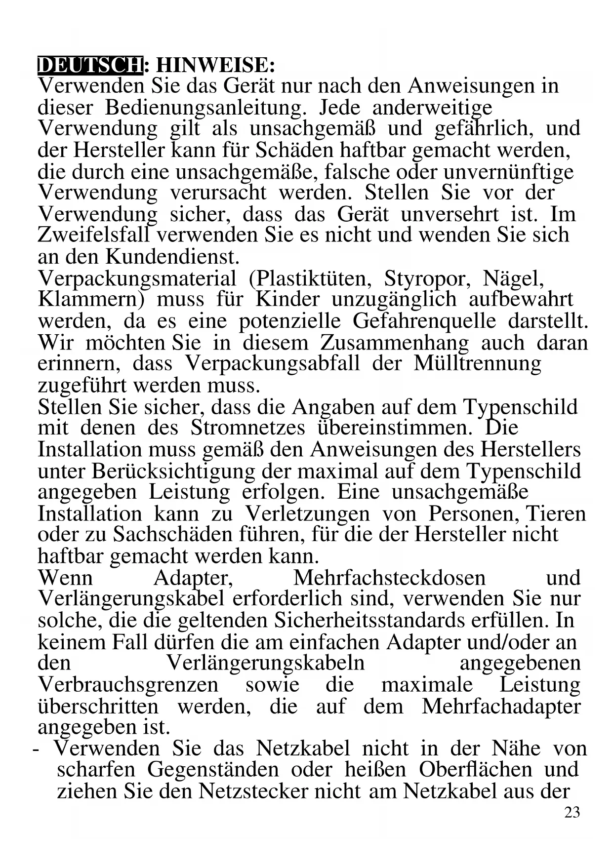 - Oscilation horizontale23 DEUTSCH: HINWEISE: Verwenden Sie das Gerät nur nach den Anweisungen in dieser Bedienungsanleitung. Jede anderweitige Verwendung gilt als unsachgemäß und gefährlich, und der Hersteller kann für Schäden haftbar gemacht werden, die durch eine unsachgemäße, falsche oder unvernünftige Verwendung verursacht werden. Stellen Sie vor der Verwendung sicher, dass das Gerät unversehrt ist. Im Zweifelsfall verwenden Sie es nicht und wenden Sie sich an den Kundendienst. Verpackungsmaterial (Plastiktüten, Styropor, Nägel, Klammern) muss für Kinder unzugänglich aufbewahrt werden, da es eine potenzielle Gefahrenquelle darstellt. Wir möchten Sie in diesem Zusammenhang auch daran erinnern, dass Verpackungsabfall der Mülltrennung zugeführt werden muss. Stellen Sie sicher, dass die Angaben auf dem Typenschild mit denen des Stromnetzes übereinstimmen. Die Installation muss gemäß den Anweisungen des Herstellers unter Berücksichtigung der maximal auf dem Typenschild angegeben Leistung erfolgen. Eine unsachgemäße Installation kann zu Verletzungen von Personen, Tieren oder zu Sachschäden führen, für die der Hersteller nicht haftbar gemacht werden kann. Wenn Adapter, Mehrfachsteckdosen und Verlängerungskabel erforderlich sind, verwenden Sie nur solche, die die geltenden Sicherheitsstandards erfüllen. In keinem Fall dürfen die am einfachen Adapter und/oder an den Verlängerungskabeln angegebenen Verbrauchsgrenzen sowie die maximale Leistung überschritten werden, die auf dem Mehrfachadapter angegeben ist. - Verwenden Sie das Netzkabel nicht in der Nähe von scharfen Gegenständen oder heißen Oberflächen und ziehen Sie den Netzstecker nicht am Netzkabel aus der24 Steckdose. Lassen Sie es nicht von der Arbeitsplatte baumeln, wo ein Kind es halten könnte. Verwenden Sie das Gerät im Falle von Schäden am Netzkabel, Stecker oder im Falle von Kurzschlüssen nicht und lassen Sie es in einer Vertragswerkstatt reparieren. - Setzen Sie das Gerät keinen ungünstigen Wetterbedingungen, wie z. B. Regen, Feuchtigkeit, Frost, aus und bewahren Sie es an einem trockenen Ort auf. Fassen Sie das Gerät nicht mit nassen Händen an und verwenden Sie es nicht barfuß. - Dieses Gerät kann von Kindern ab 8 Jahren und von Personen mit eingeschränkten körperlichen, sensorischen oder geistigen Fähigkeiten oder mangelnder Erfahrung und Kenntnissen verwendet werden, wenn sie beaufsichtigt oder instruiert wurden, um das Gerät sicher zu verwenden und die damit verbundenen Gefahren zu verstehen. Kinder dürfen nicht mit dem Gerät spielen. Reinigung und Benutzerwartung dürfen nicht von Kindern ohne Aufsicht durchgeführt werden. - Kinder dürfen nicht mit dem Gerät spielen. - Bewahren Sie das Gerät und sein Netzanschluss außerhalb der Reichweite von Kinder unter 8 Jahren. Wenn das Netzkabel beschädigt ist oder wenn ein Fehler vorliegt, darf das Gerät nicht manipuliert werden. Jede Reparatur muss vom Hersteller oder seinem technischen Kundendienst oder in jedem Fall von einer Person mit ähnlicher Qualifikation durchgeführt werden, um jegliches Risiko zu vermeiden. Die Nichtbeachtung der vorstehenden Bestimmungen kann die Sicherheit des Geräts beeinträchtigen und die Garantiebedingungen ungültig machen. Dieses Gerät ist nur für den Hausgebrauch oder gleichwertiges bestimmt, in Situationen wie bspw.: Kantinen in kleinen Firmen oder ähnliche25 Arbeitsumgebungen, von Kunden in Hotels, Motels oder andere Art von touristische Unterkunft, wie ländlicher oder Wohn –Tourismus. Das Gerät darf nicht mit einer Zeitschaltuhr oder mit einem separaten Fernwirksystem betrieben werden Führen Sie vor jedem Gebrauch das Netzkabel aus. Setzen Sie das Produkt keinen Stößen aus, es könnte beschädigt werden. Verwenden Sie nur originale und kompatible Teile und Zubehör. Halten Sie das Gerät fern von brennbaren Materialien, Wärmequellen, Dampf-und kalte Zonen. BEDIENUNGSANLEITUNG Montieren Sie das Gerät völlig und folgen Sie der Anleitung sorgfältig. Stecken Sie den Stecker nicht hinein, wenn Sie mit der Montage noch nicht fertig sind. Betreiben Sie nie das Gerät unbewacht. Nach jeder Nutzung, ziehen Sie immer den Stecker aus der Steckdose. Dafür ziehen Sie am Stecker, nicht am Kabel. Tauchen Sie das Gerät nicht in Wasser oder andere Flüssigkeiten und vermeiden Sie Spritze auf es. Bevor Sie das Gerät reinigen, ziehen Sie den Stecker aus der Steckdose. Vor jeder Nutzung, rollen Sie das Kabel ab. Stecken Sie keine Gegenstände in die Schutzgitter. Verstopfen Sie die Schutzgitter nicht. Stellen Sie das Gerät auf feste, stabile Flächen, von Fenstern oder Luftströmen fern.