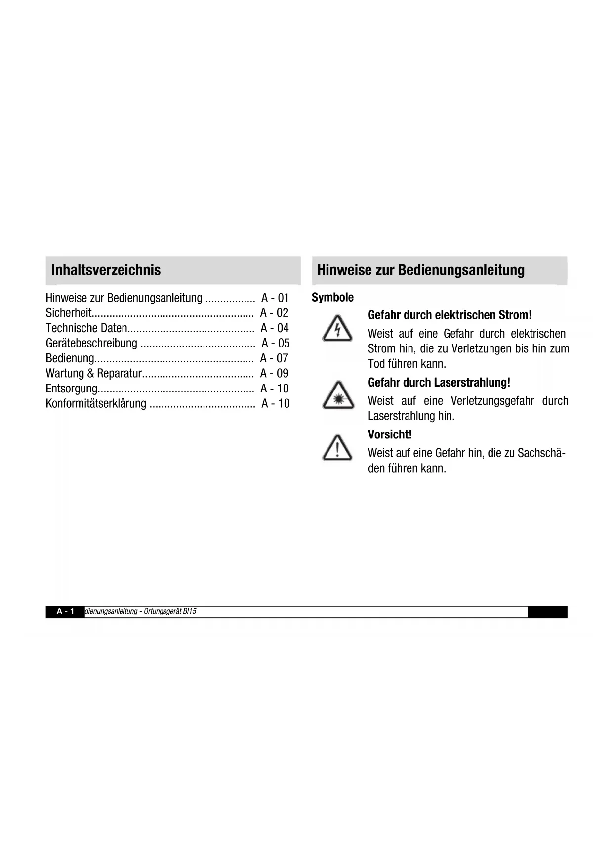 BI15 BEDIENUNGSANLEITUNG OPERATING MANUAL MANUEL D'UTILISATION INT DE EN FR IT NL ES PT PL TR DA FI NO SV RUA - 1 Bedienungsanleitung - Ortungsgerät Bl15 DE Hinweise zur Bedienungsanleitung ................. A - 01 Sicherheit....................................................... A - 02 Technische Daten........................................... A - 04 Gerätebeschreibung ....................................... A - 05 Bedienung...................................................... A - 07 Wartung & Reparatur...................................... A - 09 Entsorgung..................................................... A - 10 Konformitätserklärung .................................... A - 10 Symbole Gefahr durch elektrischen Strom! Weist auf eine Gefahr durch elektrischen Strom hin, die zu Verletzungen bis hin zum Tod führen kann. Gefahr durch Laserstrahlung! Weist auf eine Verletzungsgefahr durch Laserstrahlung hin. Vorsicht! Weist auf eine Gefahr hin, die zu Sachschä- den führen kann. Inhaltsverzeichnis Hinweise zur BedienungsanleitungDE Bedienungsanleitung - Ortungsgerät Bl15 A - 2 Rechtlicher Hinweis Diese Veröffentlichung ersetzt alle vorhergehenden Versionen. Kein Teil dieser Veröffentlichung darf in irgendeiner Form ohne schriftliche Genehmigung von Trotec reproduziert oder unter Verwendung elektroni- scher Systeme verarbeitet, vervielfältigt oder verbreitet werden. Technische Änderungen vorbehalten. Alle Rechte vorbehalten. Warennamen werden ohne Gewährleistung der freien Verwendbarkeit und im Wesentlichen der Schreibweise der Hersteller folgend verwendet. Alle Warennamen sind eingetragen. Konstruktionsveränderungen im Interesse einer laufen- den Produktverbesserung sowie Form- und Farbverän- derungen bleiben vorbehalten. Der Lieferumfang kann von den Produktabbildungen abweichen. Das vorliegen- de Dokument wurde mit der gebotenen Sorgfalt erstellt. Trotec übernimmt keinerlei Haftung für etwaige Fehler oder Auslassungen. © Trotec Bestimmungsgemäße Verwendung Das Gerät ist ausschließlich für die Erkennung von Holz, Metall und wechselstromführenden Leitungen innerhalb des in den technischen Daten angegebenen Bereichs bestimmt. Personen, die das Gerät verwenden, müssen die Bedienungsanleitung, insbesondere das Kapitel „Sicherheit“, gelesen und verstanden haben. Bestimmungswidrige Verwendung Das Gerät darf nicht in explosionsgefährdeten Berei- chen, bei Nässe oder hoher Luftfeuchtigkeit verwendet werden. Für Schäden, die aus nicht bestimmungsgemäßer Ver- wendung resultieren, übernimmt Trotec keine Haftung. Gewährleistungsansprüche erlöschen in diesem Fall. SicherheitA - 3 Bedienungsanleitung - Ortungsgerät Bl15 DE Vorsicht!
