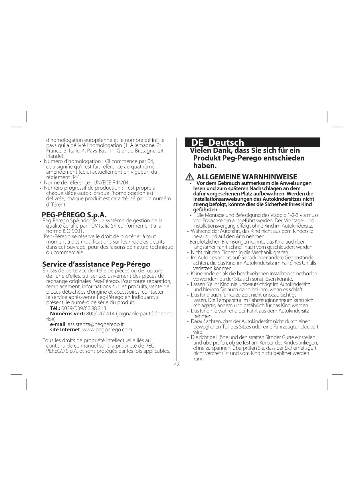 - Die richtige Höhe und den straffen Sitz der Gurte einstellen und überprüfen, ob sie fest am Körper des Kindes anliegen, ohne zu spannen. Überprüfen Sie, dass der Sicherheitsgurt nicht verdreht ist und vom Kind nicht geöffnet werden kann.43 DE_Deutsch Vielen Dank, dass Sie sich für ein Produkt Peg-Perego entschieden haben. ALLGEMEINE WARNHINWEISE