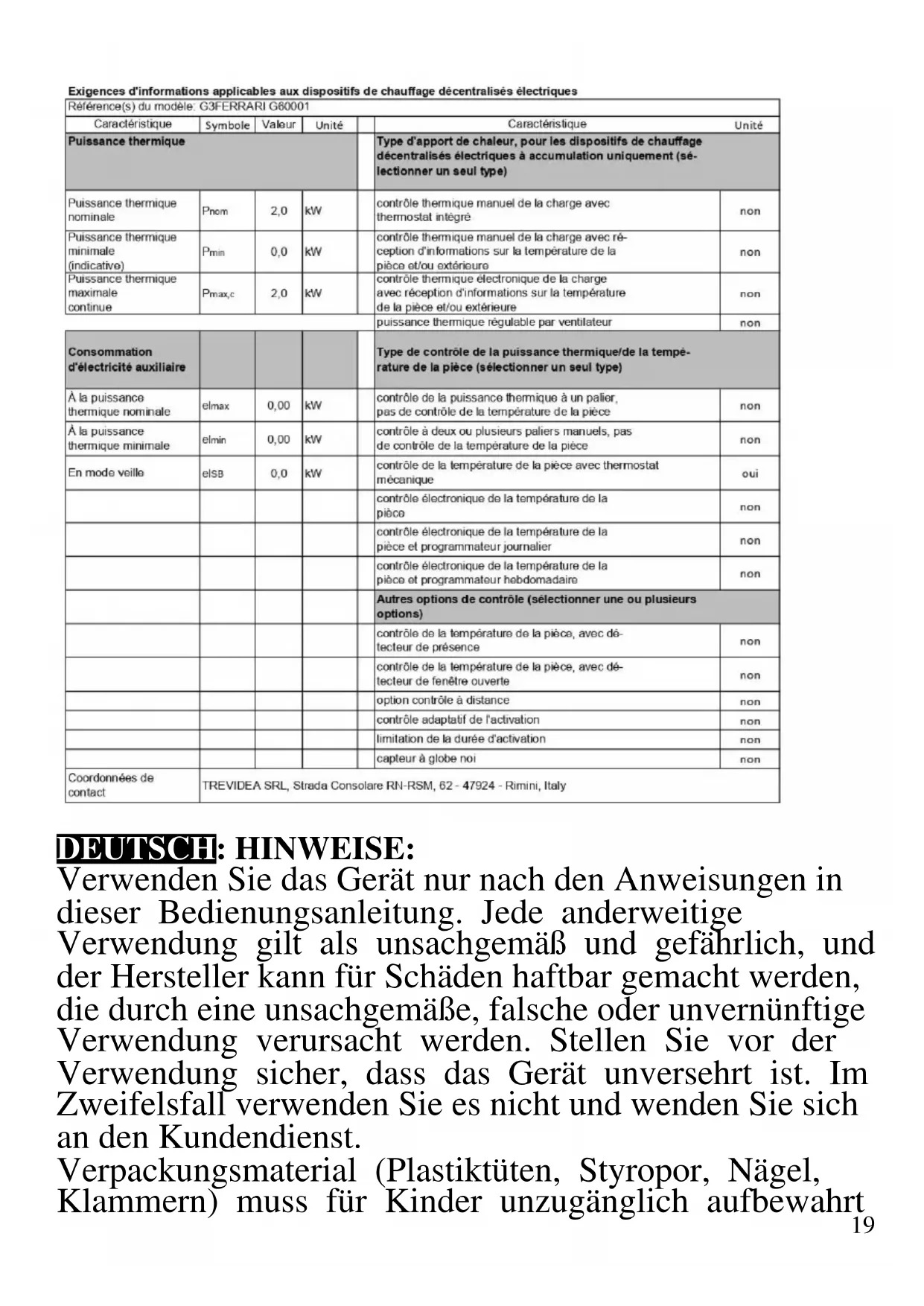 DEUTSCH: HINWEISE: Verwenden Sie das Gerät nur nach den Anweisungen in dieser Bedienungsanleitung. Jede anderweitige Verwendung gilt als unsachgemäß und gefährlich, und der Hersteller kann für Schäden haftbar gemacht werden, die durch eine unsachgemäße, falsche oder unvernünftige Verwendung verursacht werden. Stellen Sie vor der Verwendung sicher, dass das Gerät unversehrt ist. Im Zweifelsfall verwenden Sie es nicht und wenden Sie sich an den Kundendienst. Verpackungsmaterial (Plastiktüten, Styropor, Nägel, Klammern) muss für Kinder unzugänglich aufbewahrt20 werden, da es eine potenzielle Gefahrenquelle darstellt. Wir möchten Sie in diesem Zusammenhang auch daran erinnern, dass Verpackungsabfall der Mülltrennung zugeführt werden muss. Stellen Sie sicher, dass die Angaben auf dem Typenschild mit denen des Stromnetzes übereinstimmen. Die Installation muss gemäß den Anweisungen des Herstellers unter Berücksichtigung der maximal auf dem Typenschild angegeben Leistung erfolgen. Eine unsachgemäße Installation kann zu Verletzungen von Personen, Tieren oder zu Sachschäden führen, für die der Hersteller nicht haftbar gemacht werden kann. Wenn Adapter, Mehrfachsteckdosen und Verlängerungskabel erforderlich sind, verwenden Sie nur solche, die die geltenden Sicherheitsstandards erfüllen. In keinem Fall dürfen die am einfachen Adapter und/oder an den Verlängerungskabeln angegebenen Verbrauchsgrenzen sowie die maximale Leistung überschritten werden, die auf dem Mehrfachadapter angegeben ist. - Verwenden Sie das Netzkabel nicht in der Nähe von scharfen Gegenständen oder heißen Oberflächen und ziehen Sie den Netzstecker nicht am Netzkabel aus der Steckdose. Lassen Sie es nicht von der Arbeitsplatte baumeln, wo ein Kind es halten könnte. Verwenden Sie das Gerät im Falle von Schäden am Netzkabel, Stecker oder im Falle von Kurzschlüssen nicht und lassen Sie es in einer Vertragswerkstatt reparieren. - Setzen Sie das Gerät keinen ungünstigen Wetterbedingungen, wie z. B. Regen, Feuchtigkeit, Frost, aus und bewahren Sie es an einem trockenen Ort auf. Fassen Sie das Gerät nicht mit nassen Händen an und verwenden Sie es nicht barfuß. - Dieses Gerät kann nicht von Kindern verwendet werden, auch wenn diese älter als 8 Jahre sind.21 - Dieses Gerät kann von Personen mit eingeschränkten körperlichen, sensorischen oder geistigen Fähigkeiten oder mangelnder Erfahrung und Kenntnissen verwendet werden, wenn sie in sicherer Weise beaufsichtigt oder instruiert wurden, wie das Gerät verwendet werden kann, und die damit verbundenen Gefahren verstehen. - Kinder dürfen nicht mit dem Gerät spielen. - Bewahren Sie das Gerät und sein Netzanschluss außerhalb der Reichweite von Kinder unter 8 Jahren. Wenn das Netzkabel beschädigt ist oder wenn ein Fehler vorliegt, darf das Gerät nicht manipuliert werden. Jede Reparatur muss vom Hersteller oder seinem technischen Kundendienst oder in jedem Fall von einer Person mit ähnlicher Qualifikation durchgeführt werden, um jegliches Risiko zu vermeiden. Die Nichtbeachtung der vorstehenden Bestimmungen kann die Sicherheit des Geräts beeinträchtigen und die Garantiebedingungen ungültig machen. WARNUNG: Dieses Gerät enthält eine Heizfunktion. Oberflächen, außer die funktionellen Oberflächen können hohe Temperaturen entwickeln. Da die Temperaturen von verschiedene Personen unterschiedlich wahrgenommen werden, sollte dieses Gerät mit VORSICHT verwendet werden. Halten Sie das Gerät ausschließlich auf Griffflächen die abhalten und verwenden Sie solche Hitzeschutzmaßen. Dieses Gerät ist nur für den Hausgebrauch oder gleichwertiges bestimmt, in Situationen wie bspw.: Kantinen in kleinen Firmen oder ähnliche Arbeitsumgebungen, von Kunden in Hotels, Motels oder andere Art von touristische Unterkunft, wie ländlicher oder Wohn –Tourismus. Das Gerät darf nicht mit einer Zeitschaltuhr oder mit einem separaten Fernwirksystem betrieben werden Führen Sie vor jedem Gebrauch das Netzkabel aus.22 Setzen Sie das Produkt keinen Stößen aus, es könnte beschädigt werden. Verwenden Sie nur originale und kompatible Teile und Zubehör. Halten Sie das Gerät fern von brennbaren Materialien, Wärmequellen, Dampf-und kalte Zonen. BEDIENUNGSANLEITUNG - Betreiben Sie das Gerät nie unbeaufsichtigt. Nach jeder Nutzung, ziehen Sie immer den Stecker aus der Steckdose. - Dafür ziehen Sie am Stecker, nicht am Kabel. - Tauchen Sie das Gerät nicht in Wasser oder andere Flüssigkeiten und vermeiden Sie Spritze auf es. - Wenn das Gerät völlig abgekühlt ist, können Sie es wegpacken. - Bevor Sie das Gerät reinigen, stecken Sie den Stecker aus der Steckdose und warten Sie auf die Abkühlung aller Teile des Geräts. - Vor jeder Nutzung, rollen Sie das Netzkabel ab. - Stecken Sie keine Gegenstände ins Schutzgitter. Verstopfen Sie das Schutzgitter nicht und lassen Sie 50 cm Raum um es. Beachten Sie, dass das Schutzgitter sehr warm während des Betriebs wird. - Legen Sie das Gerät auf stabile und feste Flächen. Während des Betriebs, lassen Sie mindestens 50 cm an den Seiten des Geräts. - Benutzen Sie das Gerät nicht in der Nähe von Feuchtquellen (z.B. Waschbecken, Dusche, Toilette). - Benutzen Sie das Gerät nicht als Fläche für andere Gegenstände. Bedecken Sie das Gerät nicht, da es sich überhitzen kann. - Benutzen Sie das Gerät nur in Räumen mit mehr als 4 Quadratmetern. Das Produkt verfügt über ein automatisches Ausschaltungssystem, das bei Überhitzung aktiviert23 wird. Falls sich das Produkt während des Betriebs ausschaltet, stellen Sie sicher, dass die Luftschlitze frei sind, ziehen Sie den Stecker und lassen Sie es 15 Minuten abkühlen, bevor Sie das Gerät neu einschalten. MODELL G60021