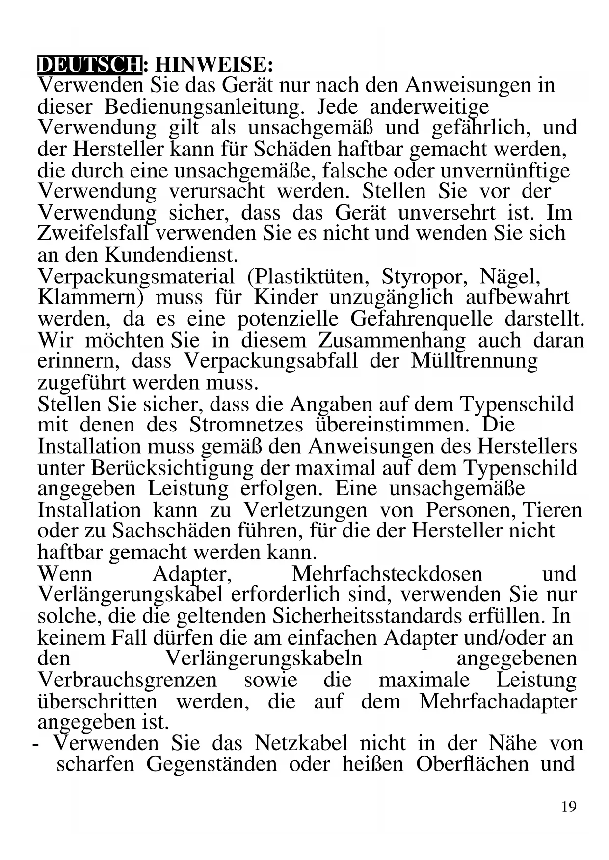 - Tronco extraíble de acero inox.19 DEUTSCH: HINWEISE: Verwenden Sie das Gerät nur nach den Anweisungen in dieser Bedienungsanleitung. Jede anderweitige Verwendung gilt als unsachgemäß und gefährlich, und der Hersteller kann für Schäden haftbar gemacht werden, die durch eine unsachgemäße, falsche oder unvernünftige Verwendung verursacht werden. Stellen Sie vor der Verwendung sicher, dass das Gerät unversehrt ist. Im Zweifelsfall verwenden Sie es nicht und wenden Sie sich an den Kundendienst. Verpackungsmaterial (Plastiktüten, Styropor, Nägel, Klammern) muss für Kinder unzugänglich aufbewahrt werden, da es eine potenzielle Gefahrenquelle darstellt. Wir möchten Sie in diesem Zusammenhang auch daran erinnern, dass Verpackungsabfall der Mülltrennung zugeführt werden muss. Stellen Sie sicher, dass die Angaben auf dem Typenschild mit denen des Stromnetzes übereinstimmen. Die Installation muss gemäß den Anweisungen des Herstellers unter Berücksichtigung der maximal auf dem Typenschild angegeben Leistung erfolgen. Eine unsachgemäße Installation kann zu Verletzungen von Personen, Tieren oder zu Sachschäden führen, für die der Hersteller nicht haftbar gemacht werden kann. Wenn Adapter, Mehrfachsteckdosen und Verlängerungskabel erforderlich sind, verwenden Sie nur solche, die die geltenden Sicherheitsstandards erfüllen. In keinem Fall dürfen die am einfachen Adapter und/oder an den Verlängerungskabeln angegebenen Verbrauchsgrenzen sowie die maximale Leistung überschritten werden, die auf dem Mehrfachadapter angegeben ist. - Verwenden Sie das Netzkabel nicht in der Nähe von scharfen Gegenständen oder heißen Oberflächen und20 ziehen Sie den Netzstecker nicht am Netzkabel aus der Steckdose. Lassen Sie es nicht von der Arbeitsplatte baumeln, wo ein Kind es halten könnte. Verwenden Sie das Gerät im Falle von Schäden am Netzkabel, Stecker oder im Falle von Kurzschlüssen nicht und lassen Sie es in einer Vertragswerkstatt reparieren. - Setzen Sie das Gerät keinen ungünstigen Wetterbedingungen, wie z. B. Regen, Feuchtigkeit, Frost, aus und bewahren Sie es an einem trockenen Ort auf. Fassen Sie das Gerät nicht mit nassen Händen an und verwenden Sie es nicht barfuß. - Dieses Gerät kann nicht von Kindern verwendet werden, auch wenn diese älter als 8 Jahre sind. - Dieses Gerät kann von Personen mit eingeschränkten körperlichen, sensorischen oder geistigen Fähigkeiten oder mangelnder Erfahrung und Kenntnissen verwendet werden, wenn sie in sicherer Weise beaufsichtigt oder instruiert wurden, wie das Gerät verwendet werden kann, und die damit verbundenen Gefahren verstehen. - Kinder dürfen nicht mit dem Gerät spielen. - Bewahren Sie das Gerät und sein Netzanschluss außerhalb der Reichweite von Kinder unter 8 Jahren. Wenn das Netzkabel beschädigt ist oder wenn ein Fehler vorliegt, darf das Gerät nicht manipuliert werden. Jede Reparatur muss vom Hersteller oder seinem technischen Kundendienst oder in jedem Fall von einer Person mit ähnlicher Qualifikation durchgeführt werden, um jegliches Risiko zu vermeiden. Die Nichtbeachtung der vorstehenden Bestimmungen kann die Sicherheit des Geräts beeinträchtigen und die Garantiebedingungen ungültig machen. Dieses Gerät ist nur für den Hausgebrauch oder gleichwertiges bestimmt, in Situationen wie bspw.: Kantinen in kleinen Firmen oder ähnliche21 Arbeitsumgebungen, von Kunden in Hotels, Motels oder andere Art von touristische Unterkunft, wie ländlicher oder Wohn –Tourismus. Das Gerät darf nicht mit einer Zeitschaltuhr oder mit einem separaten Fernwirksystem betrieben werden Führen Sie vor jedem Gebrauch das Netzkabel aus. Setzen Sie das Produkt keinen Stößen aus, es könnte beschädigt werden. Verwenden Sie nur originale und kompatible Teile und Zubehör. Halten Sie das Gerät fern von brennbaren Materialien, Wärmequellen, Dampf-und kalte Zonen. ANWEISUNGEN Die Mixerklingen sind sehr scharf: achten Sie darauf, während der Reinigung und Entfernung der Zubereitungen sich nicht zu schneiden. Beim ersten Gebrauch des Geräts, waschen Sie mit Sorgfältigkeit die Teile die in Berührung mit den Lebensmittel kommen: Fuß, Zubehör und Messer/Klingen Um die Motorüberhitzung zu vermeiden, das Gerät nicht mehr als 1 Minute ununterbrochen verwenden; in diesem Fall, ein Zwischenraum von mindestens 5 Minuten Ruhe lassen. Das Gerät im Trockenlauf nicht verwenden. Das Gerät niemals während noch verpackt verwenden. Ziehen Sie den Netzstecker von der Steckdose heraus, bevor Sie die Klingen berühren, sei es zum Reinigen oder Nahrung die sich Docht befindet zu entfernen. Ziehen Sie den Stecker von der Steckdose nach der Verwendung und/oder bevor Sie die Klingen berühren, und/oder bevor den Einbauen und abmontieren von irgendeinem Zubehör. Für die Reinigung des Mix Fußes, empfehlen wir die Verwendung von lauwarmes Wasser, mit einem begrenzten Einsatz von Reinigungsmittel, in diesem Fall,22 gründlich mit Wasser ausspülen. Tauchen sie den oberenteil des Mixers niemals in Wasser oder andere Flüssigkeiten; zum Reinigen ein feuchtes Tuch benutzen. BESCHREIBUNG G20088