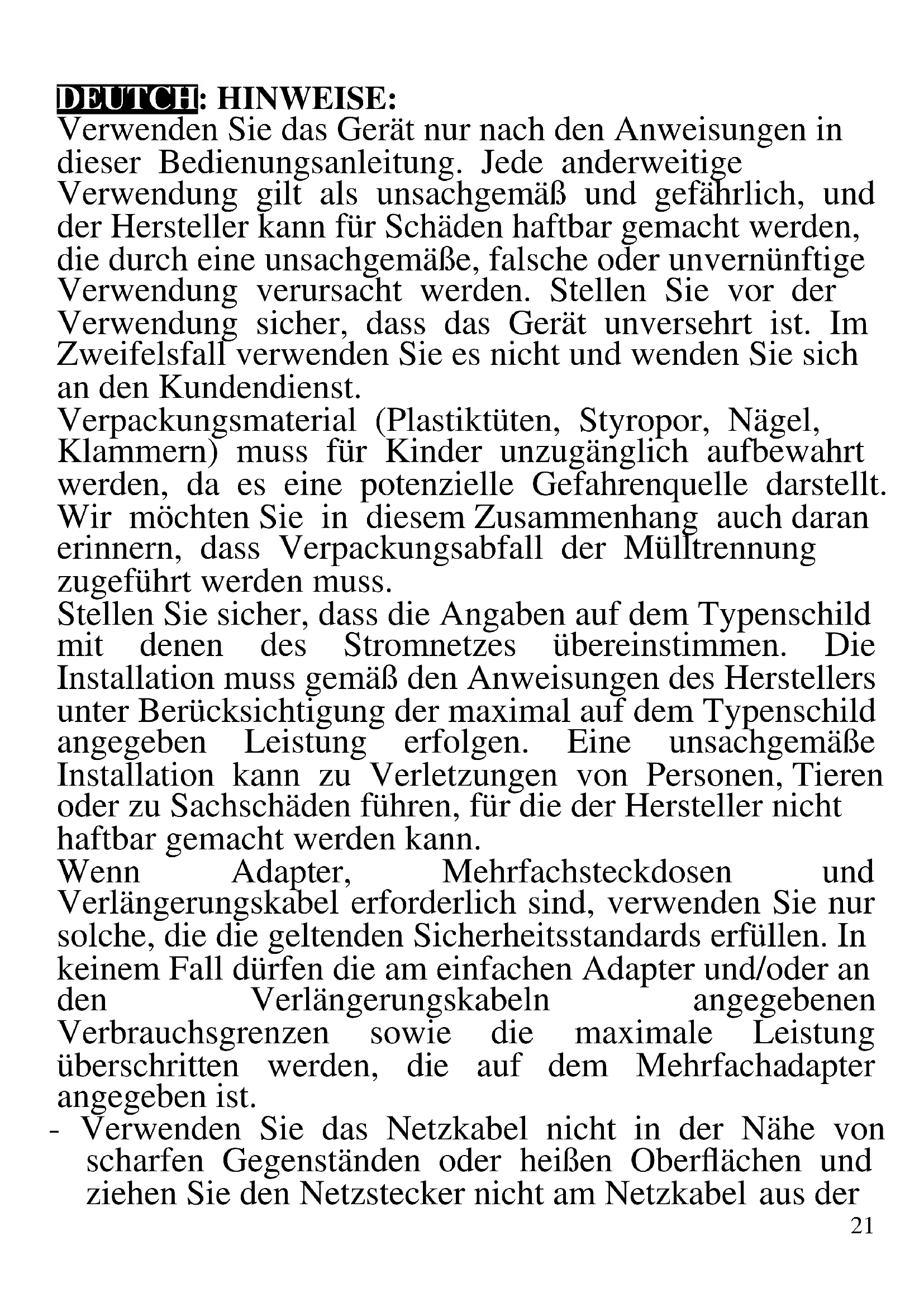 - Montage sur le mur. Poignée pour se faire transporter21 DEUTCH: HINWEISE: Verwenden Sie das Gerät nur nach den Anweisungen in dieser Bedienungsanleitung. Jede anderweitige Verwendung gilt als unsachgemäß und gefährlich, und der Hersteller kann für Schäden haftbar gemacht werden, die durch eine unsachgemäße, falsche oder unvernünftige Verwendung verursacht werden. Stellen Sie vor der Verwendung sicher, dass das Gerät unversehrt ist. Im Zweifelsfall verwenden Sie es nicht und wenden Sie sich an den Kundendienst. Verpackungsmaterial (Plastiktüten, Styropor, Nägel, Klammern) muss für Kinder unzugänglich aufbewahrt werden, da es eine potenzielle Gefahrenquelle darstellt. Wir möchten Sie in diesem Zusammenhang auch daran erinnern, dass Verpackungsabfall der Mülltrennung zugeführt werden muss. Stellen Sie sicher, dass die Angaben auf dem Typenschild mit denen des Stromnetzes übereinstimmen. Die Installation muss gemäß den Anweisungen des Herstellers unter Berücksichtigung der maximal auf dem Typenschild angegeben Leistung erfolgen. Eine unsachgemäße Installation kann zu Verletzungen von Personen, Tieren oder zu Sachschäden führen, für die der Hersteller nicht haftbar gemacht werden kann. Wenn Adapter, Mehrfachsteckdosen und Verlängerungskabel erforderlich sind, verwenden Sie nur solche, die die geltenden Sicherheitsstandards erfüllen. In keinem Fall dürfen die am einfachen Adapter und/oder an den Verlängerungskabeln angegebenen Verbrauchsgrenzen sowie die maximale Leistung überschritten werden, die auf dem Mehrfachadapter angegeben ist. - Verwenden Sie das Netzkabel nicht in der Nähe von scharfen Gegenständen oder heißen Oberflächen und ziehen Sie den Netzstecker nicht am Netzkabel aus der22 Steckdose. Lassen Sie es nicht von der Arbeitsplatte baumeln, wo ein Kind es halten könnte. Verwenden Sie das Gerät im Falle von Schäden am Netzkabel, Stecker oder im Falle von Kurzschlüssen nicht und lassen Sie es in einer Vertragswerkstatt reparieren. - Setzen Sie das Gerät keinen ungünstigen Wetterbedingungen, wie z. B. Regen, Feuchtigkeit, Frost, aus und bewahren Sie es an einem trockenen Ort auf. Fassen Sie das Gerät nicht mit nassen Händen an und verwenden Sie es nicht barfuß. - Dieses Gerät kann von Kindern ab 8 Jahren und von Personen mit eingeschränkten körperlichen, sensorischen oder geistigen Fähigkeiten oder mangelnder Erfahrung und Kenntnissen verwendet werden, wenn sie beaufsichtigt oder instruiert wurden, um das Gerät sicher zu verwenden und die damit verbundenen Gefahren zu verstehen. Kinder dürfen nicht mit dem Gerät spielen. Reinigung und Benutzerwartung dürfen nicht von Kindern ohne Aufsicht durchgeführt werden. - Kinder dürfen nicht mit dem Gerät spielen. - Bewahren Sie das Gerät und sein Netzanschluss außerhalb der Reichweite von Kinder unter 8 Jahren. Wenn das Netzkabel beschädigt ist oder wenn ein Fehler vorliegt, darf das Gerät nicht manipuliert werden. Jede Reparatur muss vom Hersteller oder seinem technischen Kundendienst oder in jedem Fall von einer Person mit ähnlicher Qualifikation durchgeführt werden, um jegliches Risiko zu vermeiden. Die Nichtbeachtung der vorstehenden Bestimmungen kann die Sicherheit des Geräts beeinträchtigen und die Garantiebedingungen ungültig machen. Dieses Gerät ist nur für den Hausgebrauch oder gleichwertiges bestimmt, in Situationen wie bspw.:23 Kantinen in kleinen Firmen oder ähnliche Arbeitsumgebungen, von Kunden in Hotels, Motels oder andere Art von touristische Unterkunft, wie ländlicher oder Wohn –Tourismus. Das Gerät darf nicht mit einer Zeitschaltuhr oder mit einem separaten Fernwirksystem betrieben werden Führen Sie vor jedem Gebrauch das Netzkabel aus. Setzen Sie das Produkt keinen Stößen aus, es könnte beschädigt werden. Verwenden Sie nur originale und kompatible Teile und Zubehör. ALLGEMEINE HINWEISE Führen Sie eine vollständige Installation nach den Anweisungen “INSTALLATION". - Schließen Sie nicht den Kabel an, wenn die Installation abgeschlossen ist. - Lassen Sie das Gerät nicht ohne Aufsicht, während es verwendet wird. Nach jeder Verwendung abschalten. - Um den Stecker zu entfernen, ziehen Sie nicht am Netzkabel. - Tauchen Sie niemals das Produkt in Wasser oder andere Flüssigkeiten und verhindern Sie das Wasserspritzen es erreichen. Gerät keine Schocks aussetzen, die beschädigen können. - Verwenden Sie nur zugelassenen Ersatzteile, Zubehör und Kompatibel. - Vor der Reinigung muss der Ventilator ausgeschaltet werden und ziehen Sie den Stecker aus der Steckdose. Führen Sie nichts in die Schutzgitter. - In keiner Weise die Schutzgitter behindern. - Stellen Sie den Ventilator auf eine rutschfeste und stabile Oberfläche und nicht in der Nähe von Fenstern . Der Gebläsemotor kann funktionieren, auch wenn die Schutzgitter noch nicht montiert und fixiert sind. Zum internen Gebrauch. G5V006 1 Vorderes Schutzgitter 2 Ventilator 3 Drehzahlregler 4 Griff 5 Welle schwenkbar 180º 6 Hinteres Schutzgitter 7 Basis 8 Montagelöcher INSTALLATION Wenn Sie den Ventilator auf dem Boden benutzen, Sie müssen nur passen den Fuß an der Basis des Lüfters. Für die Wandmontage: - Positionieren Sie den Ventilator auf einer Höhe Kinder nicht erreichen können. - Der Ventilator muss bei einem mindestabstand von 20 cm von der Decke oder den Seitwänden positioniert werden. - Stellen Sie nicht auf Oberflächen die vibrieren - Die Basis (8) soll senkrecht an der Wand montiert werden, die neigung wird dann festgelegt dank die Fähigkeit den Stift zu neigen. (5). - Kaufen Sie zwei Schrauben # 08:02 und geeigneten Dübeln für die Größe der Schrauben und Wandmaterial (Ziegel, Beton, Holz, usw, darauf abzielt die Einheit sicherzustellen. - Nehmen Sie die Basis, (8) an der Wand befestigen. Markieren Sie die Position der Löcher an der Wand.24 - Bochen Sie ein Loch in der Wand in der höhe wo Sie die Platten festlegen wollen und die Bohrungen Stopfen. - Ziehen Sie die Schraube