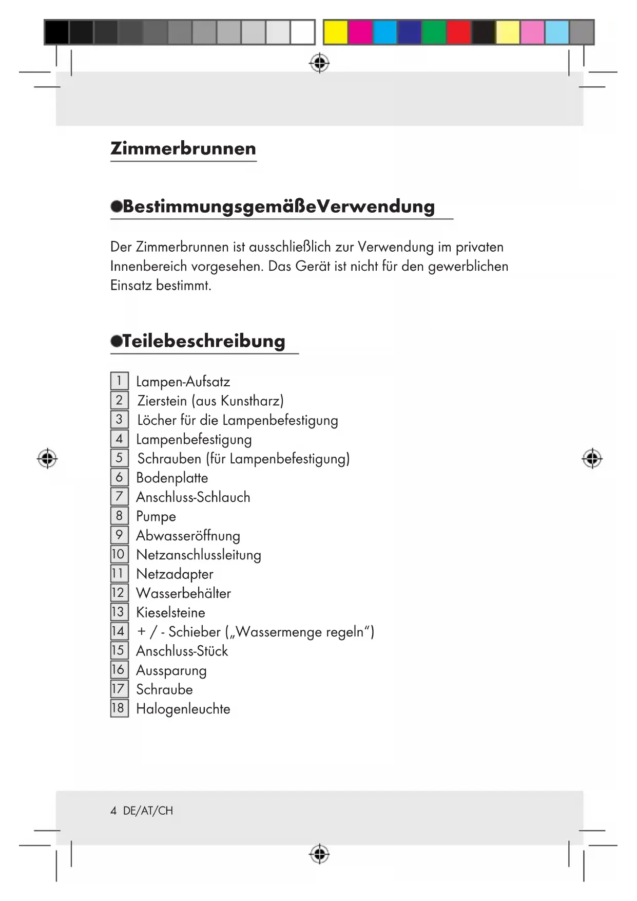 Zimmerbrunnen Montage-, Bedienungs- und Sicherheitshinweise Fontaine d‘intérieur Instructions de montage, d‘utilisation et consignes de sécurité Fontanella da interni con illuminaZione Istruzioni di montaggio, d’uso e di sicurezza Kamer wa terv al Montage-, bedienings- en veiligheidsinstructies Z31300 Z30094DDE / AT / CH Montage-, Bedienungs- und Sicherheitshinweise Seite 3 FR / CH Instructions de montage, d‘utilisation et consignes de sécurité Page 13 IT / CH Istruzioni di montaggio, d’uso e di sicurezza Pagina 23 NL Montage-, bedienings- en veiligheidsinstructies Pagina 333 DE/AT/CH Bestimmungsgemäße Verwendung ..............Seite 4 Teilebeschreibung ..............................................................Seite 4 Technische Daten .................................................................Seite 5 Sicherheitshinweise .........................................................Seite 5 Vor der Inbetriebnahme .............................................Seite 8 Inbetriebnahme / Gebrauch Montage ...........................................................................................Seite 9 Zimmerbrunnen ein- / ausschalten ..............................................Seite 9 Wasser wechseln ............................................................................Seite 10 Leuchtmittel austauschen ...............................................................Seite 11 Wartung / Reinigung / Pflege.................................Seite 11 Entsorgung .................................................................................Seite 124 DE/AT/CH Zimmerbrunnen Bestimmungsgemäße Verwendung Der Zimmerbrunnen ist ausschließlich zur Verwendung im privaten Innenbereich vorgesehen. Das Gerät ist nicht für den gewerblichen Einsatz bestimmt. Teilebeschreibung
