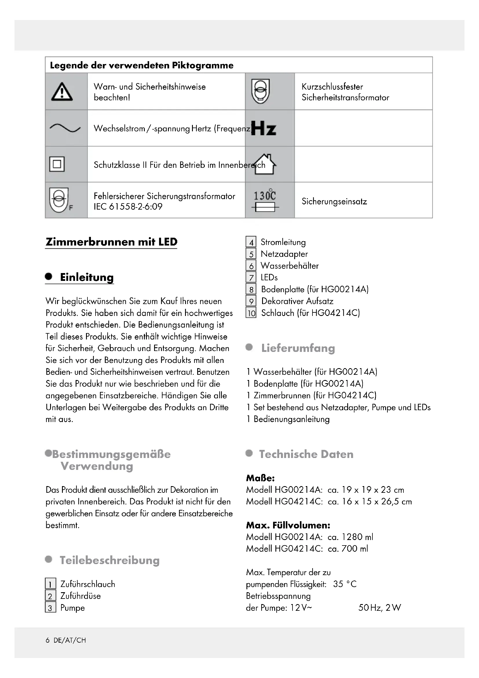 Schlauch (für HG04214C) Lieferumfang 1 Wasserbehälter (für HG00214A) 1 Bodenplatte (für HG00214A) 1 Zimmerbrunnen (für HG04214C) 1 Set bestehend aus Netzadapter, Pumpe und LEDs 1 Bedienungsanleitung Technische Daten Maße: Modell HG00214A: ca. 19 x 19 x 23 cm Modell HG04214C: ca. 16 x 15 x 26,5 cm Max. Füllvolumen: Modell HG00214A: ca. 1280 ml Modell HG04214C: ca. 700 ml Max. Temperatur der zu pumpenden Flüssigkeit: 35 °C Betriebsspannung der Pumpe: 12 V∼ 50 Hz, 2 W7 DE/AT/CH IP-Klasse der Pumpe: IPX8 Leuchtmittel: 4 x LEDs, 0,06 W, LEDs können nicht ausge- tauscht werden. Eingangsspannung Netzadapter: 230–240 V∼, 50 Hz Ausgangsspannung Netzadapter: 12 V∼ 250 mA Schutzklasse: II / IP-Klasse des Netzadapters: IP20 Der Netzadapter (Modell-Nr. MAI-1200250) ist GS-zertifiziert. Sicherheitshinweise BEDIENUNGSANLEITUNG SORGFÄLTIG AUFBEWAHREN!