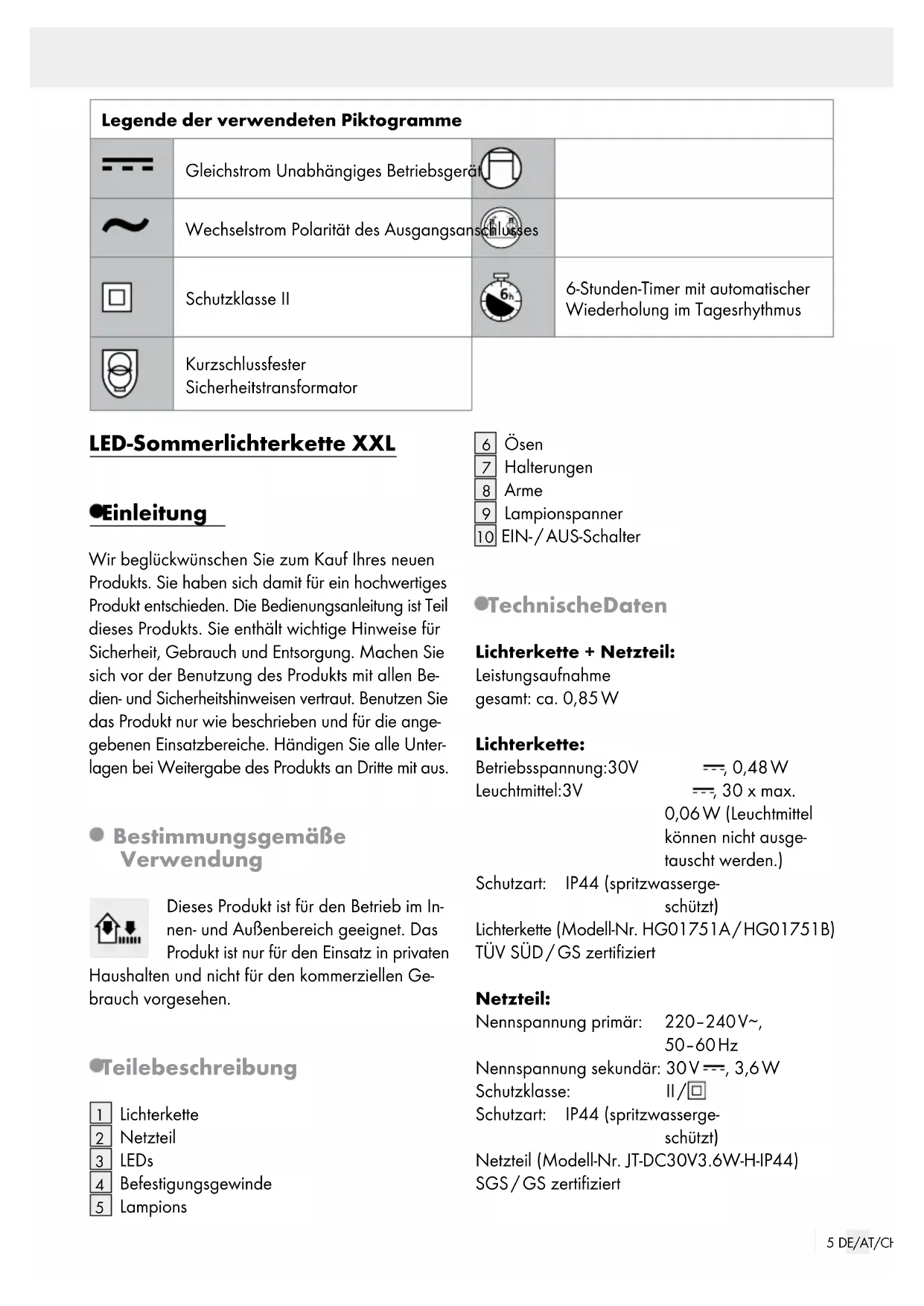 EIN- / AUS-Schalter Technische Daten Lichterkette + Netzteil: Leistungsaufnahme gesamt: ca. 0,85 W Lichterkette: Betriebsspannung: 30 V , 0,48 W Leuchtmittel: 3 V , 30 x max. 0,06 W (Leuchtmittel können nicht ausge- tauscht werden.) Schutzart: IP44 (spritzwasserge- schützt) Lichterkette (Modell-Nr. HG01751A / HG01751B) TÜV SÜD / GS zertifiziert Netzteil: Nennspannung primär: 220–240 V∼, 50–60 Hz Nennspannung sekundär: 30 V , 3,6 W Schutzklasse: II / Schutzart: IP44 (spritzwasserge- schützt) Netzteil (Modell-Nr. JT-DC30V3.6W-H-IP44) SGS / GS zertifiziert6 DE/AT/CH Lieferumfang 1 LED-Sommerlichterkette XXL 15 Laternen 1 Netzteil 1 Bedienungsanleitung Sicherheitshinweise