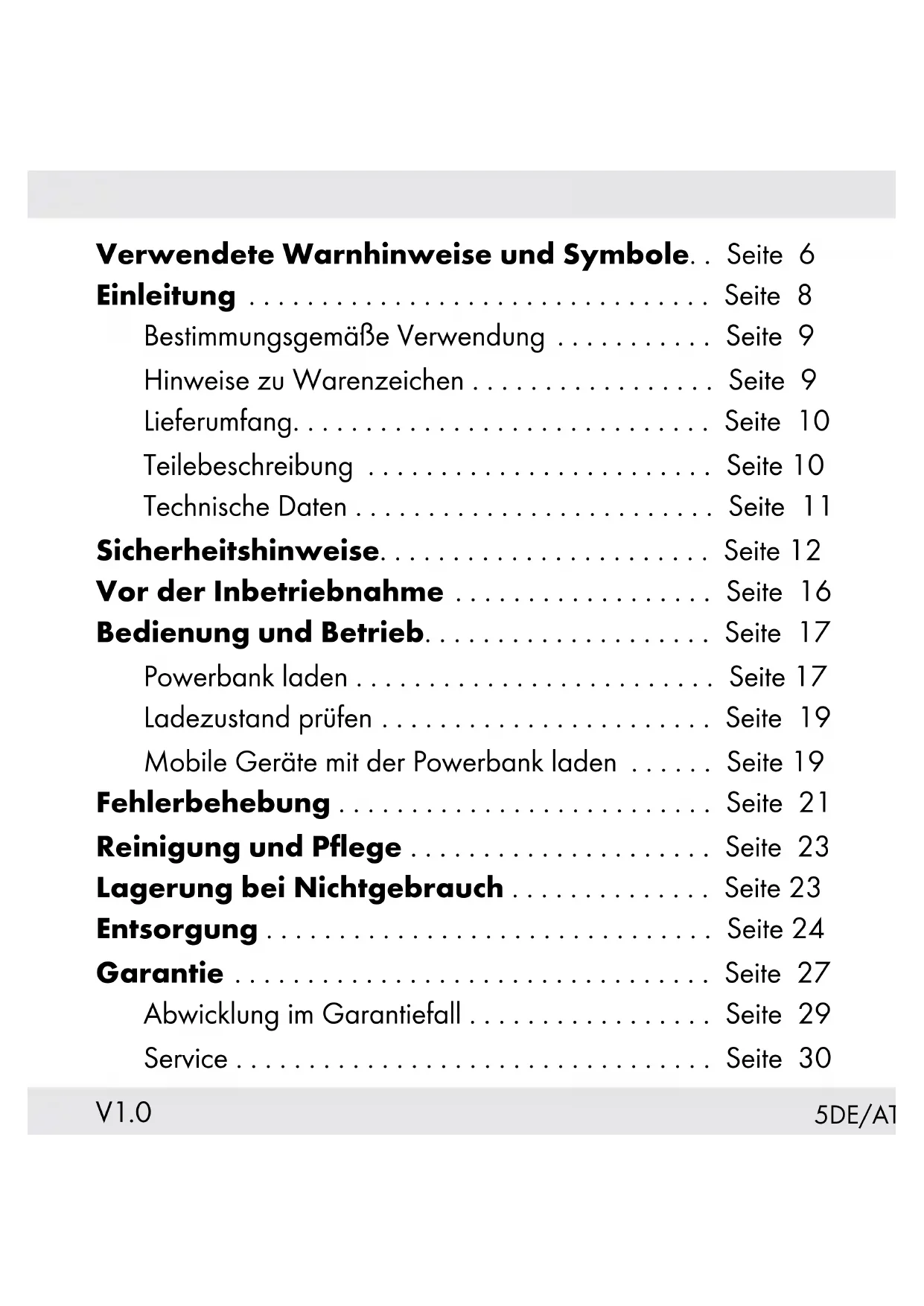 45DE/AT/CH Verwendete Warnhinweise und Symbole.. Seite 6 Einleitung ................................ Seite 8 Bestimmungsgemäße Verwendung ........... Seite 9 Hinweise zu Warenzeichen ................. Seite 9 Lieferumfang............................. Seite 10 Teilebeschreibung ........................ Seite 10 Technische Daten ......................... Seite 11 Sicherheitshinweise....................... Seite 12 Vor der Inbetriebnahme .................. Seite 16 Bedienung und Betrieb.................... Seite 17 Powerbank laden ......................... Seite 17 Ladezustand prüfen ....................... Seite 19 Mobile Geräte mit der Powerbank laden ...... Seite 19 Fehlerbehebung .......................... Seite 21 Reinigung und Pflege ..................... Seite 23 Lagerung bei Nichtgebrauch .............. Seite 23 Entsorgung ............................... Seite 24 Garantie ................................. Seite 27 Abwicklung im Garantiefall ................. Seite 29 Service ................................. Seite 30 V1.06 DE/AT/CH Verwendete Warnhinweise und Symbole In der Bedienungsanleitung, auf der Verpackung sowie auf dem Produkt werden folgende Symbole und Warnhinweise verwendet: GEFAHR! Dieses Symbol mit dem Signalwort „GEFAHR“ bezeichnet eine Gefährdung mit einem hohen Risikograd, die, wenn sie nicht vermieden wird, eine schwere Verletzung oder den Tod zur Folge hat. WARNUNG! Dieses Symbol mit dem Signalwort „WARNUNG“ bezeichnet eine Gefährdung mit einem mittleren Risikograd, die, wenn sie nicht vermieden wird, eine schwere Verletzung oder den Tod zur Folge haben kann. VORSICHT! Dieses Symbol mit dem Signalwort „VORSICHT“ bezeichnet eine Gefährdung mit einem niedrigen Risikograd, die, wenn sie nicht vermieden wird, eine geringe oder mäßige Verletzung zur Folge haben kann.7DE/AT/CH ACHTUNG! Dieses Symbol weist in Kombination mit dem Signalwort „ACHTUNG“ auf einen möglichen Sachschaden hin. HINWEIS: Dieses Symbol mit dem Signalwort „HINWEIS“ bietet weitere nützliche Informationen. WARNUNG! EXPLOSIONSGEFAHR! Eine Warnung, welche mit diesem Zeichen und den Worten „WARNUNG! EXPLOSIONSGEFAHR!“ versehen ist, weist auf eine mogliche Explosionsgefahr hin. Wird ein solcher Warnhinweis nicht befolgt, kann das ernsthafte Verletzungen nach sich ziehen oder tödlich enden und möglichen Sachschaden nach sich ziehen. Folgen Sie den Anweisungen dieser Warnung, um Lebensgefahr, schwerwiegende Verletzungen oder Sachschäden zu vermeiden!8 DE/AT/CH Dieses Symbol bedeutet, dass vor der Verwendung des Produkts die Bedienungsanleitung beachtet werden muss. Gleichstrom / -spannung Das CE-Zeichen bestätigt Konformität mit den für das Produkt zutreffenden EU-Richtlinien. Sicherheitshinweise Handlungsanweisungen POWERBANK Einleitung Wir beglückwünschen Sie zum Kauf Ihres neuen Produkts. Sie haben sich damit für ein hochwertiges Produkt entschieden. Die Bedienungsanleitung ist Teil dieses Produkts. Sie enthält wichtige Hinweise für Sicherheit, Gebrauch und Entsorgung. Machen Sie sich vor der Benutzung des Produkts mit allen Bedien- und Sicherheitshinweisen vertraut. Benutzen Sie das Produkt nur wie beschrieben und für die angegebenen9DE/AT/CH Einsatzbereiche. Händigen Sie alle Unterlagen bei Weitergabe des Produkts an Dritte mit aus. Bestimmungsgemäße Verwendung Diese POWERBANK (nachfolgend als „Produkt“ genannt) ist ein Gerät der Informationstechnologie, das zum Aufladen von Mobilgeräten, die normalerweise über einen USB-Anschluss aufgeladen werden, vorgesehen ist. Das Produkt ist nicht für den gewerblichen Einsatz bestimmt. Für Schäden aufgrund nicht bestimmungsgemäßer Verwendung übernimmt der Hersteller keine Haftung. Hinweise zu Warenzeichen – USB