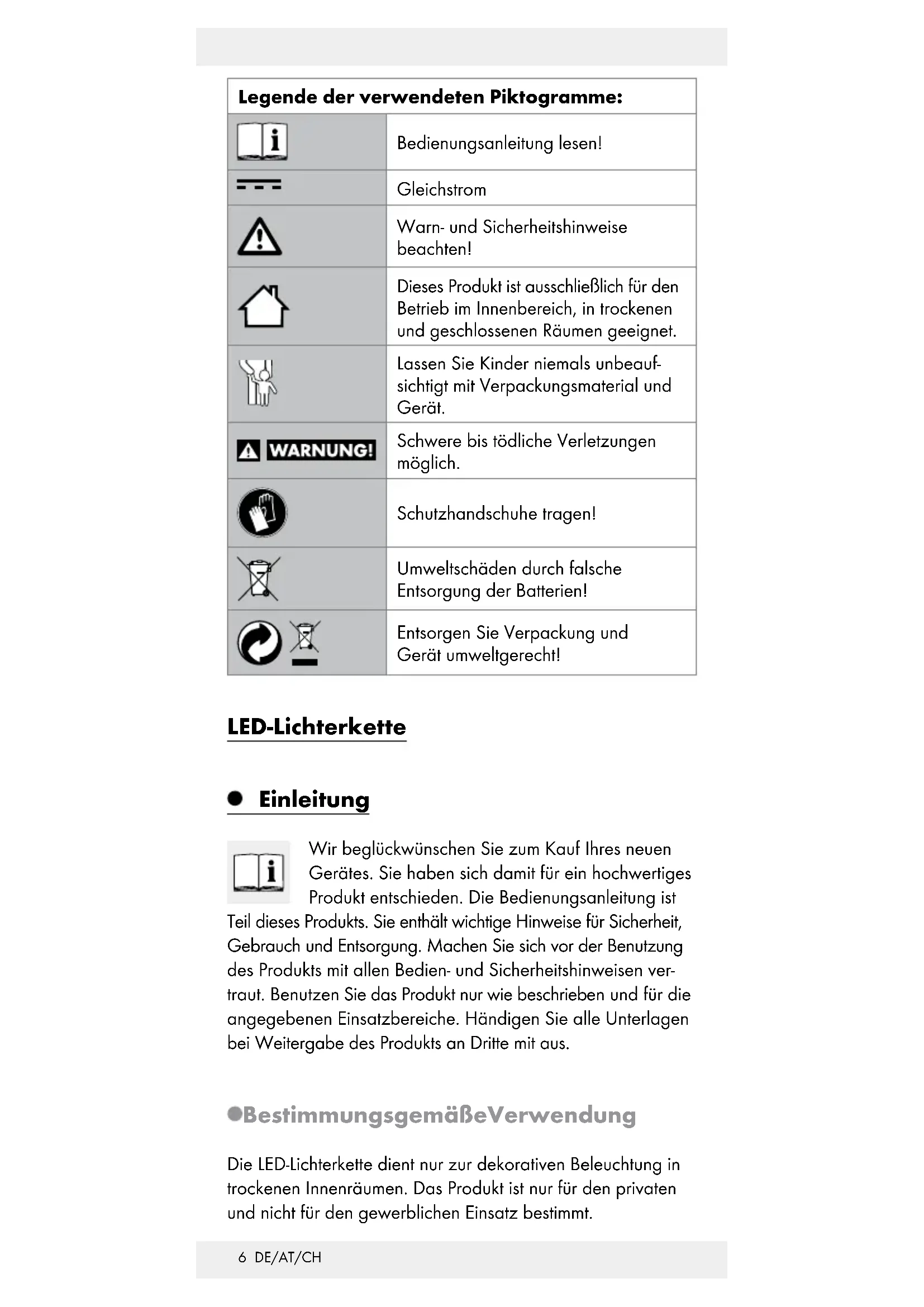10322A /C5 DE/AT/CH Legende der verwendeten Piktogramme ..................................................... Seite 6 Einleitung ............................................................... Seite 6 Bestimmungsgemäße Verwendung .......................... Seite 6 Teilebeschreibung ..................................................... Seite 7 Technische Daten ...................................................... Seite 7 Lieferumfang .............................................................. Seite 7 Sicherheitshinweise ...................................... Seite 7 Inbetriebnahme ............................................... Seite 9 Batterien einlegen / wechseln ................................... Seite 9 Ein- und ausschalten .................................................. Seite 9 Reinigung und Pflege .................................. Seite 9 Entsorgung ........................................................... Seite 9 Garantie und Service .................................. Seite 10 Serviceadresse .......................................................... Seite 10 Hersteller .................................................................... Seite 116 DE/AT/CH Legende der verwendeten Piktogramme: Bedienungsanleitung lesen! Gleichstrom Warn- und Sicherheitshinweise beachten! Dieses Produkt ist ausschließlich für den Betrieb im Innenbereich, in trockenen und geschlossenen Räumen geeignet. Lassen Sie Kinder niemals unbeauf- sichtigt mit Verpackungsmaterial und Gerät. Schwere bis tödliche Verletzungen möglich. Schutzhandschuhe tragen! Umweltschäden durch falsche Entsorgung der Batterien! Entsorgen Sie Verpackung und Gerät umweltgerecht! LED-Lichterkette Einleitung Wir beglückwünschen Sie zum Kauf Ihres neuen Gerätes. Sie haben sich damit für ein hochwertiges Produkt entschieden. Die Bedienungsanleitung ist Teil dieses Produkts. Sie enthält wichtige Hinweise für Sicherheit, Gebrauch und Entsorgung. Machen Sie sich vor der Benutzung des Produkts mit allen Bedien- und Sicherheitshinweisen ver- traut. Benutzen Sie das Produkt nur wie beschrieb en und für die angegebenen Einsatzbereiche. Händigen Sie alle Unterlagen bei Weitergabe des Produkts an Dritte mit aus. Bestimmungsgemäße Verwendung Die LED-Lichterkette dient nur zur dekorativen Beleuchtung in trockenen Innenräumen. Das Produkt ist nur für den privaten und nicht für den gewerblichen Einsatz bestimmt.7 DE/AT/CH Dieses Produkt ist ausschließlich für den Betrieb im Innenbereich, in trockenen und geschlossenen Räumen geeignet. Teilebeschreibung