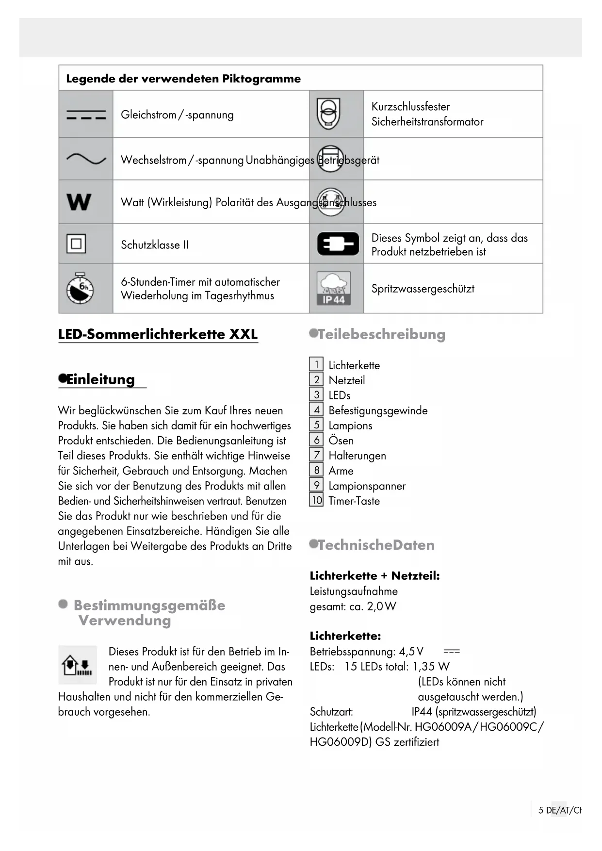 85 DE/AT/CH Legende der verwendeten Piktogramme Gleichstrom / -spannung Kurzschlussfester Sicherheitstransformator Wechselstrom / -spannung Unabhängiges Betriebsgerät Watt (Wirkleistung) Polarität des Ausgangsanschlusses Schutzklasse II Dieses Symbol zeigt an, dass das Produkt netzbetrieben ist 6-Stunden-Timer mit automatischer Wiederholung im Tagesrhythmus Spritzwassergeschützt LED-Sommerlichterkette XXL Einleitung Wir beglückwünschen Sie zum Kauf Ihres neuen Produkts. Sie haben sich damit für ein hochwertiges Produkt entschieden. Die Bedienungsanleitung ist Teil dieses Produkts. Sie enthält wichtige Hinweise für Sicherheit, Gebrauch und Entsorgung. Machen Sie sich vor der Benutzung des Produkts mit allen Bedien- und Sicherheitshinweisen vertraut. Benutzen Sie das Produkt nur wie beschrieben und für die angegebenen Einsatzbereiche. Händigen Sie alle Unterlagen bei Weitergabe des Produkts an Dritte mit aus. Bestimmungsgemäße Verwendung Dieses Produkt ist für den Betrieb im In- nen- und Außenbereich geeignet. Das Produkt ist nur für den Einsatz in privaten Haushalten und nicht für den kommerziellen Ge- brauch vorgesehen. Teilebeschreibung