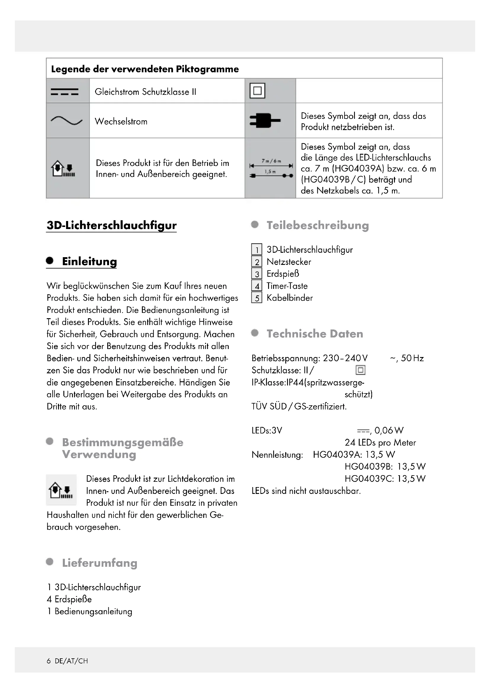 3 25 DE/AT/CH Legende der verwendeten Piktogramme ...........................................................Seite 6 Einleitung ......................................................................................................................................... Seite 6 Bestimmungsgemäße Verwendung ....................................................................................................Seite 6 Lieferumfang ........................................................................................................................................ Seite 6 Teilebeschreibung ...............................................................................................................................Seite 6 Technische Daten ................................................................................................................................Seite 6 Sicherheitshinweise ................................................................................................................Seite 7 Vor der Inbetriebnahme ....................................................................................................Seite 9 Montage ...........................................................................................................................................Seite 9 Anwendung ..................................................................................................................................Seite 9 Timer-Funktion ............................................................................................................................Seite 9 Reinigung und Pflege ............................................................................................................Seite 9 Entsorgung .....................................................................................................................................Seite 10 Garantie ........................................................................................................................................... Seite 106 DE/AT/CH Legende der verwendeten Piktogramme Gleichstrom Schutzklasse II Wechselstrom Dieses Symbol zeigt an, dass das Produkt netzbetrieben ist. Dieses Produkt ist für den Betrieb im Innen- und Außenbereich geeignet. Dieses Symbol zeigt an, dass die Länge des LED-Lichterschlauchs ca. 7 m (HG04039A) bzw. ca. 6 m (HG04039B / C) beträgt und des Netzkabels ca. 1,5 m. 3D-Lichterschlauchfigur Einleitung Wir beglückwünschen Sie zum Kauf Ihres neuen Produkts. Sie haben sich damit für ein hochwertiges Produkt entschieden. Die Bedienungsanleitung ist Teil dieses Produkts. Sie enthält wichtige Hinweise für Sicherheit, Gebrauch und Entsorgung. Machen Sie sich vor der Benutzung des Produkts mit allen Bedien- und Sicherheitshinweisen vertraut. Benut- zen Sie das Produkt nur wie beschrieben und für die angegebenen Einsatzbereiche. Händigen Sie alle Unterlagen bei Weitergabe des Produkts an Dritte mit aus. Bestimmungsgemäße Verwendung Dieses Produkt ist zur Lichtdekoration im Innen- und Außenbereich geeignet. Das Produkt ist nur für den Einsatz in privaten Haushalten und nicht für den gewerblichen Ge- brauch vorgesehen. Lieferumfang 1 3D-Lichterschlauchfigur 4 Erdspieße 1 Bedienungsanleitung Teilebeschreibung