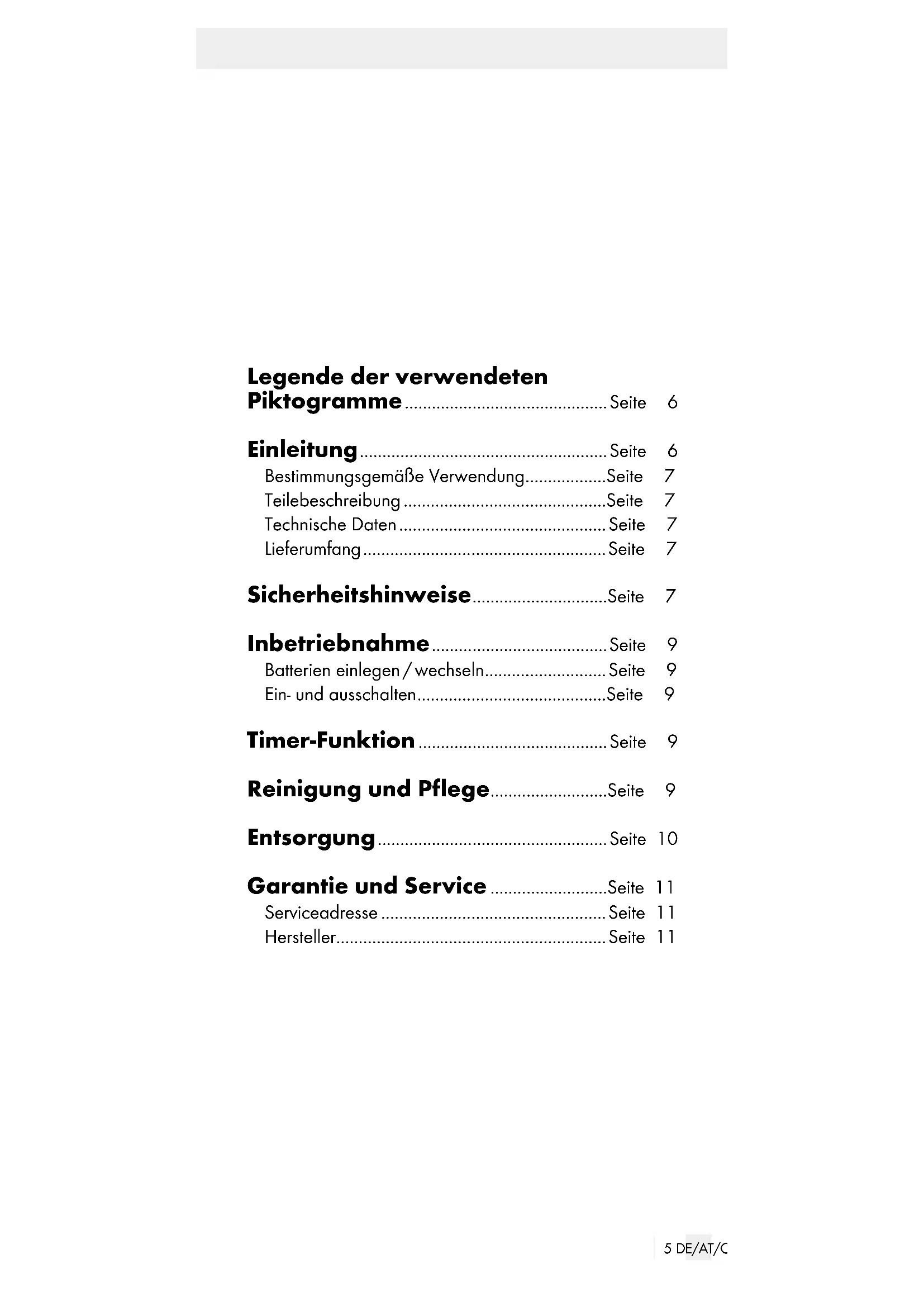 65 DE/AT/CH Legende der verwendeten Piktogramme ............................................. Seite 6 Einleitung .......................................................Seite 6 Bestimmungsgemäße Verwendung ..................Seite 7 Teilebeschreibung .............................................Seite 7 Technische Daten .............................................. Seite 7 Lieferumfang ...................................................... Seite 7 Sicherheitshinweise ..............................Seite 7 Inbetriebnahme ....................................... Seite 9 Batterien einlegen / wechseln ...........................Seite 9 Ein- und ausschalten ..........................................Seite 9 Timer-Funktion ..........................................Seite 9 Reinigung und Pflege ..........................Seite 9 Entsorgung ................................................... Seite 10 Garantie und Service ..........................Seite 11 Serviceadresse ..................................................Seite 11 Hersteller ............................................................Seite 116 DE/AT/CH Legende der verwendeten Piktogramme Bedienungsanleitung lesen! Dieses Produkt ist ausschließlich für den Betrieb im Innenbereich, in trockenen und geschlossenen Räumen geeignet. Gleichstrom Warn- und Sicherheitshinweise beachten! Lassen Sie Kinder niemals unbeaufsichtigt mit Verpackungs- material und Gerät. Schwere bis tödliche Verletzungen möglich. Schutzhandschuhe tragen! Umweltschäden durch falsche Entsorgung der Batterien!