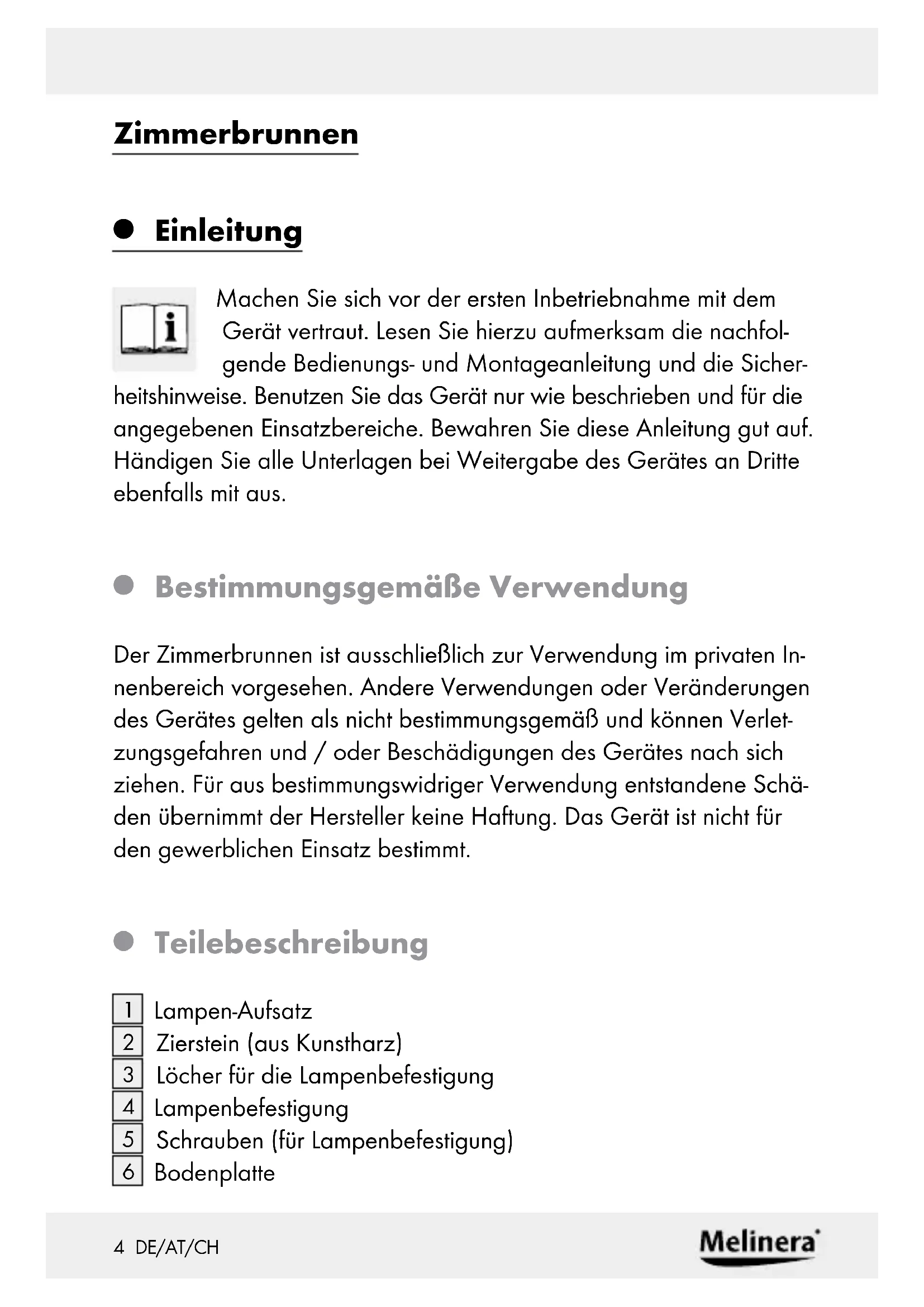 Bestimmungsgemäße Verwendung Der Zimmerbrunnen ist ausschließlich zur Verwendung im privaten In- nenbereich vorgesehen. Andere Verwendungen oder Veränderungen des Gerätes gelten als nicht bestimmungsgemäß und können Verlet- zungsgefahren und / oder Beschädigungen des Gerätes nach sich ziehen. Für aus bestimmungswidriger Verwendung entstandene Schä- den übernimmt der Hersteller keine Haftung. Das Gerät ist nicht für den gewerblichen Einsatz bestimmt.