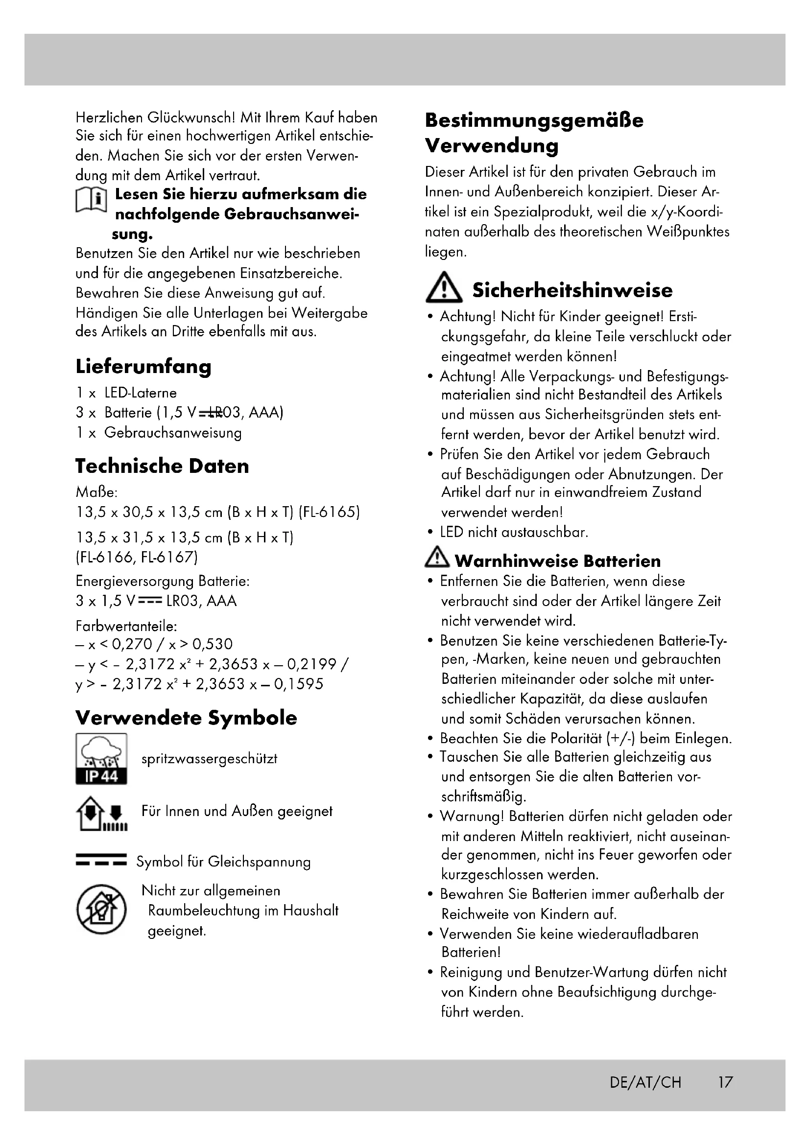 - LED nicht austauschbar. Warnhinweise Batterien