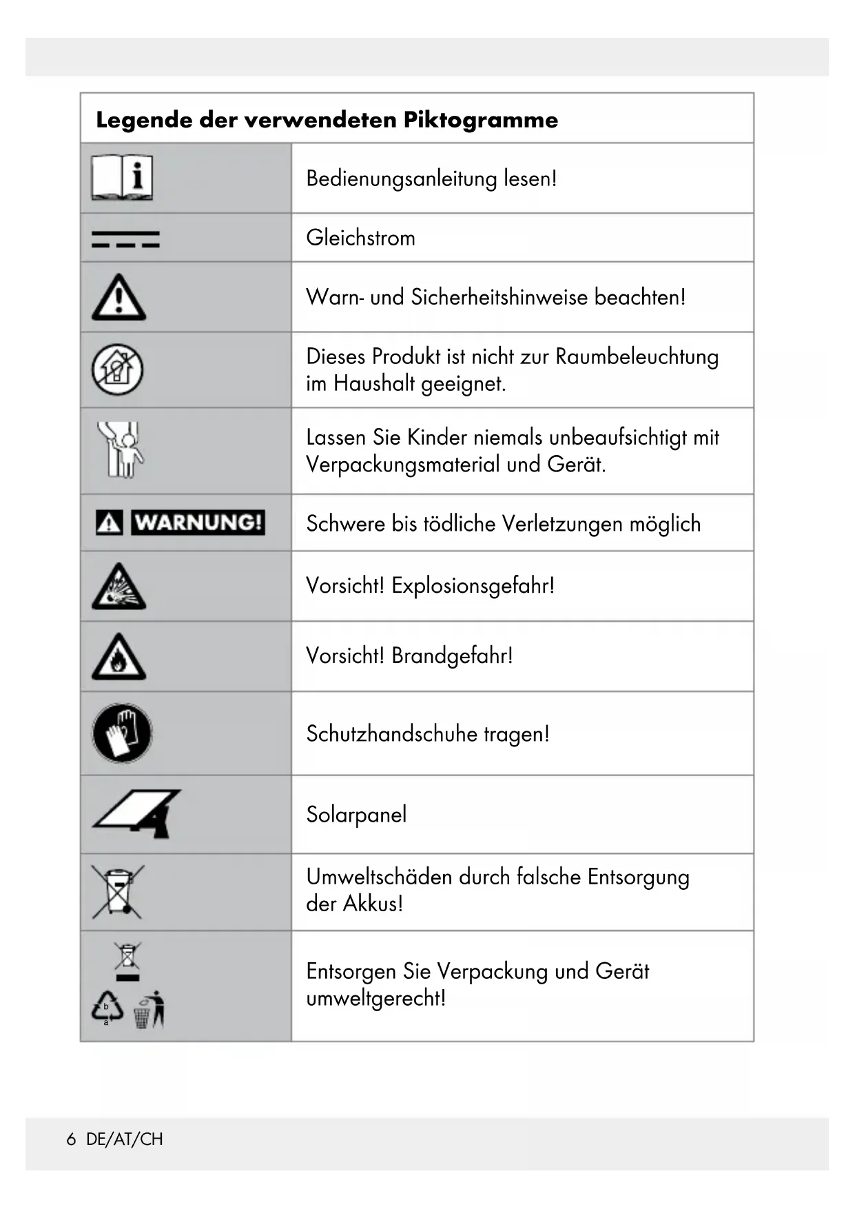 25 DE/AT/CH Legende der verwendeten Piktogramme ....................................................................... Seite 6 Einleitung ................................................................................. Seite 7 Bestimmungsge mäße Verwendung ............................................ Seite 7 Teilebeschreibung ....................................................................... Seite 7 Technische Daten ........................................................................ Seite 7 Lieferumfang ................................................................................ Seite 8 Sicherheits hinweise ........................................................ Seite 8 Produktspezifische Sicherheitshinweise ..................................... Seite 8 Sicherheitshin weise für Akkus ..................................................... Seite 9 Funktionsweise .................................................................. Seite 10 Inbetriebnahme ................................................................. Seite 10 Lichterkette montieren ................................................................. Seite 10 Lichterkette aufstellen .................................................................. Seite 11 Lichterkette ein- / ausschalten ..................................................... Seite 11 Akku austauschen ....................................................................... Seite 11 Akku aufladen ............................................................................. Seite 12 Wartung und Reinigung ............................................. Seite 12 Fehler beheben .................................................................. Seite 12 Entsorgung ............................................................................. Seite 13 Garantie und Service .................................................... Seite 14 Serviceadresse ............................................................................ Seite 15 Hersteller ...................................................................................... Seite 156 DE/AT/CH Legende der verwendeten Piktogramme Bedienungsanleitung lesen! Gleichstrom Warn- und Sicherheitshinweise beachten! Dieses Produkt ist nicht zur Raumbeleuchtung im Haushalt geeignet. Lassen Sie Kinder niemals unbeaufsichtigt mit Verpackungsmaterial und Gerät. Schwere bis tödliche Verletzungen möglich Vorsicht! Explosionsgefahr! Vorsicht! Brandgefahr! Schutzhandschuhe tragen! Solarpanel Umweltschäden durch falsche Entsorgung der Akkus!