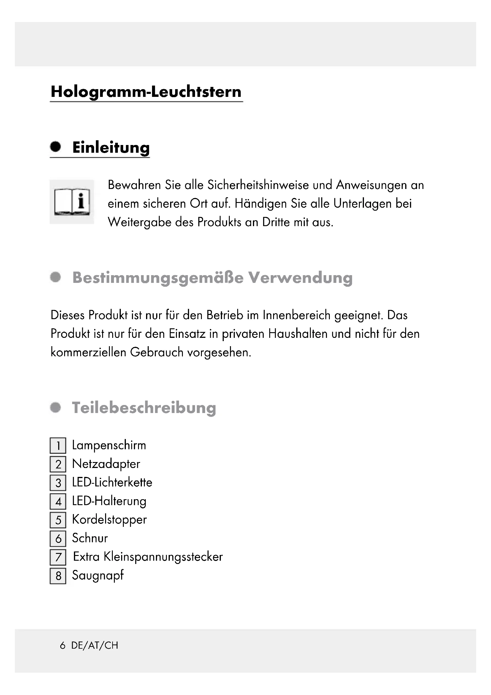 85 DE/AT/CH Einleitung Bestimmungsgemäße Verwendung ...........................................Seite 6 Teilebeschreibung ......................................................................Seite 6 Technische Daten ....................................................................... Seite 7 Lieferumfang ............................................................................... Seite 7 Sicherheitshinweise .......................................................Seite 8 Anwendung .........................................................................Seite 10 Reinigung und Pflege ...................................................Seite 10 Entsorgung ............................................................................ Seite 11 Garantie .................................................................................. Seite 116 DE/AT/CH Hologramm-Leuchtstern Einleitung Bewahren Sie alle Sicherheitshinweise und Anweisungen an einem sicheren Ort auf. Händigen Sie alle Unterlagen bei Weitergabe des Produkts an Dritte mit aus. Bestimmungsgemäße Verwendung Dieses Produkt ist nur für den Betrieb im Innenbereich geeignet. Das Produkt ist nur für den Einsatz in privaten Haushalten und nicht für den kommerziellen Gebrauch vorgesehen. Teilebeschreibung