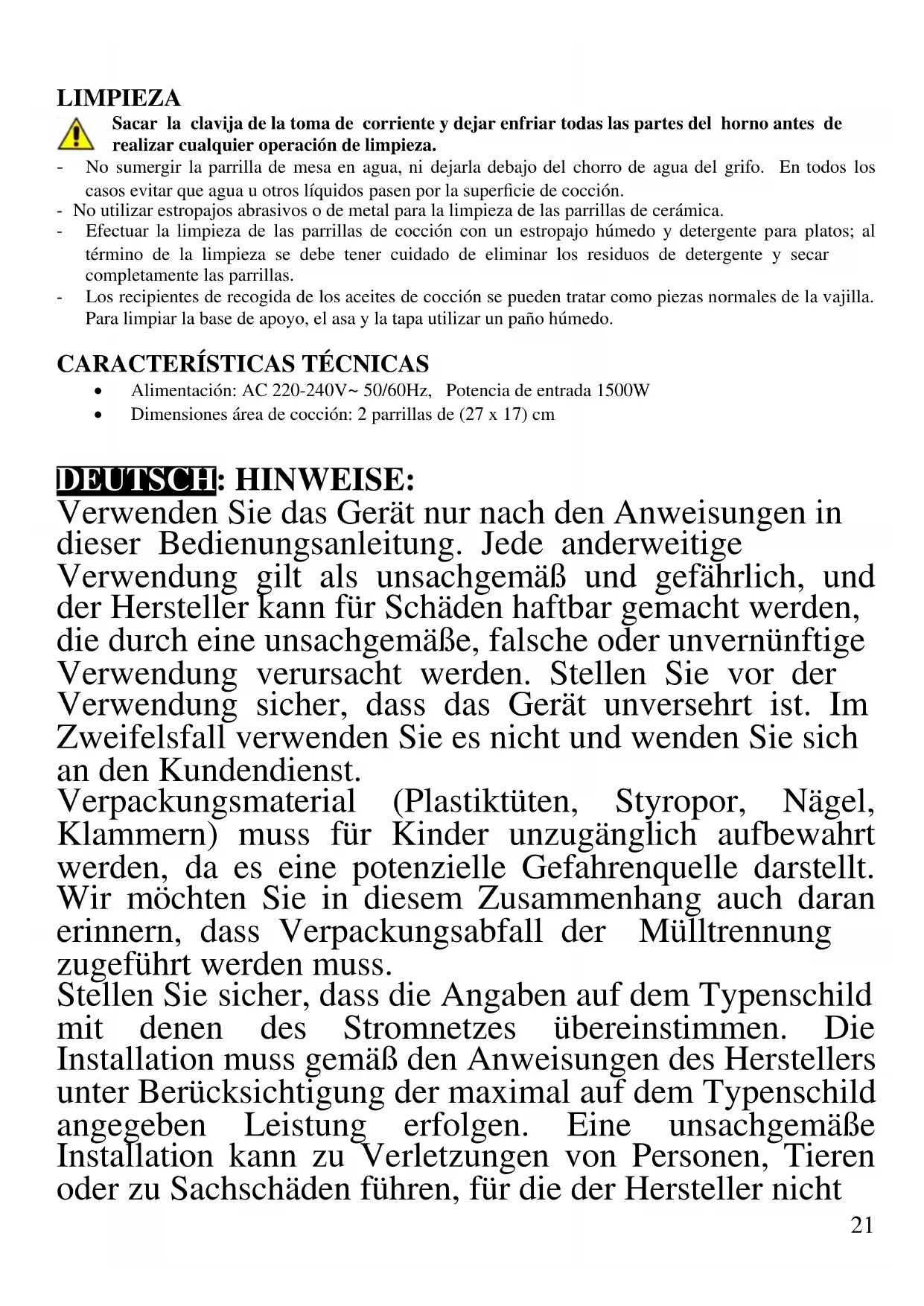 DEUTSCH: HINWEISE: Verwenden Sie das Gerät nur nach den Anweisungen in dieser Bedienungsanleitung. Jede anderweitige Verwendung gilt als unsachgemäß und gefährlich, und der Hersteller kann für Schäden haftbar gemacht werden, die durch eine unsachgemäße, falsche oder unvernünftige Verwendung verursacht werden. Stellen Sie vor der Verwendung sicher, dass das Gerät unversehrt ist. Im Zweifelsfall verwenden Sie es nicht und wenden Sie sich an den Kundendienst. Verpackungsmaterial (Plastiktüten, Styropor, Nägel, Klammern) muss für Kinder unzugänglich aufbewahrt werden, da es eine potenzielle Gefahrenquelle darstellt. Wir möchten Sie in diesem Zusammenhang auch daran erinnern, dass Verpackungsabfall der Mülltrennung zugeführt werden muss. Stellen Sie sicher, dass die Angaben auf dem Typenschild mit denen des Stromnetzes übereinstimmen. Die Installation muss gemäß den Anweisungen des Herstellers unter Berücksichtigung der maximal auf dem Typenschild angegeben Leistung erfolgen. Eine unsachgemäße Installation kann zu Verletzungen von Personen, Tieren oder zu Sachschäden führen, für die der Hersteller nicht22 haftbar gemacht werden kann. Wenn Adapter, Mehrfachsteckdosen und Verlängerungskabel erforderlich sind, verwenden Sie nur solche, die die geltenden Sicherheitsstandards erfüllen. In keinem Fall dürfen die am einfachen Adapter und/oder an den Verlängerungskabeln angegebenen Verbrauchsgrenzen sowie die maximale Leistung überschritten werden, die auf dem Mehrfachadapter angegeben ist. - Verwenden Sie das Netzkabel nicht in der Nähe von scharfen Gegenständen oder heißen Oberflächen und ziehen Sie den Netzstecker nicht am Netzkabel aus der Steckdose. Lassen Sie es nicht von der Arbeitsplatte baumeln, wo ein Kind es halten könnte. Verwenden Sie das Gerät im Falle von Schäden am Netzkabel, Stecker oder im Falle von Kurzschlüssen nicht und lassen Sie es in einer Vertragswerkstatt reparieren. - Setzen Sie das Gerät keinen ungünstigen Wetterbedingungen, wie z. B. Regen, Feuchtigkeit, Frost, aus und bewahren Sie es an einem trockenen Ort auf. Fassen Sie das Gerät nicht mit nassen Händen an und verwenden Sie es nicht barfuß. - Dieses Gerät kann von Kindern ab 8 Jahren und von Personen mit eingeschränkten körperlichen, sensorischen oder geistigen Fähigkeiten oder mangelnder Erfahrung und Kenntnissen verwendet werden, wenn sie beaufsichtigt oder instruiert wurden, um das Gerät sicher zu verwenden und die damit verbundenen Gefahren zu verstehen. Kinder dürfen nicht mit dem Gerät spielen. Reinigung und Benutzerwartung dürfen nicht von Kindern ohne Aufsicht durchgeführt werden. - Kinder dürfen nicht mit dem Gerät spielen. - Bewahren Sie das Gerät und sein Netzanschluss außerhalb der Reichweite von Kinder unter 8 Jahren. - Nicht für den gewerblichen Gebrauch bestimmt. Nur23 für den Hausgebrauch bestimmt. Im Falle eines Defekts und/oder von Fehlfunktionen das Gerät nicht öffnen. Für Reparaturen wenden Sie sich an eine vom Hersteller autorisierte Werkstatt (Vertragswerkstatt) und fordern Sie den Einsatz von Original-Ersatzteilen. Die Nichtbeachtung der obigen Vorschriften kann die Sicherheit beeinträchtigen und zur Folge haben, dass die Garantie erlischt. WARNUNG: Dieses Gerät enthält eine Heizfunktion. Oberflächen, außer die funktionellen Oberflächen können hohe Temperaturen entwickeln. Da die Temperaturen von verschiedene Personen unterschiedlich wahrgenommen werden, sollte dieses Gerät mit VORSICHT verwendet werden. Halten Sie das Gerät ausschließlich auf Griffflächen die abhalten und verwenden Sie solche Hitzeschutzmaßen wie Hitzeschutzhandschuhe oder Topflappen. Dieses Gerät ist nur für den Hausgebrauch oder gleichwertiges bestimmt, in Situationen wie bspw.: Kantinen in kleinen Firmen oder ähnliche Arbeitsumgebungen, von Kunden in Hotels, Motels oder andere Art von touristische Unterkunft, wie ländlicher oder Wohn –Tourismus. Das Gerät darf nicht mit einer Zeitschaltuhr oder mit einem separaten Fernwirksystem betrieben werden Führen Sie vor jedem Gebrauch das Netzkabel aus. Setzen Sie das Produkt keinen Stößen aus, es könnte beschädigt werden. Verwenden Sie nur originale und kompatible Teile und Zubehör. ALLGEMEINE HINWEISE Der Grill kann ein wenig Rauch freisetzen, wenn Sie das Gerät zum ersten Mal nutzen. Keine Angst, denn nach einige Verwendungen verschwindet der Rauch. Beim ersten Gebrauch reinigen Sie die Teile, die mit24 Nahrungsmitteln in Berührung kommen, das heißt, der Grillrost. Nach dem Einschalten des Gerätes, um Verbrennungen zu vermeiden, die Grillfläche nicht berühren da diese sehr heiß werden. Behandeln Sie die frisch gekochte Nahrung mit Vorsicht. Die Hände sollten nur den Griff und der Knopf berühren. Sobald Sie das Essen auf die Grillfläche legen, rühren Sie nur mit einem Grillbesteck aus Holz, achten Sie darauf die Teflon-Oberfläche nicht zu zerkratzen. Verwenden Sie das Gerät nicht während noch gepackt. Nach dem Gebrauch den Netzstecker aus der Steckdose ziehen und vor dem Reinigen, warten Sie bis alle Zubehörteile des Gerätes abgekühlt sind. Benutzen Sie für die Reinigung weiche Schwämme, vermeiden Sie Metallschwämme. Die Grillplatten können mit normalen Waschmittel gewaschen werden. Das Gerät darf auf keinen Fall in Wasser oder andere Flüssigkeiten eingetaucht werden. Vermeiden Sie, dass es von Wasserspritze erreicht wird oder von Wasserhahnstrahl. Auf jeden Fall verhindern, dass Wasser oder andere Flüssigkeiten auf die Oberfläche der Grillplatten ablaufen. Gerät keines Schocks aussetzen, die beschädigen können. Verwenden Sie nur Original-Zubehör. Unterstützen Sie den Grill auf eine ebene und stabile Oberfläche. Halten Sie das Gerät von Kindern fern. Lassen Sie während der Verwendung ausreichenden Abstand auf beiden Seiten des Grills frei. Halten Sie das Gerät fern von brennbaren Materialien, Wärmequellen, Kälte und Dampf Zonen frei. Verwenden Sie es nicht als Pl