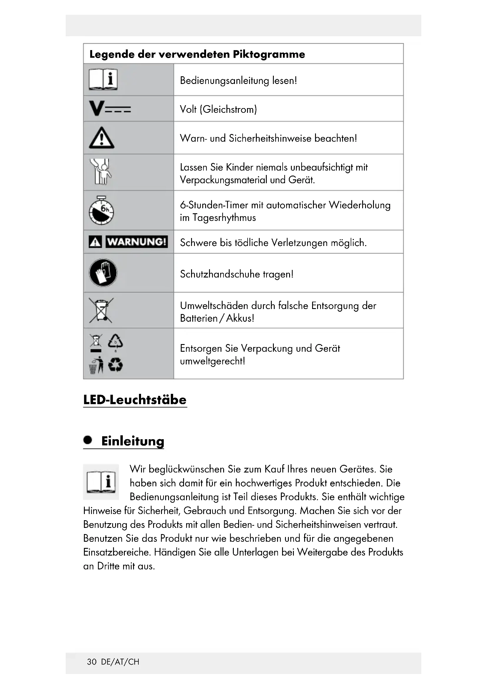 Legende der verwendeten Piktogramme ...... Seite 30 Einleitung ....................................................................................Seite 30 Bestimmungsgemäße Verwendung ...............................................Seite 31 Teilebeschreibung .......................................................................... Seite 31 Technische Daten ........................................................................... Seite 31 Lieferumfang ...................................................................................Seite 31 Sicherheitshinweise ...........................................................Seite 32 Inbetriebnahme ....................................................................Seite 33 LED-Leuchtstäbe in Boden stecken ................................................Seite 33 Batterien einlegen / wechseln ........................................................Seite 33 LED-Leuchtstäbe ein- / ausschalten ................................................ Seite 34 Reinigung und Pflege .......................................................Seite 34 Entsorgung ................................................................................Seite 34 Garantie und Service .......................................................Seite 35 Serviceadresse ............................................................................... Seite 36 Hersteller .........................................................................................Seite 3630 DE/AT/CH Legende der verwendeten Piktogramme Bedienungsanleitung lesen! Volt (Gleichstrom) Warn- und Sicherheitshinweise beachten! Lassen Sie Kinder niemals unbeaufsichtigt mit Verpackungsmaterial und Gerät. 6-Stunden-Timer mit automatischer Wiederholung im Tagesrhythmus Schwere bis tödliche Verletzungen möglich. Schutzhandschuhe tragen! Umweltschäden durch falsche Entsorgung der Batterien / Akkus!