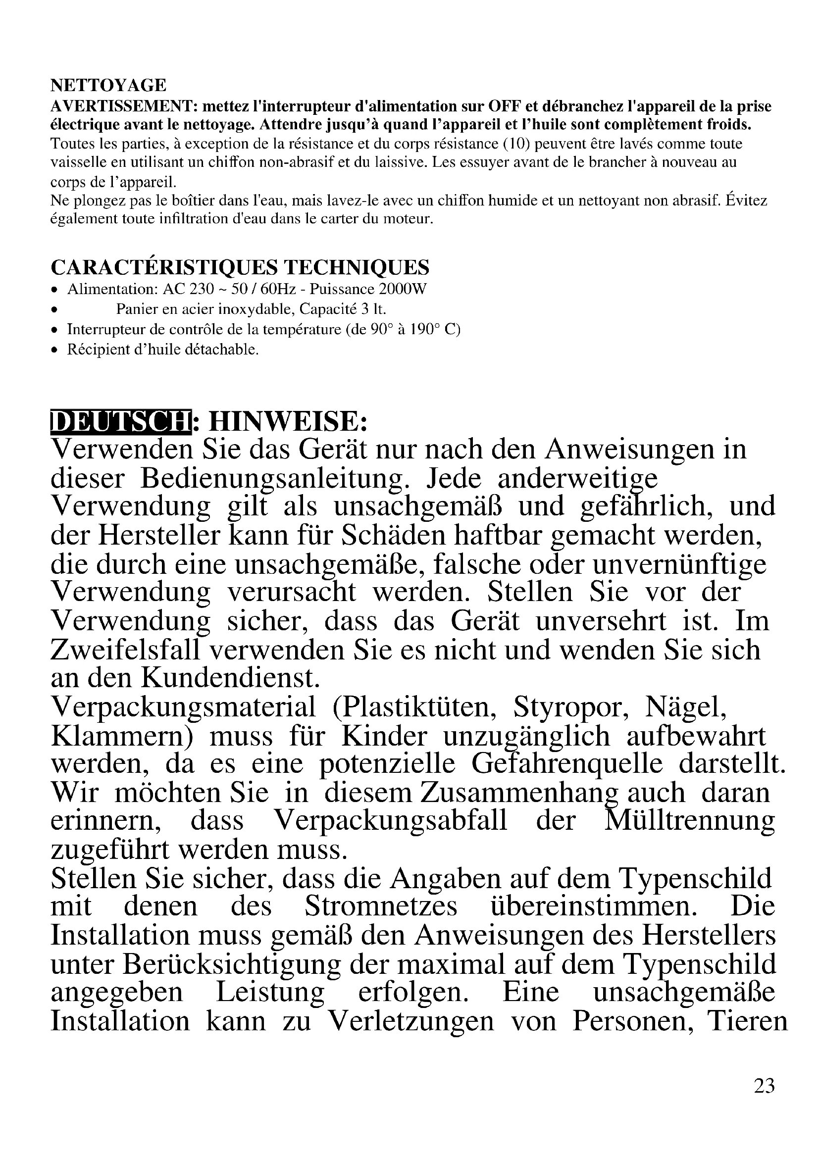 DEUTSCH: HINWEISE: Verwenden Sie das Gerät nur nach den Anweisungen in dieser Bedienungsanleitung. Jede anderweitige Verwendung gilt als unsachgemäß und gefährlich, und der Hersteller kann für Schäden haftbar gemacht werden, die durch eine unsachgemäße, falsche oder unvernünftige Verwendung verursacht werden. Stellen Sie vor der Verwendung sicher, dass das Gerät unversehrt ist. Im Zweifelsfall verwenden Sie es nicht und wenden Sie sich an den Kundendienst. Verpackungsmaterial (Plastiktüten, Styropor, Nägel, Klammern) muss für Kinder unzugänglich aufbewahrt werden, da es eine potenzielle Gefahrenquelle darstellt. Wir möchten Sie in diesem Zusammenhang auch daran erinnern, dass Verpackungsabfall der Mülltrennung zugeführt werden muss. Stellen Sie sicher, dass die Angaben auf dem Typenschild mit denen des Stromnetzes übereinstimmen. Die Installation muss gemäß den Anweisungen des Herstellers unter Berücksichtigung der maximal auf dem Typenschild angegeben Leistung erfolgen. Eine unsachgemäße Installation kann zu Verletzungen von Personen, Tieren24 oder zu Sachschäden führen, für die der Hersteller nicht haftbar gemacht werden kann. Wenn Adapter, Mehrfachsteckdosen und Verlängerungskabel erforderlich sind, verwenden Sie nur solche, die die geltenden Sicherheitsstandards erfüllen. In keinem Fall dürfen die am einfachen Adapter und/oder an den Verlängerungskabeln angegebenen Verbrauchsgrenzen sowie die maximale Leistung überschritten werden, die auf dem Mehrfachadapter angegeben ist. - Verwenden Sie das Netzkabel nicht in der Nähe von scharfen Gegenständen oder heißen Oberflächen und ziehen Sie den Netzstecker nicht am Netzkabel aus der Steckdose. Lassen Sie es nicht von der Arbeitsplatte baumeln, wo ein Kind es halten könnte. Verwenden Sie das Gerät im Falle von Schäden am Netzkabel, Stecker oder im Falle von Kurzschlüssen nicht und lassen Sie es in einer Vertragswerkstatt reparieren. - Setzen Sie das Gerät keinen ungünstigen Wetterbedingungen, wie z. B. Regen, Feuchtigkeit, Frost, aus und bewahren Sie es an einem trockenen Ort auf. Fassen Sie das Gerät nicht mit nassen Händen an und verwenden Sie es nicht barfuß. - Dieses Gerät kann nicht von Kindern verwendet werden, auch wenn diese älter als 8 Jahre sind. - Dieses Gerät kann von Personen mit eingeschränkten körperlichen, sensorischen oder geistigen Fähigkeiten oder mangelnder Erfahrung und Kenntnissen verwendet werden, wenn sie in sicherer Weise beaufsichtigt oder instruiert wurden, wie das Gerät verwendet werden kann, und die damit verbundenen Gefahren verstehen. - Kinder dürfen nicht mit dem Gerät spielen. - Bewahren Sie das Gerät und sein Netzanschluss außerhalb der Reichweite von Kinder unter 8 Jahren.25 Wenn das Netzkabel beschädigt ist oder wenn ein Fehler vorliegt, darf das Gerät nicht manipuliert werden. Jede Reparatur muss vom Hersteller oder seinem technischen Kundendienst oder in jedem Fall von einer Person mit ähnlicher Qualifikation durchgeführt werden, um jegliches Risiko zu vermeiden. Die Nichtbeachtung der vorstehenden Bestimmungen kann die Sicherheit des Geräts beeinträchtigen und die Garantiebedingungen ungültig machen. WARNUNG: Dieses Gerät enthält eine Heizfunktion. Oberflächen, außer die funktionellen Oberflächen können hohe Temperaturen entwickeln. Da die Temperaturen von verschiedene Personen unterschiedlich wahrgenommen werden, sollte dieses Gerät mit VORSICHT verwendet werden. Halten Sie das Gerät ausschließlich auf Griffflächen die abhalten und verwenden Sie solche Hitzeschutzmaßen. Dieses Gerät ist nur für den Hausgebrauch oder gleichwertiges bestimmt, in Situationen wie bspw.: Kantinen in kleinen Firmen oder ähnliche Arbeitsumgebungen, von Kunden in Hotels, Motels oder andere Art von touristische Unterkunft, wie ländlicher oder Wohn –Tourismus. Das Gerät darf nicht mit einer Zeitschaltuhr oder mit einem separaten Fernwirksystem betrieben werden Führen Sie vor jedem Gebrauch das Netzkabel aus. Setzen Sie das Produkt keinen Stößen aus, es könnte beschädigt werden. Verwenden Sie nur originale und kompatible Teile und Zubehör. Halten Sie das Gerät fern von brennbaren Materialien, Wärmequellen, Dampf-und kalte Zonen. ALLGEMEINE ANWEISUNGEN Bevor Sie das gerät zum ersten mal verwenden, waschen Sie sorgfältig alle teile, die mit den lebensmitteln in26 berührung kommen, wie z.B. den behälter. ACHTUNG: Sorgen Sie vor der ersten Inbetriebnahme des Geräts für eine korrekte Installation. Ziehen Sie den Netzstecker aus der Steckdose. Lassen Sie das Gerät während des Betriebs niemals unbeaufsichtigt. Ziehen Sie das Gerät nach jedem Gebrauch aus der Steckdose. Lassen Sie das Produkt abkühlen, bevor Sie es zerlegen oder reinigen. Stellen Sie das Gerät auf eine ebene und stabile Oberfläche und bei ausreichender Belüftung. Nicht in der Nähe von Elektro- oder Gaskochfeldern und außerhalb des Ofens installieren. Stellen Sie das Gerät in der Nähe der Steckdose auf, um die Verwendung von Verlängerungskabeln zu vermeiden. VORSICHT: Während des Gebrauchs mit Vorsicht verwenden, da das Produkt möglicherweise gefährliches heißes Öl enthält. Wir empfehlen, das Gerät nicht zu bewegen, wenn es heißes Öl enthält, und es abkühlen zu lassen, bevor Sie den Behälter entleeren oder reinigen. Überprüfen Sie, ob das Produkt ausgeschaltet ist, bevor Sie das Gerät an die Steckdose anschließen. Schalten Sie den Knopf zum Ausschalten auf OFF und ziehen Sie ihn aus der Steckdose. Nicht ohne Öl verwenden. Stellen Sie sicher, dass der Korb richtig zusammengebaut ist, bevor Sie das Produkt einschalten. Wenn Sie das Gerät nicht mehr benutzen, wickeln Sie das Netzkabel ein, um eine bessere Reinigung zu gewährleisten. Zur Reinigung folgen Sie den Anweisungen im Abschnitt "Reinigung".27 Tauchen Sie das Stromkabel oder den Stecker nicht in Wasser oder andere Flüssigkeiten. Verwenden Sie zum Reinigen ein feuchtes Tuch.