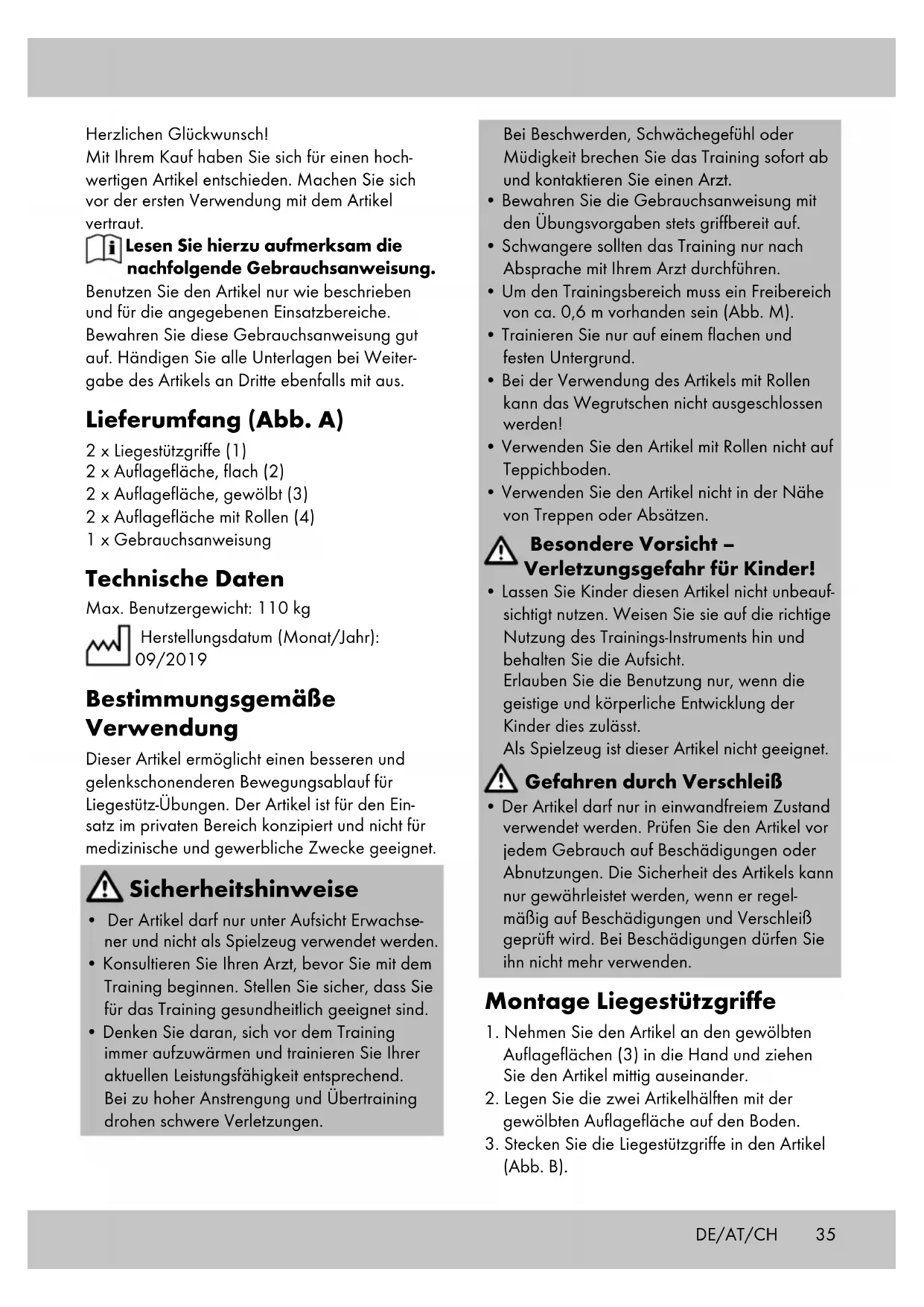 - Der Artikel darf nur in einwandfreiem Zustand verwendet werden. Prüfen Sie den Artikel vor jedem Gebrauch auf Beschädigungen oder Abnutzungen. Die Sicherheit des Artikels kann nur gewährleistet werden, wenn er regel- mäßig auf Beschädigungen und Verschleiß geprüft wird. Bei Beschädigungen dürfen Sie ihn nicht mehr verwenden. Montage Liegestützgriffe
