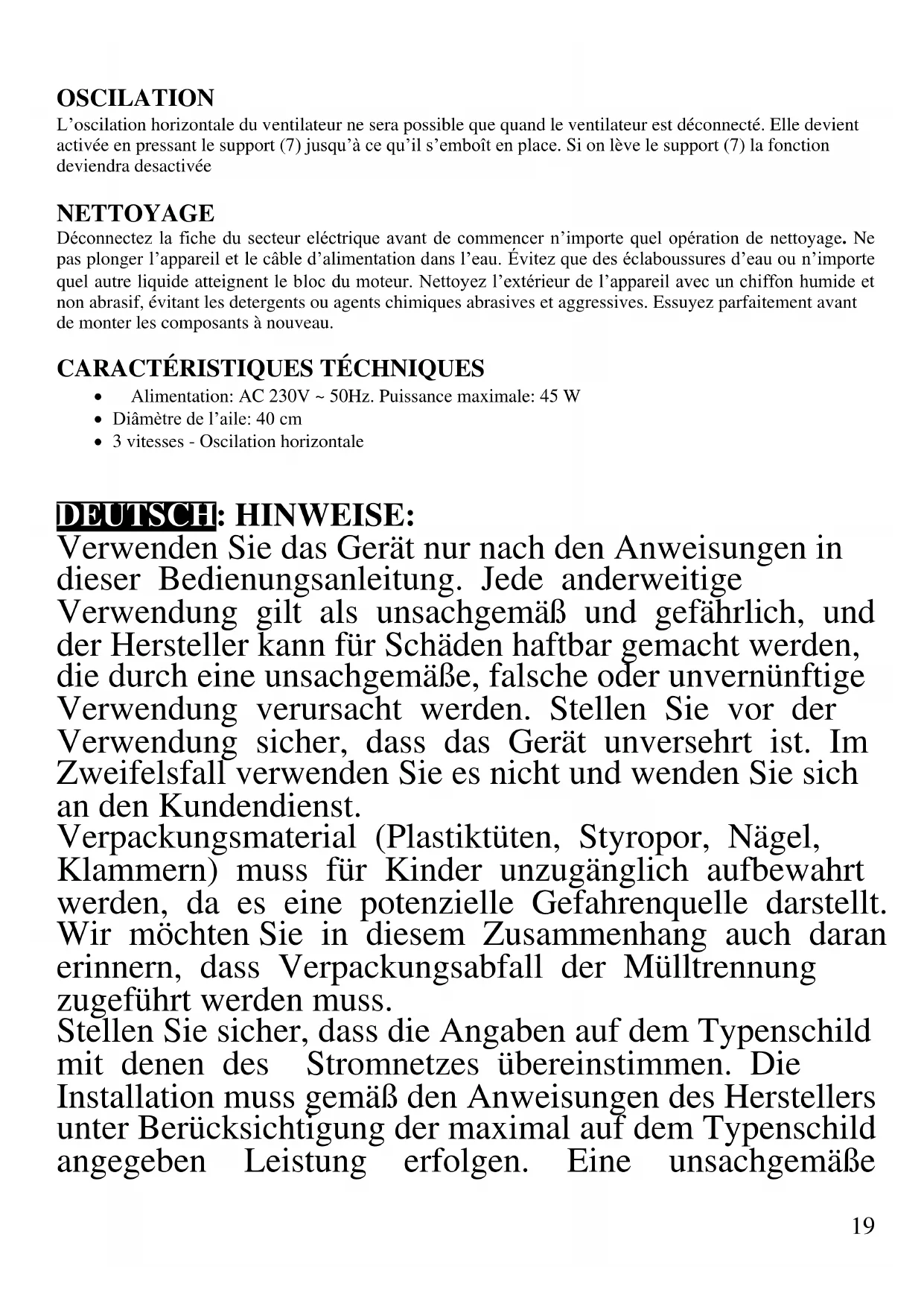 DEUTSCH: HINWEISE: Verwenden Sie das Gerät nur nach den Anweisungen in dieser Bedienungsanleitung. Jede anderweitige Verwendung gilt als unsachgemäß und gefährlich, und der Hersteller kann für Schäden haftbar gemacht werden, die durch eine unsachgemäße, falsche oder unvernünftige Verwendung verursacht werden. Stellen Sie vor der Verwendung sicher, dass das Gerät unversehrt ist. Im Zweifelsfall verwenden Sie es nicht und wenden Sie sich an den Kundendienst. Verpackungsmaterial (Plastiktüten, Styropor, Nägel, Klammern) muss für Kinder unzugänglich aufbewahrt werden, da es eine potenzielle Gefahrenquelle darstellt. Wir möchten Sie in diesem Zusammenhang auch daran erinnern, dass Verpackungsabfall der Mülltrennung zugeführt werden muss. Stellen Sie sicher, dass die Angaben auf dem Typenschild mit denen des Stromnetzes übereinstimmen. Die Installation muss gemäß den Anweisungen des Herstellers unter Berücksichtigung der maximal auf dem Typenschild angegeben Leistung erfolgen. Eine unsachgemäße20 Installation kann zu Verletzungen von Personen, Tieren oder zu Sachschäden führen, für die der Hersteller nicht haftbar gemacht werden kann. Wenn Adapter, Mehrfachsteckdosen und Verlängerungskabel erforderlich sind, verwenden Sie nur solche, die die geltenden Sicherheitsstandards erfüllen. In keinem Fall dürfen die am einfachen Adapter und/oder an den Verlängerungskabeln angegebenen Verbrauchsgrenzen sowie die maximale Leistung überschritten werden, die auf dem Mehrfachadapter angegeben ist. - Verwenden Sie das Netzkabel nicht in der Nähe von scharfen Gegenständen oder heißen Oberflächen und ziehen Sie den Netzstecker nicht am Netzkabel aus der Steckdose. Lassen Sie es nicht von der Arbeitsplatte baumeln, wo ein Kind es halten könnte. Verwenden Sie das Gerät im Falle von Schäden am Netzkabel, Stecker oder im Falle von Kurzschlüssen nicht und lassen Sie es in einer Vertragswerkstatt reparieren. - Setzen Sie das Gerät keinen ungünstigen Wetterbedingungen, wie z. B. Regen, Feuchtigkeit, Frost, aus und bewahren Sie es an einem trockenen Ort auf. Fassen Sie das Gerät nicht mit nassen Händen an und verwenden Sie es nicht barfuß. - Dieses Gerät kann von Kindern ab 8 Jahren und von Personen mit eingeschränkten körperlichen, sensorischen oder geistigen Fähigkeiten oder mangelnder Erfahrung und Kenntnissen verwendet werden, wenn sie beaufsichtigt oder instruiert wurden, um das Gerät sicher zu verwenden und die damit verbundenen Gefahren zu verstehen. Kinder dürfen nicht mit dem Gerät spielen. Reinigung und Benutzerwartung dürfen nicht von Kindern ohne Aufsicht durchgeführt werden.21 - Kinder dürfen nicht mit dem Gerät spielen. - Bewahren Sie das Gerät und sein Netzanschluss außerhalb der Reichweite von Kinder unter 8 Jahren. Wenn das Netzkabel beschädigt ist oder wenn ein Fehler vorliegt, darf das Gerät nicht manipuliert werden. Jede Reparatur muss vom Hersteller oder seinem technischen Kundendienst oder in jedem Fall von einer Person mit ähnlicher Qualifikation durchgeführt werden, um jegliches Risiko zu vermeiden. Die Nichtbeachtung der vorstehenden Bestimmungen kann die Sicherheit des Geräts beeinträchtigen und die Garantiebedingungen ungültig machen. Dieses Gerät ist nur für den Hausgebrauch oder gleichwertiges bestimmt, in Situationen wie bspw.: Kantinen in kleinen Firmen oder ähnliche Arbeitsumgebungen, von Kunden in Hotels, Motels oder andere Art von touristische Unterkunft, wie ländlicher oder Wohn –Tourismus. Das Gerät darf nicht mit einer Zeitschaltuhr oder mit einem separaten Fernwirksystem betrieben werden Führen Sie vor jedem Gebrauch das Netzkabel aus. Setzen Sie das Produkt keinen Stößen aus, es könnte beschädigt werden. Verwenden Sie nur originale und kompatible Teile und Zubehör. Halten Sie das Gerät fern von brennbaren Materialien, Wärmequellen, Dampf-und kalte Zonen. BEDIENUNGSANLEITUNG Montieren Sie das Gerät völlig und folgen Sie der Anleitung sorgfältig. Stecken Sie den Stecker nicht hinein, wenn Sie mit der Montage noch nicht fertig sind. Betreiben Sie nie das Gerät unbewacht. Nach jeder Nutzung, ziehen Sie immer den Stecker aus der Steckdose.22 Dafür ziehen Sie am Stecker, nicht am Kabel. Tauchen Sie das Gerät nicht in Wasser oder andere Flüssigkeiten und vermeiden Sie Spritze auf es. Bevor Sie das Gerät reinigen, ziehen Sie den Stecker aus der Steckdose aus. Vor jeder Nutzung, rollen Sie das Kabel ab. Stecken Sie keine Gegenstände in die Schutzgitter. Verstopfen Sie die Schutzgitter nicht. Stellen Sie das Gerät auf feste, stabile Flächen, von Fenstern oder Luftströmen fern. MODELL G50031 1 vorderes Schutzgitter 2 Gebläse 3 hinteres Schutzgitter 4 Plastikmotorschutz 5 Schwingungsdrehpunkt 6 Motorgerät 7 Motorgerätgriff 8 obere Säule 9 Höhe-Drehknopf 10 Basisdecke 11 untere Säule 12 Basisschrauben 13 Motorwelle 14 Bedienfeld 15 hintere Gittersperre 16 Gebläsesperre 17 Gitterschraub 18 Sockel 19 Drehpunkt für vertikales Kippen MONTAGE Der Ventilatormotor kann funktionieren, auch wenn die Schutzgitter noch nicht aufgestellt und befestigt wurden. Zur maximaler Sicherheit, montieren Sie das Gerät sorgfältig.