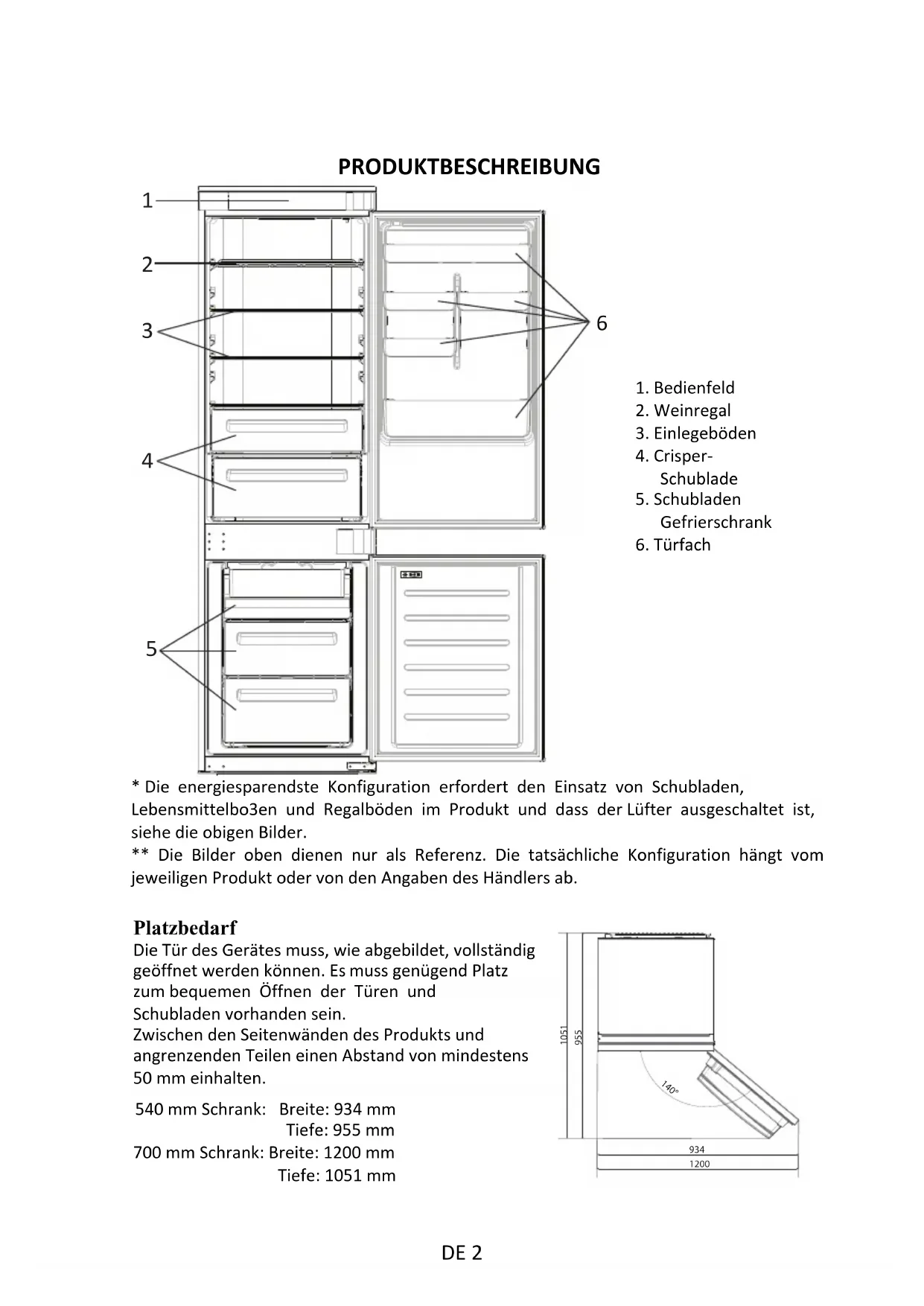 - Die energiesparendste Konfiguration erfordert den Einsatz von Schubladen,Lebensmittelbo3en und Regalböden im Produkt und dass der Lüfter ausgeschaltet ist,siehe die obigen Bilder.** Die Bilder oben dienen nur als Referenz. Die tatsächliche Konfiguration hängt vomjeweiligen Produkt oder von den Angaben des Händlers ab.Platzbedarf Die Tür des Gerätes muss, wie abgebildet, vollständig geöffnet werden können. Es muss genügend Platz zum bequemen Öffnen der Türen und Schubladen vorhanden sein. Zwischen den Seitenwänden des Produkts und angrenzenden Teilen einen Abstand von mindestens 50 mm einhalten.1. Bedienfeld2. Weinregal3. Einlegeböden4. Crisper-Schublade5. SchubladenGefrierschrank6. Türfach