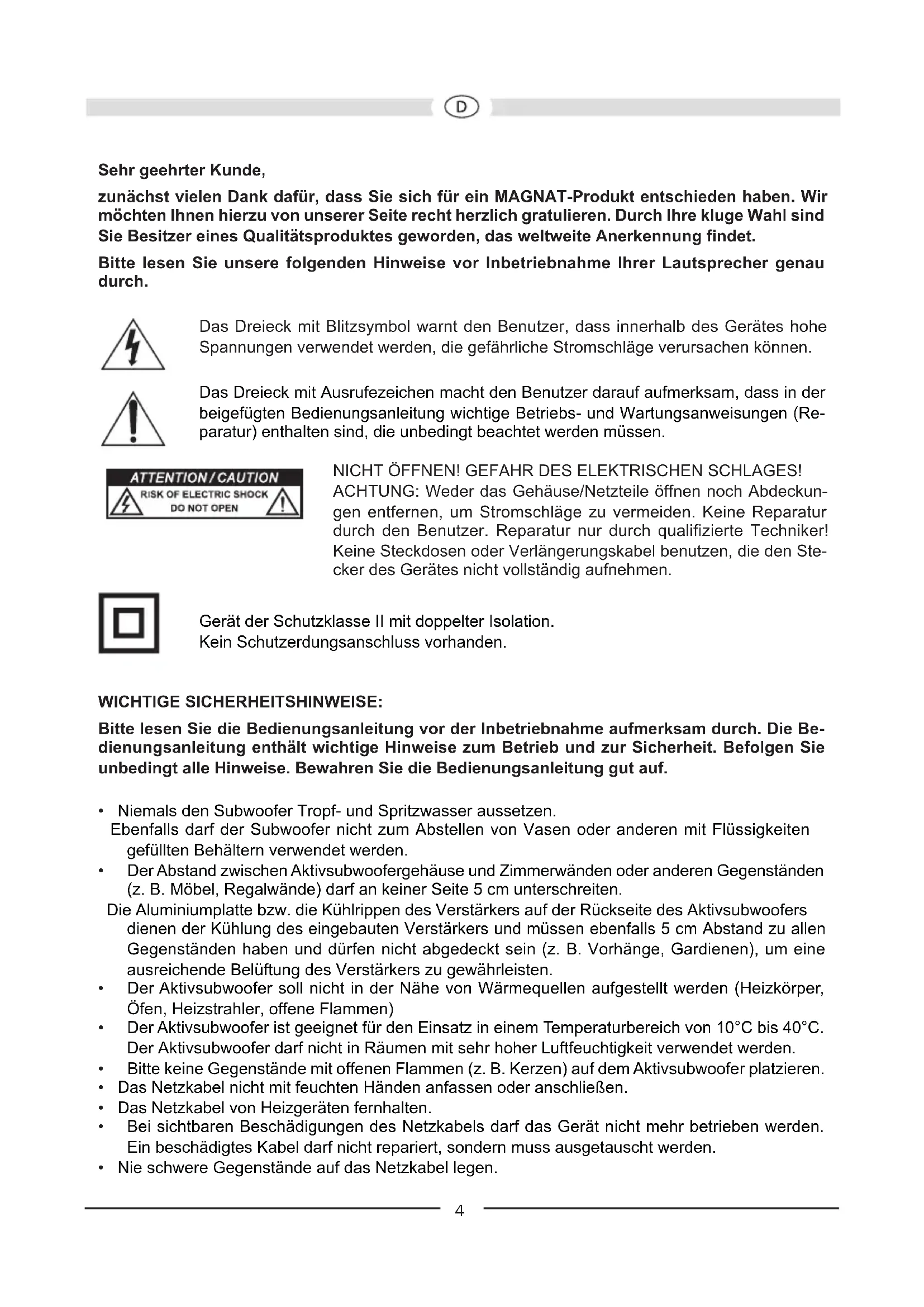 Abbildungen/Illustrations4 Sehr geehrter Kunde, zunächst vielen Dank dafür, dass Sie sich für ein MAGNAT-Produkt entschieden haben. Wir möchten Ihnen hierzu von unserer Seite recht herzlich gratulieren. Durch Ihre kluge Wahl sind Sie Besitzer eines Qualitätsproduktes geworden, das weltweite Anerkennung findet. Bitte lesen Sie unsere folgenden Hinweise vor Inbetriebnahme Ihrer Lautsprecher genau durch. Das Dreieck mit Blitzsymbol warnt den Benutzer, dass innerhalb des Gerätes hohe Spannungen verwendet werden, die gefährliche Stromschläge verursachen können. Das Dreieck mit Ausrufezeichen macht den Benutzer darauf aufmerksam, dass in der beigefügten Bedienungsanleitung wichtige Betriebs- und Wartungsanweisungen (Re- paratur) enthalten sind, die unbedingt beachtet werden müssen. NICHT ÖFFNEN! GEFAHR DES ELEKTRISCHEN SCHLAGES! ACHTUNG: Weder das Gehäuse/Netzteile öffnen noch Abdeckun- gen entfernen, um Stromschläge zu vermeiden. Keine Reparatur durch den Benutzer. Reparatur nur durch qualifizierte Techniker! Keine Steckdosen oder Verlängerungskabel benutzen, die den Ste- cker des Gerätes nicht vollständig aufnehmen. Gerät der Schutzklasse II mit doppelter Isolation. Kein Schutzerdungsanschluss vorhanden. WICHTIGE SICHERHEITSHINWEISE: Bitte lesen Sie die Bedienungsanleitung vor der Inbetriebnahme aufmerksam durch. Die Be- dienungsanleitung enthält wichtige Hinweise zum Betrieb und zur Sicherheit. Befolgen Sie unbedingt alle Hinweise. Bewahren Sie die Bedienungsanleitung gut auf.