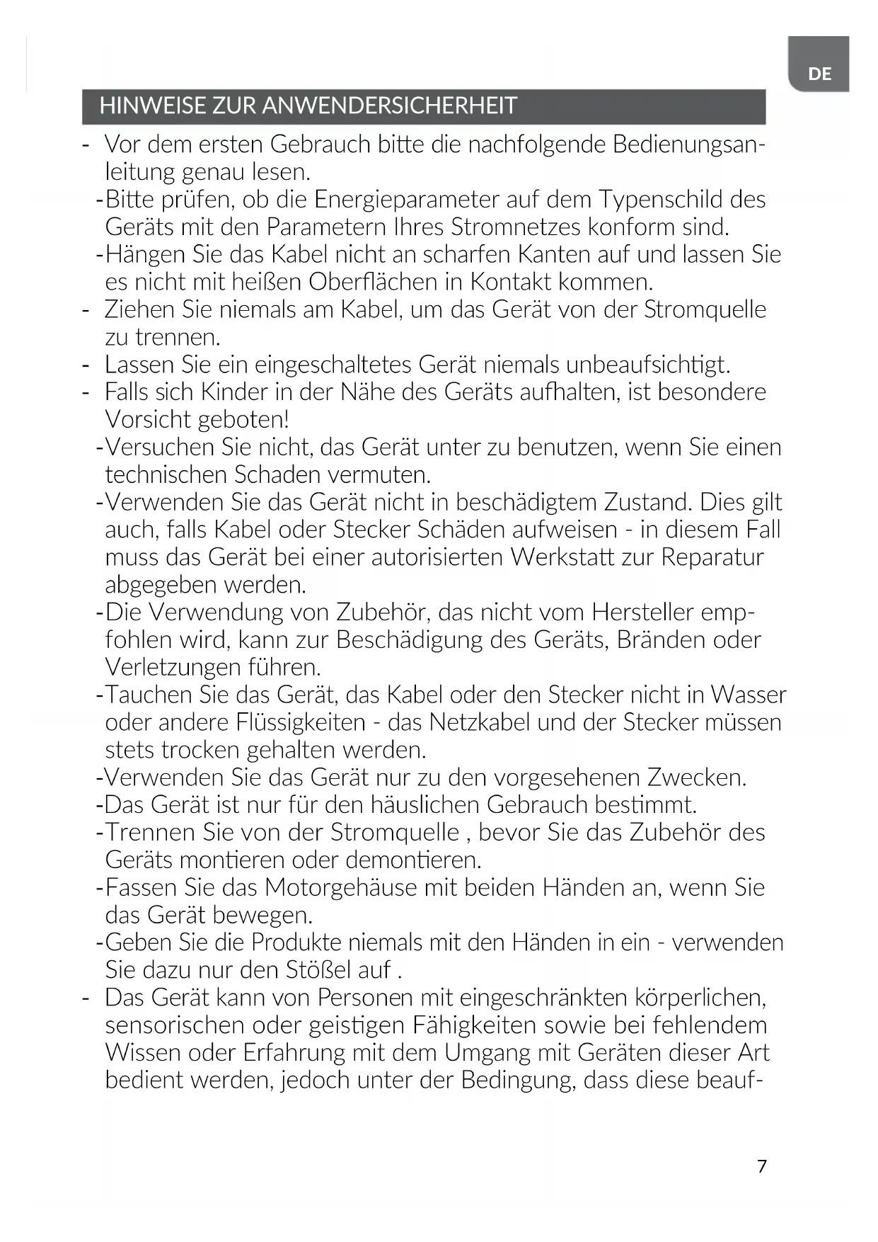 Geben Sie die Produkte niemals mit den Händen in ein - verwenden Sie dazu nur den Stößel auf . - Das Gerät kann von Personen mit eingeschränkten körperlichen, sensorischen oder geisgen Fähigkeiten sowie bei fehlendem Wissen oder Erfahrung mit dem Umgang mit Geräten dieser Art bedient werden, jedoch unter der Bedingung, dass diese beauf-8