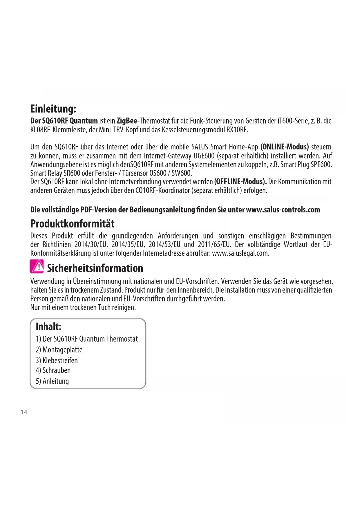 and there is no need to turn on the heating. User can select 3 levels of warm oor feature. Please note it is not an economy feature, as your heating system may be ON even if there is no heating demand from the room thermostat. It is COMFORT feature which keeps your oor warm all the time. Français Deutsch Nederlands English14 Einleitung: Der SQ610RF Quantum ist ein ZigBee-Thermostat für die Funk-Steuerung von Geräten der iT600-Serie, z. B. die KL08RF-Klemmleiste, der Mini-TRV-Kopf und das Kesselsteuerungsmodul RX10RF. Um den SQ610RF über das Internet oder über die mobile SALUS Smart Home-App (ONLINE-Modus) steuern zu können, muss er zusammen mit dem Internet-Gateway UGE600 (separat erhältlich) installiert werden. Auf Anwendungsebene ist es möglich denSQ610RF mit anderen Systemelementen zu koppeln, z.B. Smart Plug SPE600, Smart Relay SR600 oder Fenster- / Türsensor OS600 / SW600. Der SQ610RF kann lokal ohne Internetverbindung verwendet werden (OFFLINE-Modus). Die Kommunikation mit anderen Geräten muss jedoch über den CO10RF-Koordinator (separat erhältlich) erfolgen. Die vollständige PDF-Version der Bedienungsanleitung nden Sie unter www.salus-controls.com Verwendung in Übereinstimmung mit nationalen und EU-Vorschriften. Verwenden Sie das Gerät wie vorgesehen, halten Sie es in trockenem Zustand. Produkt nur für den Innenbereich. Die Installation muss von einer qualizierten Person gemäß den nationalen und EU-Vorschriften durchgeführt werden. Nur mit einem trockenen Tuch reinigen. Produktkonformität Sicherheitsinformation Dieses Produkt erfüllt die grundlegenden Anforderungen und sonstigen einschlägigen Bestimmungen der Richtlinien 2014/30/EU, 2014/35/EU, 2014/53/EU und 2011/65/EU. Der vollständige Wortlaut der EU- Konformitätserklärung ist unter folgender Internetadresse abrufbar: www.saluslegal.com. Inhalt: