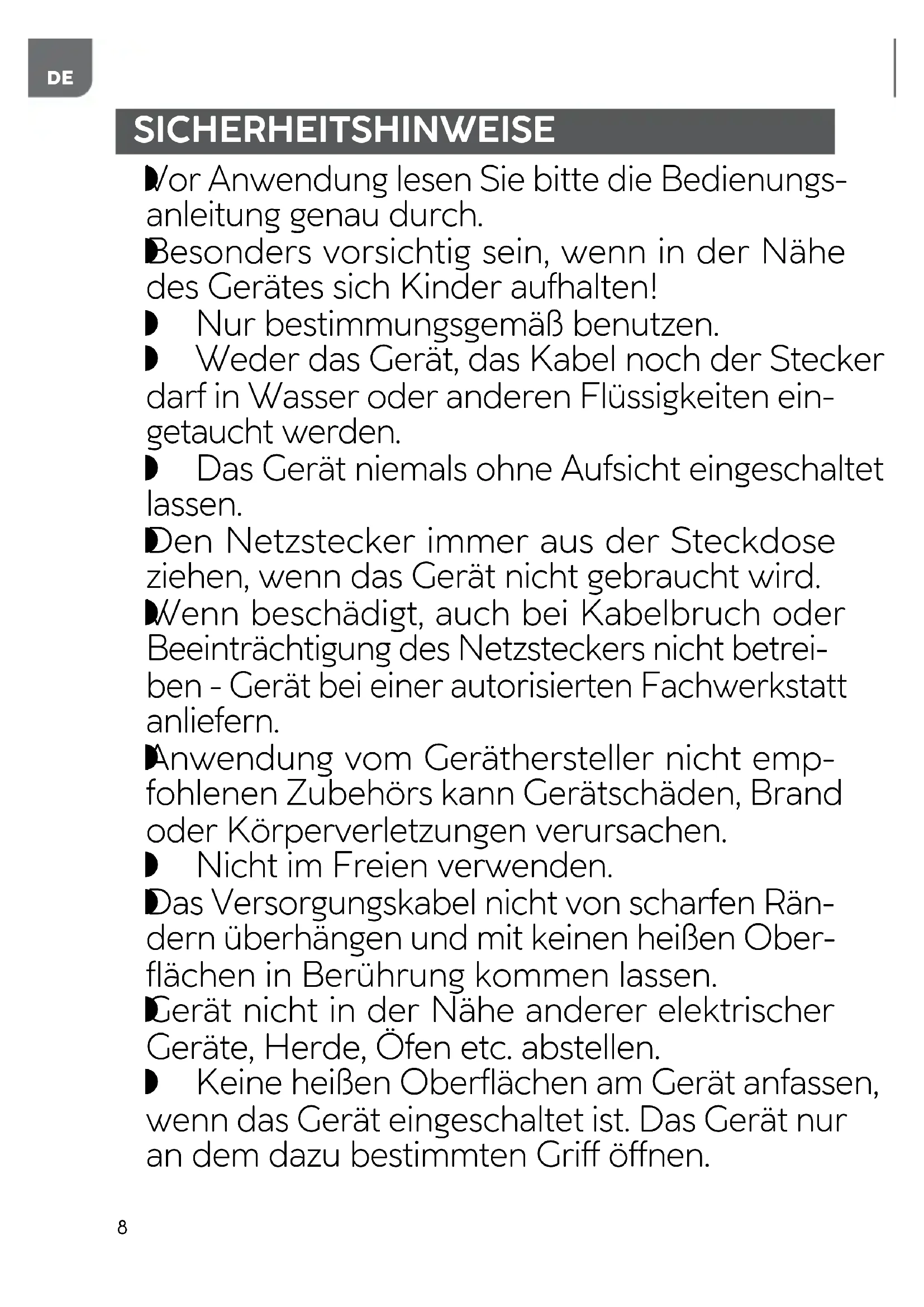 Gerät nicht in der Nähe anderer elektrischer Geräte, Herde, Öfen etc. abstellen. Keine heißen Oberflächen am Gerät anfassen, wenn das Gerät eingeschaltet ist. Das Gerät nur an dem dazu bestimmten Griff öffnen.9
