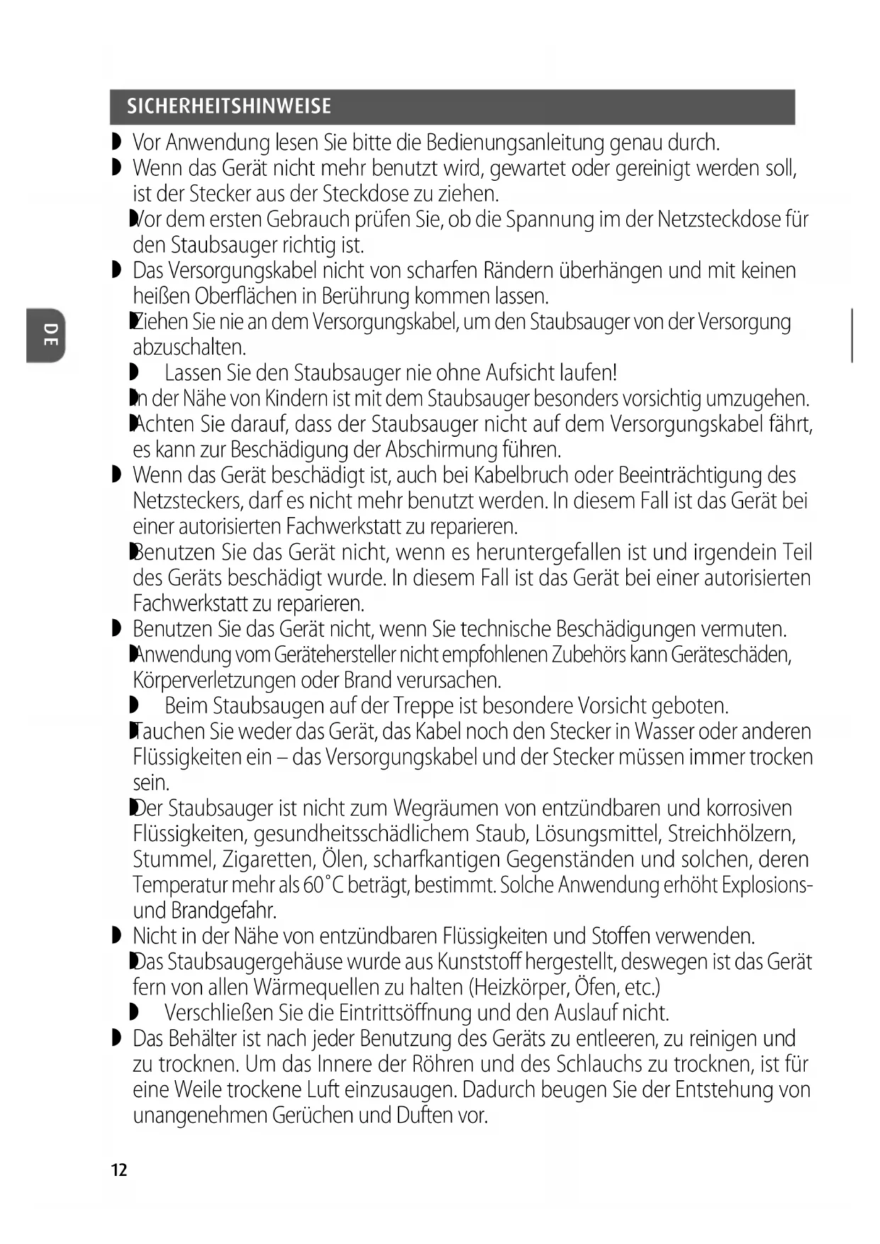 Das Staubsaugergehäuse wurde aus Kunststoff hergestellt, deswegen ist das Gerät fern von allen Wärmequellen zu halten (Heizkörper, Öfen, etc.) Verschließen Sie die Eintrittsöffnung und den Auslauf nicht. Das Behälter ist nach jeder Benutzung des Geräts zu entleeren, zu reinigen und zu trocknen. Um das Innere der Röhren und des Schlauchs zu trocknen, ist für eine Weile trockene Luft einzusaugen. Dadurch beugen Sie der Entstehung von unangenehmen Gerüchen und Duften vor.13