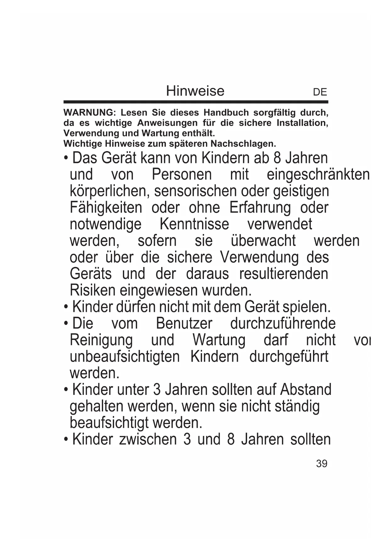 - Kinder zwischen 3 und 8 Jahren dürfen denSteckernichteinstecken,dasGerät nicht einstellen oder reinigen, noch die Wartungsarbeiten durch den Benutzer durchführen.
