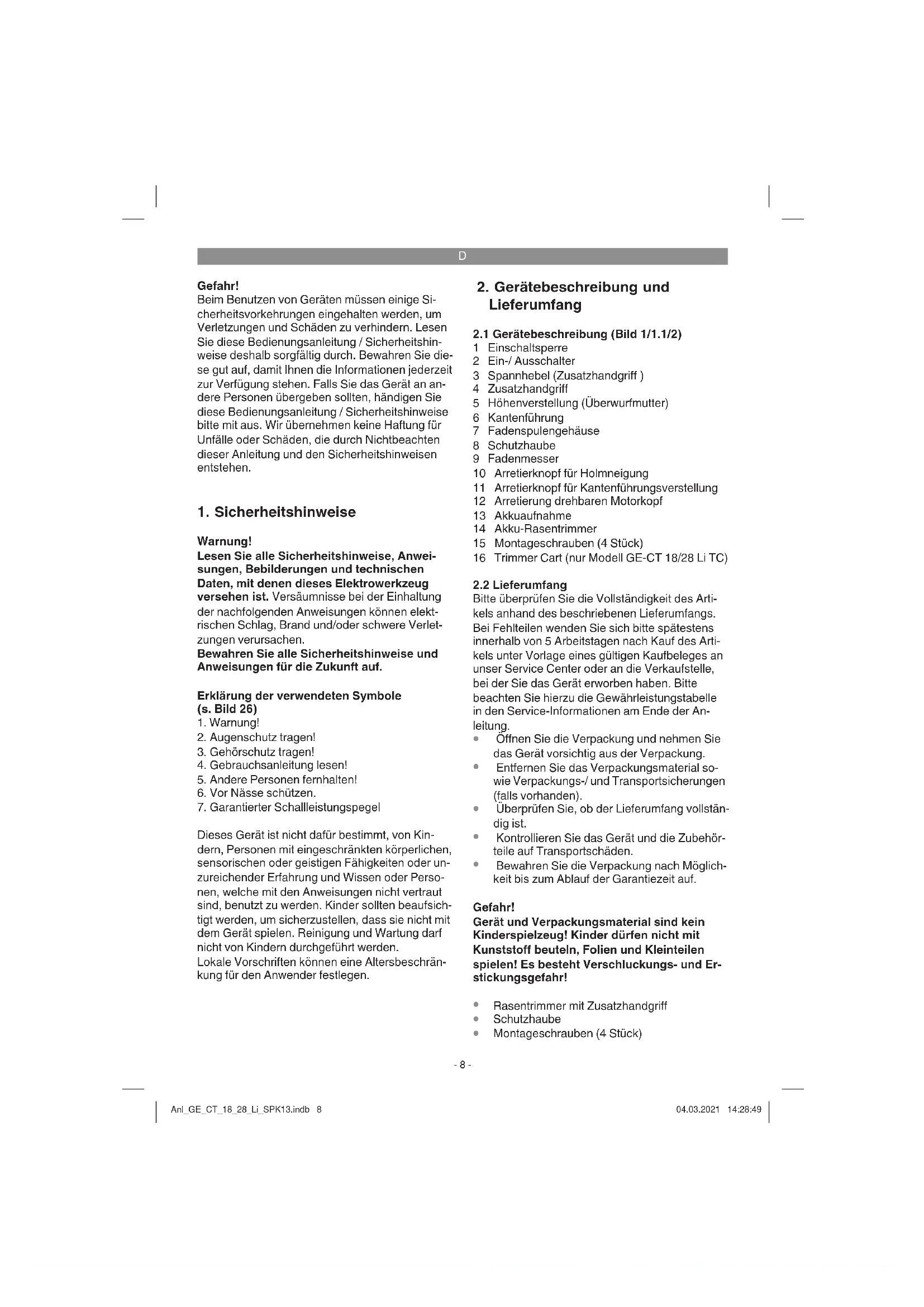 Der Rasentrimmer besitzt ein automatisches Fa- denverlängerungssystem. Beim Einschalten des Gerätes wird der Faden automatisch verlängert, damit Sie immer mit der optimalen Schnittbreite arbeiten. Das Messer an der Schutzhaube kürzt den Faden auf die zulässige Länge. Bei Bedarf kann der Faden, durch Drücken des Freigabe- knopfes (Bild 8 / Pos. 7a) und gleichzeitigem Zie- hen am Faden, manuell verlängert werden. Hinweis: Bitte berücksichtigen Sie, dass der Verschleiß des Fadens durch häufi ges Ein-/Aus- schalten des Gerätes erhöht wird. Achtung! Weggeschleuderte Teile des Nylon- fadens können zu Verletzungen führen! Anl_GE_CT_18_28_Li_SPK13.indb 11Anl_GE_CT_18_28_Li_SPK13.indb 11 04.03.2021 14:28:5004.03.2021 14:28:50D