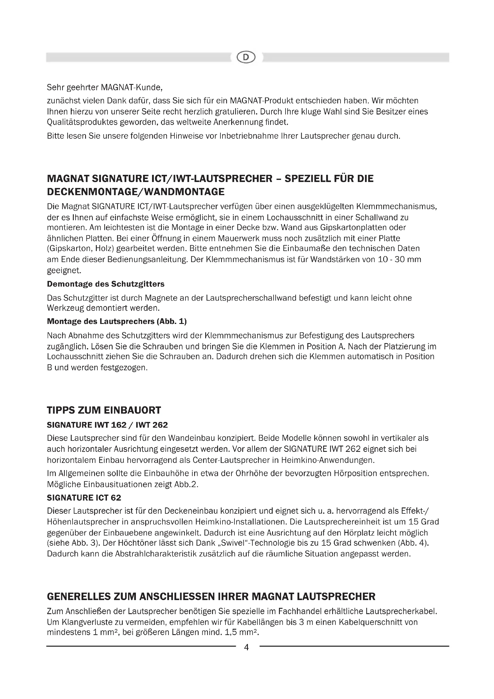 Abbildungen/Illustrations4 Sehr geehrter MAGNAT-Kunde, zunächst vielen Dank dafür, dass Sie sich für ein MAGNAT-Produkt entschieden haben. Wir möchten Ihnen hierzu von unserer Seite recht herzlich gratulieren. Durch Ihre kluge Wahl sind Sie Besitzer eines Qualitätsproduktes geworden, das weltweite Anerkennung ndet. Bitte lesen Sie unsere folgenden Hinweise vor Inbetriebnahme Ihrer Lautsprecher genau durch. MAGNAT SIGNATURE ICT/IWT-LAUTSPRECHER – SPEZIELL FÜR DIE DECKENMONTAGE/WANDMONTAGE Die Magnat SIGNATURE ICT/IWT-Lautsprecher verfügen über einen ausgeklügelten Klemmmechanismus, der es Ihnen auf einfachste Weise ermöglicht, sie in einem Lochausschnitt in einer Schallwand zu montieren. Am leichtesten ist die Montage in einer Decke bzw. Wand aus Gipskartonplatten oder ähnlichen Platten. Bei einer Öffnung in einem Mauerwerk muss noch zusätzlich mit einer Platte (Gipskarton, Holz) gearbeitet werden. Bitte entnehmen Sie die Einbaumaße den technischen Daten am Ende dieser Bedienungsanleitung. Der Klemmmechanismus ist für Wandstärken von 10 - 30 mm geeignet. Demontage des Schutzgitters Das Schutzgitter ist durch Magnete an der Lautsprecherschallwand befestigt und kann leicht ohne Werkzeug demontiert werden. Montage des Lautsprechers (Abb. 1) Nach Abnahme des Schutzgitters wird der Klemmmechanismus zur Befestigung des Lautsprechers zugänglich. Lösen Sie die Schrauben und bringen Sie die Klemmen in Position A. Nach der Platzierung im Lochausschnitt ziehen Sie die Schrauben an. Dadurch drehen sich die Klemmen automatisch in Position B und werden festgezogen.