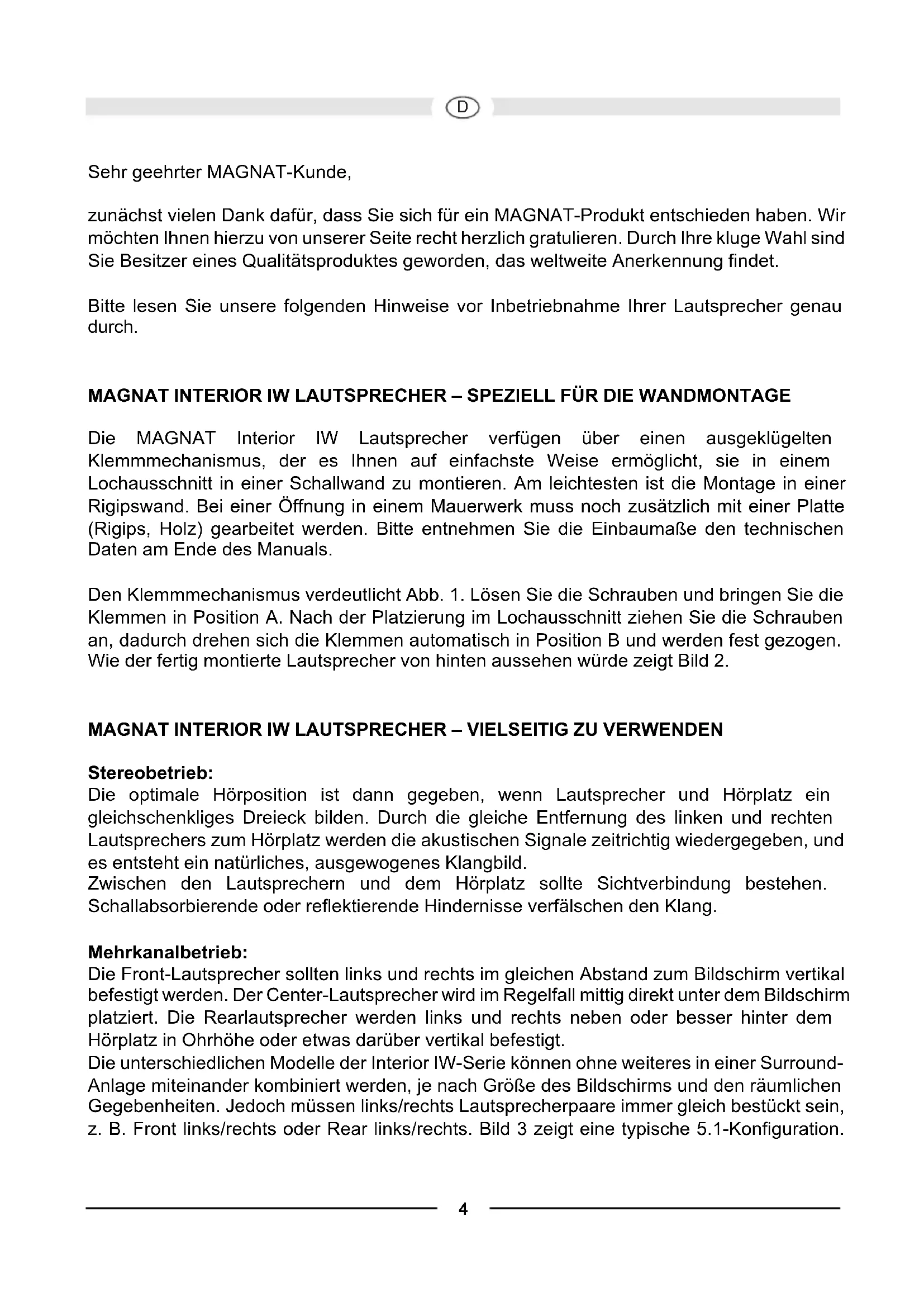 Sehr geehrter MAGNAT-Kunde, zunächst vielen Dank dafür, dass Sie sich für ein MAGNAT-Produkt entschieden haben. Wir möchten Ihnen hierzu von unserer Seite recht herzlich gratulieren. Durch Ihre kluge Wahl sind Sie Besitzer eines Qualitätsproduktes geworden, das weltweite Anerkennung findet. Bitte lesen Sie unsere folgenden Hinweise vor Inbetriebnahme Ihrer Lautsprecher genau durch. MAGNAT INTERIOR IW LAUTSPRECHER – SPEZIELL FÜR DIE WANDMONTAGE Die MAGNAT Interior IW Lautsprecher verfügen über einen ausgeklügelten Klemmmechanismus, der es Ihnen auf einfachste Weise ermöglicht, sie in einem Lochausschnitt in einer Schallwand zu montieren. Am leichtesten ist die Montage in einer Rigipswand. Bei einer Öffnung in einem Mauerwerk muss noch zusätzlich mit einer Platte (Rigips, Holz) gearbeitet werden. Bitte entnehmen Sie die Einbaumaße den technischen Daten am Ende des Manuals. Den Klemmmechanismus verdeutlicht Abb. 1. Lösen Sie die Schrauben und bringen Sie die Klemmen in Position A. Nach der Platzierung im Lochausschnitt ziehen Sie die Schrauben an, dadurch drehen sich die Klemmen automatisch in Position B und werden fest gezogen. Wie der fertig montierte Lautsprecher von hinten aussehen würde zeigt Bild 2. MAGNAT INTERIOR IW LAUTSPRECHER – VIELSEITIG ZU VERWENDEN Stereobetrieb: Die optimale Hörposition ist dann gegeben, wenn Lautsprecher und Hörplatz ein gleichschenkliges Dreieck bilden. Durch die gleiche Entfernung des linken und rechten Lautsprechers zum Hörplatz werden die akustischen Signale zeitrichtig wiedergegeben, und es entsteht ein natürliches, ausgewogenes Klangbild. Zwischen den Lautsprechern und dem Hörplatz sollte Sichtverbindung bestehen. Schallabsorbierende oder reflektierende Hindernisse verfälschen den Klang. Mehrkanalbetrieb: Die Front-Lautsprecher sollten links und rechts im gleichen Abstand zum Bildschirm vertikal befestigt werden. Der Center-Lautsprecher wird im Regelfall mittig direkt unter dem Bildschirm platziert. Die Rearlautsprecher werden links und rechts neben oder besser hinter dem Hörplatz in Ohrhöhe oder etwas darüber vertikal befestigt. Die unterschiedlichen Modelle der Interior IW-Serie können ohne weiteres in einer Surround- Anlage miteinander kombiniert werden, je nach Größe des Bildschirms und den räumlichen Gegebenheiten. Jedoch müssen links/rechts Lautsprecherpaare immer gleich bestückt sein, z. B. Front links/rechts oder Rear links/rechts. Bild 3 zeigt eine typische 5.1-Konfiguration.5