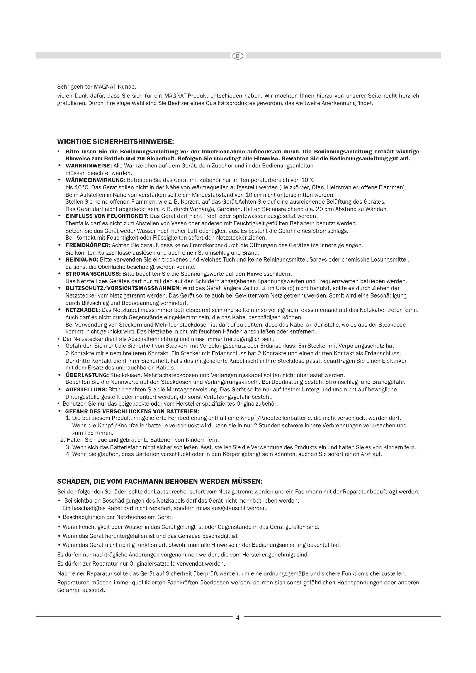 Sehr geehrter MAGNAT-Kunde, vielen Dank dafür, dass Sie sich für ein MAGNAT-Produkt entschieden haben. Wir möchten Ihnen hierzu von unserer Seite recht herzlich gratulieren. Durch Ihre kluge Wahl sind Sie Besitzer eines Qualitätsproduktes geworden, das weltweite Anerkennung ndet. WICHTIGE SICHERHEITSHINWEISE: