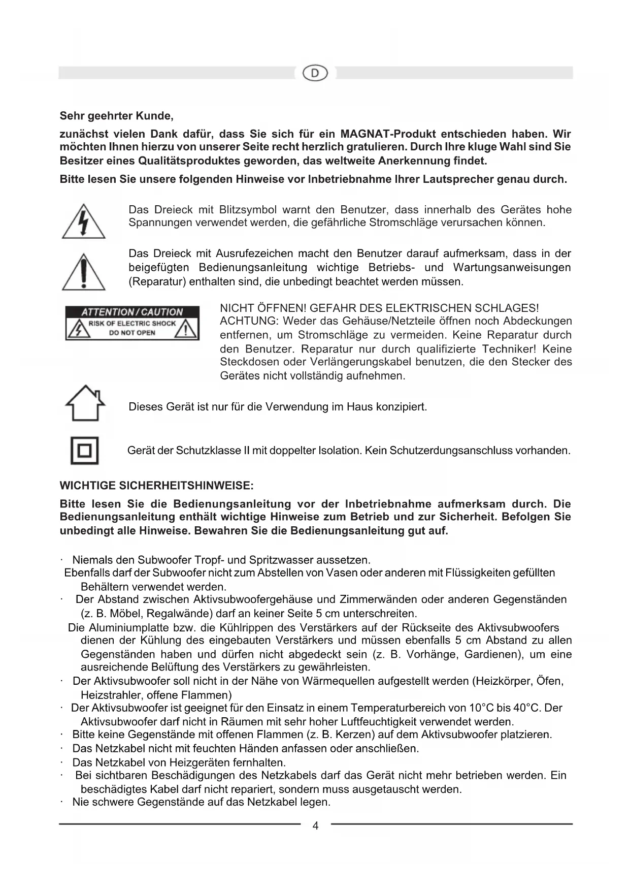 Trennfrequenzregler (4) Hiermit stellen Sie die höchste Frequenz ein, bis zu der Ihr Subwoofer arbeitet. In Kombination mit Regallautsprechern sollte die Frequenz auf 40 – 200 Hz eingestellt werden, kommen Standlautsprecher zum Einsatz, ist eine Einstellung von 50 Hz – 100 Hz sinnvoll. Phasenregler (3) Im Normalfall sollte der Phasenregler auf 0° eingestellt werden. In seltenen Fällen kann es jedoch von Vorteil sein, die Phase zwischen 0° und 180° zu variieren (z. B. bei ungünstiger Entfernung des Subwoofers zu den Front-Satelliten oder bei ungünstigen akustischen Eigenschaften des Raumes). Generell gilt: Die Stellung, bei der der untere Grundtonbereich am natürlichsten klingt, ist die Richtige. Sicherung (9) Als Sicherung darf nur der Typ verwendet werden, der auf der Rückseite des Verstärkers neben dem Sicherungshalter angegeben ist. PFLEGE Reinigen Sie das Gehäuse am besten mit einem milden Haushaltsreiniger. Verwenden Sie auf keinen Fall Möbelpolitur o. ä. TECHNISCHE DATEN Konfiguration: Bassreflex-Subwoofer, ‚Frontfire‘ Bestückung: 300 mm Langhubchassis Ausgangsleistung RMS/Max.: 220 / 440 Watt Frequenzbereich: 18 – 200 Hz Trennfrequenz: 40 – 200 Hz regelbar Maße (BxHxT): 400 x 570 x 510 mm Zubehör: Netzkabel Technische Änderungen vorbehalten.7 Dear Customer, Congratulations on your fine new loudspeakers and thank you very much for choosing MAGNAT! You have made an excellent choice. The high-quality speakers produced by MAGNAT are renowned all over the world. Please study the instructions and information below carefully before using your new loudspeakers. The triangle with a lightning symbol warns the user that high voltage is used within the device which can result in electric shock. The triangle with an exclamation mark informs the user that important operating and maintenance instructions (repair) are contained in the accompanying instruction manual, which must be observed. DO NOT OPEN! RISK OF ELECTRIC SHOCK! CAUTION: In order to avoid electric shock do not open the speaker housing/mains adapters or remove the covers. The user is not to conduct any repairs him/herself. Repairs should only be conducted by qualified technicians! Do not use any sockets or extension cables that do not fully accommodate the plug of the device. This device is designed for indoor use only. This is Class II apparatus with double insulation, and no protective earth provided.