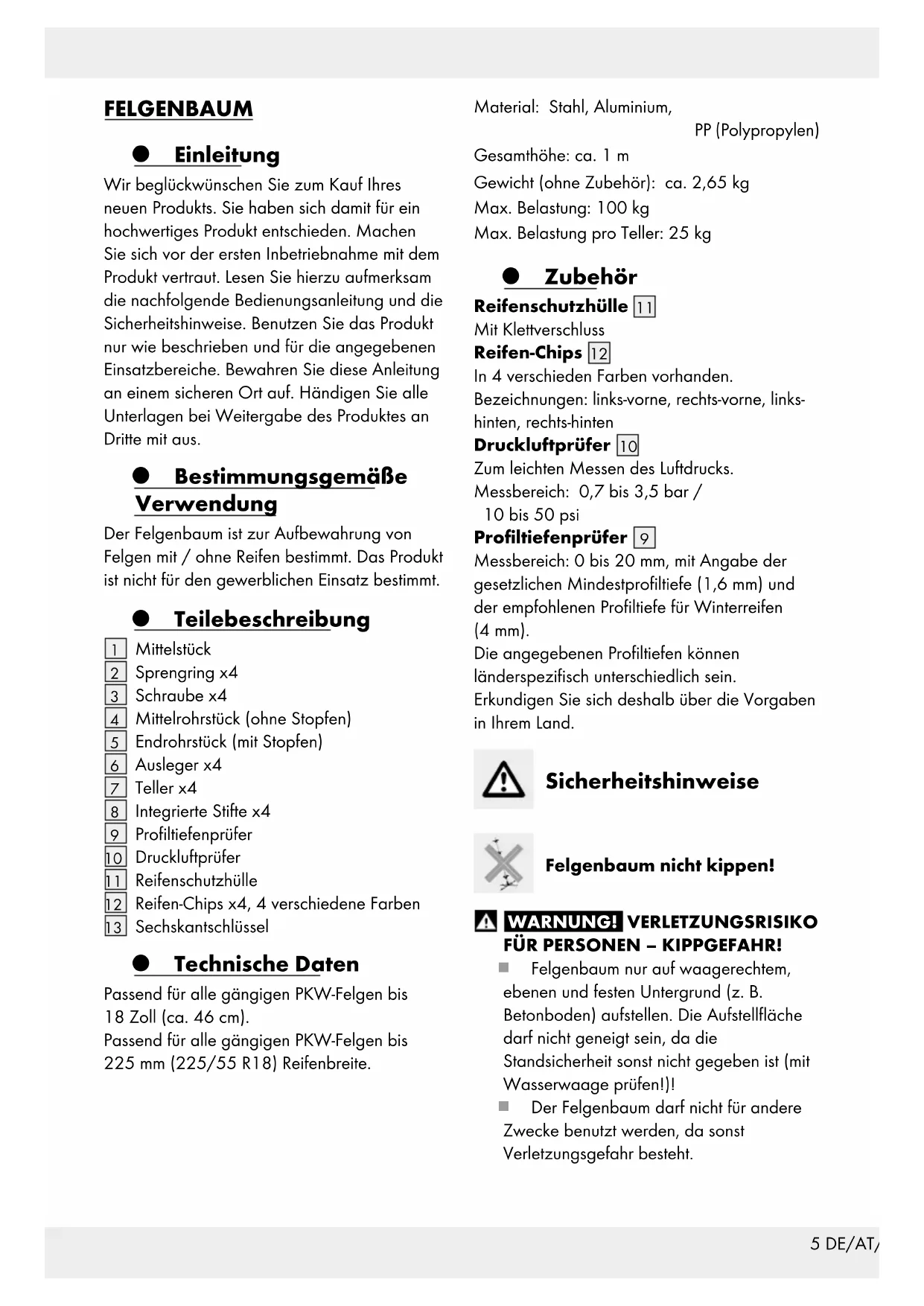 Messbereich: 0 bis 20 mm, mit Angabe der gesetzlichen Mindestprofiltiefe (1,6 mm) und der empfohlenen Profiltiefe für Winterreifen (4 mm). Die angegebenen Profiltiefen können länderspezifisch unterschiedlich sein. Erkundigen Sie sich deshalb über die Vorgaben in Ihrem Land. Sicherheitshinweise Felgenbaum nicht kippen! WARNUNG! VERLETZUNGSRISIKO FÜR PERSONEN – KIPPGEFAHR! Felgenbaum nur auf waagerechtem, ebenen und festen Untergrund (z. B. Betonboden) aufstellen. Die Aufstellfläche darf nicht geneigt sein, da die Standsicherheit sonst nicht gegeben ist (mit Wasserwaage prüfen!)! Der Felgenbaum darf nicht für andere Zwecke benutzt werden, da sonst Verletzungsgefahr besteht.6 DE/AT/CH Verstellen des Felgenbaums an einen anderen Ort aufgrund von Kippgefahr immer ohne Belastung (Felgen + Reifen) vornehmen. Das Kippen des Felgenbaums ist untersagt, da sonst Verletzungen erfolgen können. Der Felgenbaum darf bei Defekt wegen Verletzungsgefahr nicht weiter benutzt werden. Den Felgenbaum immer mit zwei Händen bedienen.