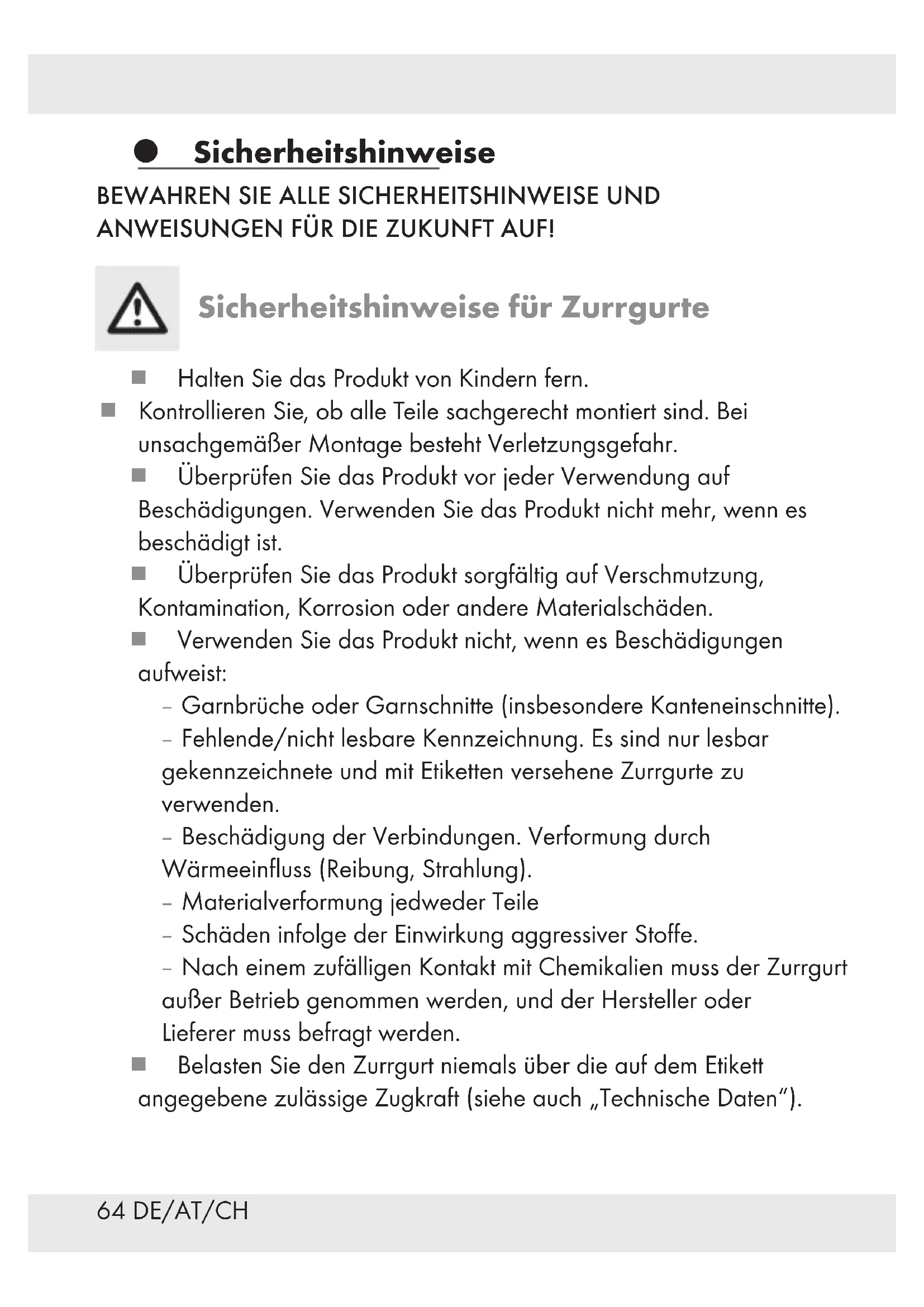 ANWEISUNGEN FÜR DIE ZUKUNFT AUF! Sicherheitshinweise für Zurrgurte Halten Sie das Produkt von Kindern fern. Kontrollieren Sie, ob alle Teile sachgerecht montiert sind. Bei unsachgemäßer Montage besteht Verletzungsgefahr. Überprüfen Sie das Produkt vor jeder Verwendung auf Beschädigungen. Verwenden Sie das Produkt nicht mehr, wenn es beschädigt ist. Überprüfen Sie das Produkt sorgfältig auf Verschmutzung, Kontamination, Korrosion oder andere Materialschäden. Verwenden Sie das Produkt nicht, wenn es Beschädigungen aufweist: – Garnbrüche oder Garnschnitte (insbesondere Kanteneinschnitte). – Fehlende/nicht lesbare Kennzeichnung. Es sind nur lesbar gekennzeichnete und mit Etiketten versehene Zurrgurte zu verwenden. – Beschädigung der Verbindungen. Verformung durch Wärmeeinfluss (Reibung, Strahlung). – Materialverformung jedweder Teile – Schäden infolge der Einwirkung aggressiver Stoffe. – Nach einem zufälligen Kontakt mit Chemikalien muss der Zurrgurt außer Betrieb genommen werden, und der Hersteller oder Lieferer muss befragt werden. Belasten Sie den Zurrgurt niemals über die auf dem Etikett angegebene zulässige Zugkraft (siehe auch „Technische Daten“).65DE/AT/CH Wählen Sie entsprechend der vorgesehenen Verzurrart, Zugkraft und Ladeoberfläche den geeigneten Zurrgurt aus (siehe Kennzeichnungs-Etikett). Vergewissern Sie sich, dass die Fahrzeugteile, an denen die Ladung befestigt werden soll, ausreichend stabil sind. Achten Sie darauf, dass die Zurrgurte nicht verdreht/verknotet sind und mit der ganzen Breite tragen. Halten Sie den Zurrgurt von heißen Oberflächen fern. Verteilen Sie die Zurrgurte gleichmäßig auf die zu sichernde Last. Verwenden Sie die Zurrgurte niemals als Anschlagmittel.
