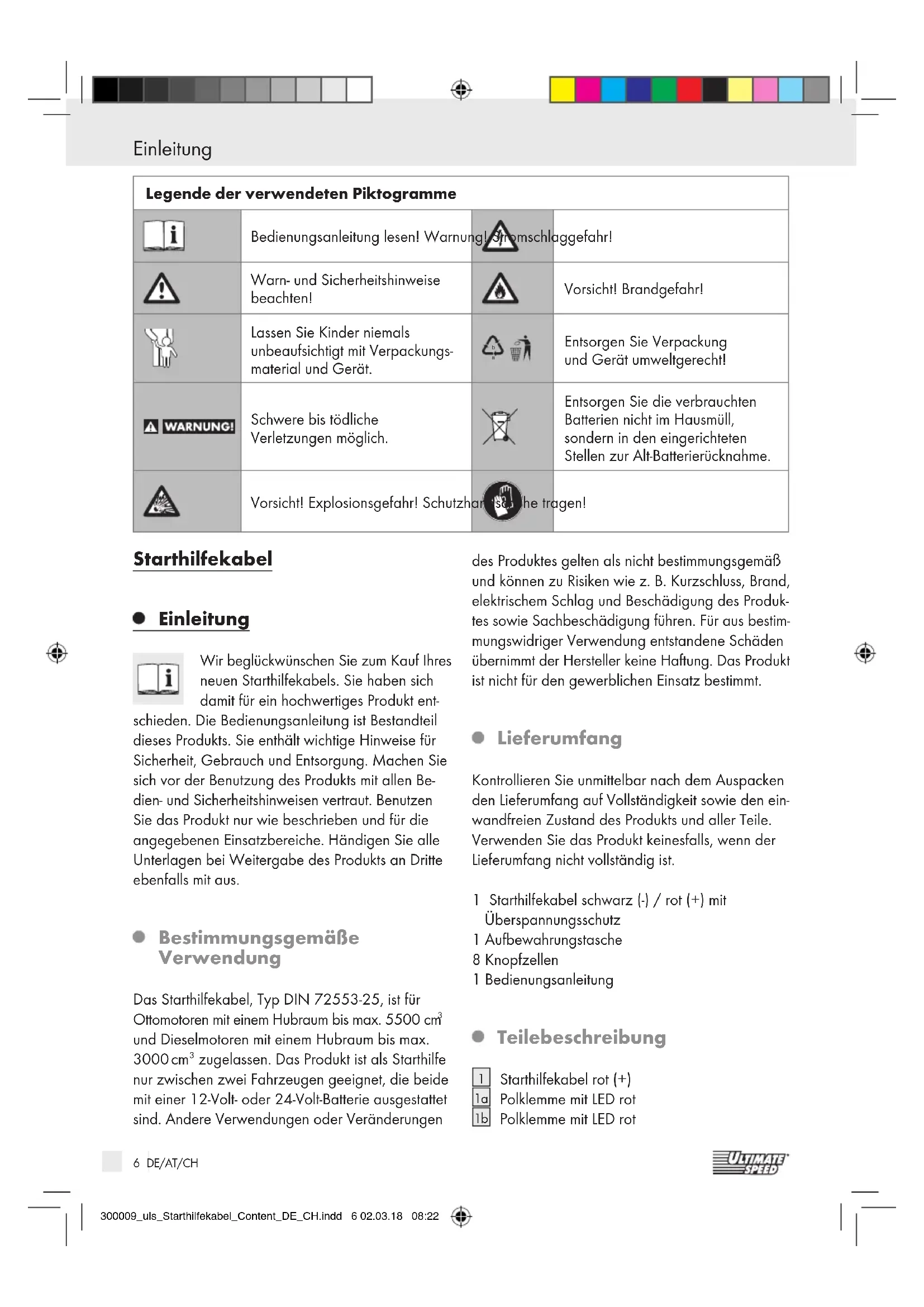 Entsorgen Sie Verpackung und Gerät umweltgerecht! Schwere bis tödliche Verletzungen möglich. Entsorgen Sie die verbrauchten Batterien nicht im Hausmüll, sondern in den eingerichteten Stellen zur Alt-Batterierücknahme. Vorsicht! Explosionsgefahr! Schutzhandschuhe tragen! 300009_uls_Starthilfekabel_Content_DE_CH.indd 6 02.03.18 08:227 DE/AT/CH Einleitung / Sicherheit Einleitung