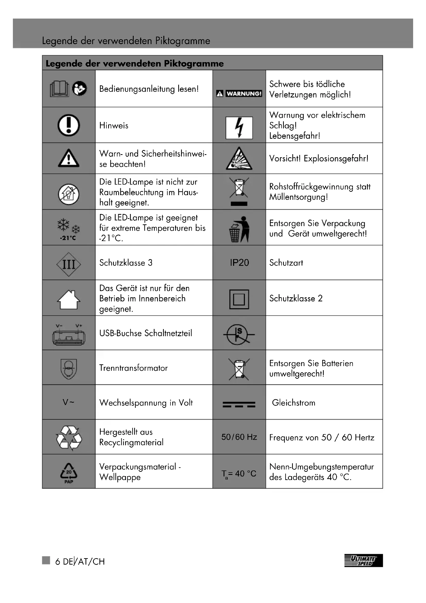 = 40 °C Nenn-Umgebungstemperatur des Ladegeräts 40 °C. 322269_Mobile_Autostarthilfe_mit_Powerbank_UMAP_12000_A1_content_LB8.indb 6 28.05.2019 13:47:347DE/AT/CH Einleitung Mobile Autostarthilfe mit Powerbank UMAP 12000 A1 z Einleitung Herzlichen Glückwunsch! Sie haben sich für ein hochwertiges Produkt aus unserem Haus entschieden. Machen Sie sich vor der ersten Inbetriebnahme mit dem Produkt vertraut. Lesen Sie hierzu aufmerksam die nachfolgende Bedienungsan- leitung und die Sicherheitshinweise. Die Inbetriebnahme dieses Produktes darf nur durch unterwiesene Personen erfolgen. NICHT IN DIE HÄNDE VON KINDERN KOMMEN LASSEN! Nur für Benzinmotoren bis max. 3 Liter Hubraum und bei Dieselmotoren bis max. 2 Liter Hubraum geeignet. z Bestimmungsgemäße Verwendung Diese mobile Autostarthilfe mit Powerbank dient der zusätzlichen Unterstützung von 12 V-Fahrzeugbatterie-Systemen bei Start- problemen an Diesel- und Benzin-Fahrzeug- motoren, welche durch schwache oder leere Starterbatterien verursacht werden. Die Mo- bile Autostarthilfe mit Powerbank kann die Fahrzeugbatterie allerdings nicht ersetzen. Sie ermöglicht dem Anwender im Bedarfsfall lediglich das Fahrzeug ohne weitere Hilfe von dritter Seite zu starten, wenn nicht mehr als 300 A zum Startvorgang notwendig sind (max. Spitzenstrom). Diese mobile Autostarthilfe mit Powerbank dient nicht der zusätzlichen Unterstützung von 6 V-Batterien. Zusätzlich verfügt die mobile Autostarthilfe mit Powerbank über 2 USB-Aus gänge. Damit können im Bedarfsfall Mobiltelefon, Naviga- tionsgerät oder andere USB-Anschluss geräte geladen werden. Jede andere Verwendung kann zu Schäden an der mobilen Autostarthilfe mit Powerbank führen und eine ernsthafte Gefahr für den Benutzer darstellen. Der Hersteller haftet nicht für Schäden, die durch bestimmungswidrigen Gebrauch oder falsche Bedienung verursacht wurden. Diese mobile Autostarthilfe mit Powerbank ist nicht zur gewerblichen Nutzung geeig- net. Bei gewerblichem Einsatz erlischt die Garantie. Die LED-Lampe ist nicht zur Raum beleuchtung im Haushalt geeignet. -21°C Die LED-Lampe ist geeignet für extreme Temperaturen bis -21°C. z Ausstattung Überprüfen Sie unmittelbar nach dem Auspacken immer den Lieferumfang auf Vollständigkeit sowie den einwandfreien Zustand des Gerätes. Benutzen Sie das Gerät nicht, wenn dieses defekt ist.