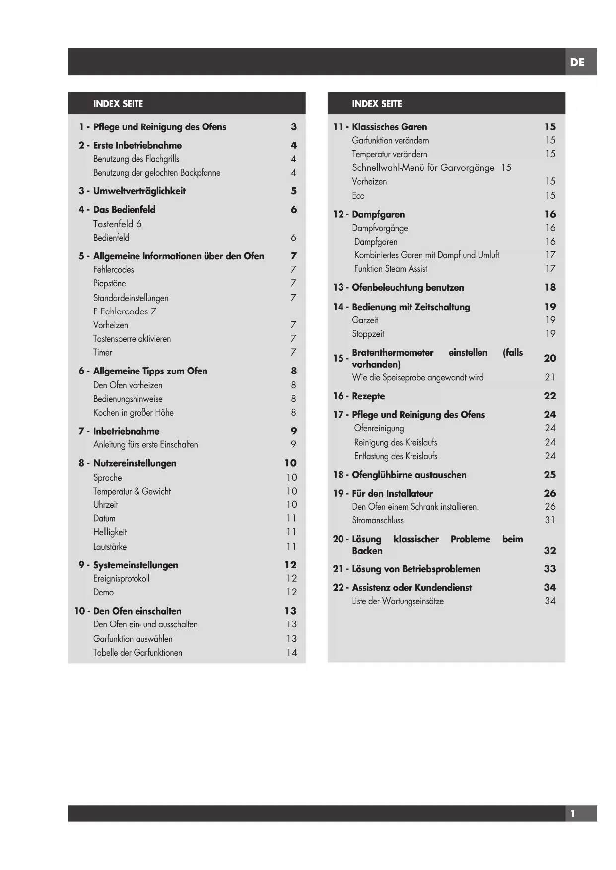 BevorSiesichmitdemKundendienstinVerbindungsetzen,prüfenSiebitteFolgendes,umunnötigeKostendesKundendiensteszuvermeiden. Problem des Ofens Schritte zur Lösung des Problems Other F__ Error erscheint am Bildschirm. Stromversorgung unterbrechen und nach einigen Sekunden wieder einschalten. Sollte die Bedingung verbleiben, dann die Codenummer notieren(ListeEREIGNISPROTOKOLL)unddenKundendienstrufen. Das Display des Ofens bleibt auf AUS Stromversorgung an der Hauptversorgung unterbrechen (Sicherung oder Stromkasten). Stromkreisunterbrecher wieder anschalten. BleibtdieBedingungbestehen,dannmussderKundendienstverständigt werden. DerVentilatorzurKühlungläuftauchnachdemAbschaltenweiter Der Ventilator geht automatisch aus, wenn die elektrischen Bauteile entsprechend abgekühlt sind. Der Ofen heizt nicht Überprüfen Sie den Stromkreisunterbrecher oder den Kasten mit den Sicherungen an Ihrem Haus. Sicherstellen, dass der Ofen mit dem richtigen Strom versorgt wird. Überprüfen, dass die Ofentemperatur ausgewählt wurde. DerOfenbacktnichtgleichmäßig Die empfohlene Position des Gitterrosts kann der Backzeittabelle entnommen werden. Die im Rezept angegebene Temperatur immer um 25°F(15°C)verringern,wennmitUmluftgebackenwird. Die Ofenbeleuchtung funktioniert nicht richtig Birne austauschen oder festschrauben, falls defekt oder locker. Siehe Seite25.GlühbirnennichtmitbloßenFingerberühren,dadurchderen Fett Glühbirnen früher durchbrennen können. Uhr und Timer funktionieren nicht richtig Sicherstellen, dass der Ofen mit dem richtigen Strom versorgt wird.DE