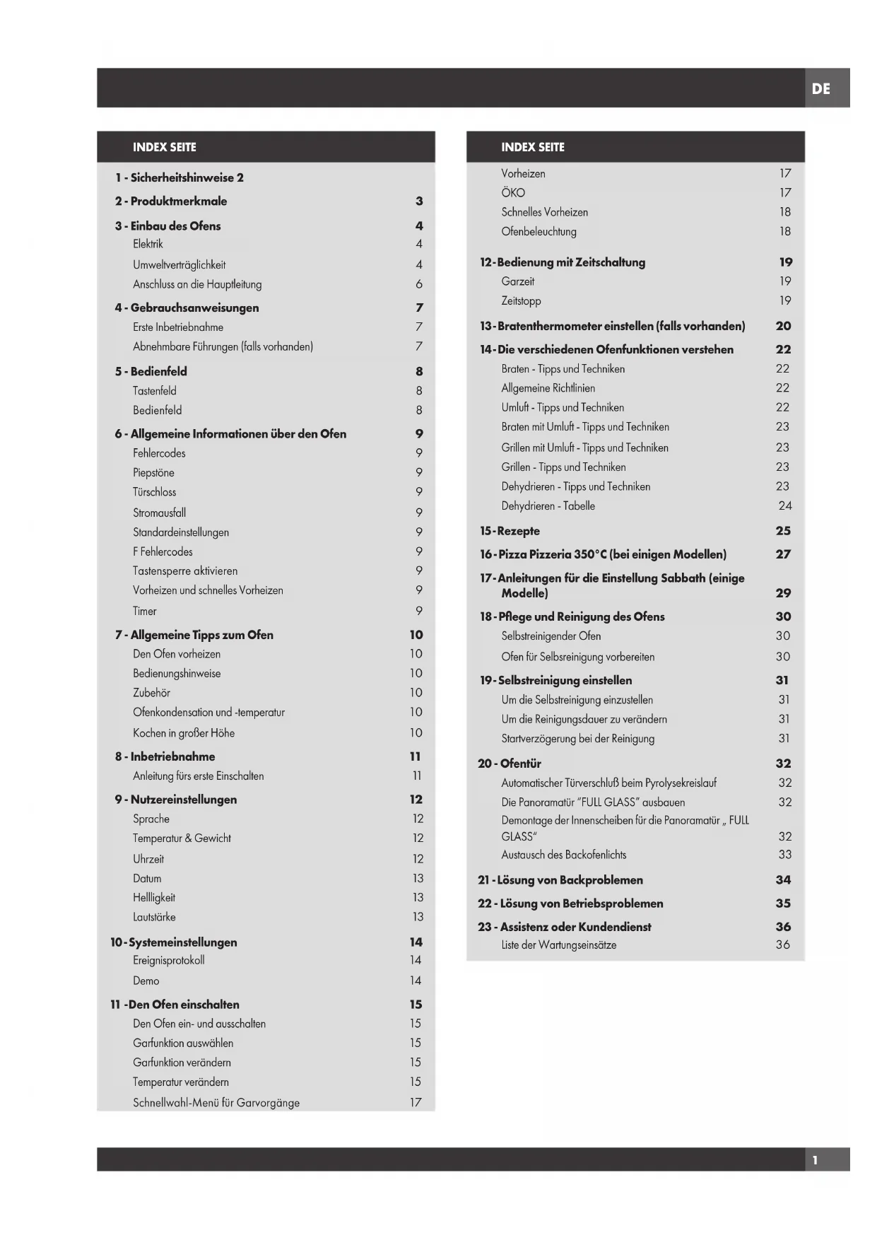 Bevor Sie sich mit dem Kundendienst in Verbindung setzen, prüfen Sie bitte Folgendes, um unnötige Kosten des Kundendienstes zu vermeiden. Problem des Ofens Schritte zur Lösung des Problems Fehler F1030* oder F2030* erscheint an der Anzeige. Es gibt ein Problem mit dem Verriegelungsmechanismus. Stromversorgung unterbrechen und nach einigen Sekunden wieder einschalten. Der Ofen muss einen Test der Verriegelung durchführen. Sollte die Bedingung verbleiben, dann die Codenummer notieren (Liste EREIGNISPROTOKOLL) und den Kundendienst rufen. Other F__ Error erscheint am Bildschirm. Stromversorgung unterbrechen und nach einigen Sekunden wieder einschalten. Sollte die Bedingung verbleiben, dann die Codenummer notieren (Liste EREIGNISPROTOKOLL) und den Kundendienst rufen. Das Display des Ofens bleibt auf AUS Stromversorgung an der Hauptversorgung unterbrechen (Sicherung oder Stromkasten). Stromkreisunterbrecher wieder anschalten. Bleibt die Bedingung bestehen, dann muss der Kundendienst verständigt werden. Der Ventilator zur Kühlung läuft auch nach dem Abschalten weiter Der Ventilator geht automatisch aus, wenn die elektrischen Bauteile entsprechend abgekühlt sind. Die Ofentür ist verschlossen und geht auch nach dem Abkühlen nicht auf Ofen am Leistungsschalter ausschalten und einige Sekunden abwarten. Stromkreisunterbrecher wieder anschalten. Der Ofen sollte ein Reset durchführen und wieder funktionieren. Der Ofen heizt nicht Überprüfen Sie den Stromkreisunterbrecher oder den Kasten mit den Sicherungen an Ihrem Haus. Sicherstellen, dass der Ofen mit dem richtigen Strom versorgt wird. Überprüfen, dass die Ofentemperatur ausgewählt wurde. Der Ofen backt nicht gleichmäßig Die empfohlene Position des Gitterrosts kann der Backzeittabelle entnommen werden. Die im Rezept angegebene Temperatur immer um 25°F (15°C) verringern, wenn mit Umluft gebacken wird. Die Ofenbeleuchtung funktioniert nicht richtig Birne austauschen oder festschrauben, falls defekt oder locker. Siehe Seite33. Glühbirnen nicht mit bloßen Finger berühren, da durch deren Fett Glühbirnen früher durchbrennen können. Das Ofenlicht bleibt an Nach Hindernissen an der Ofentür suchen. Überprüfen, ob das Scharnier verbogen oder der Türschalter defekt ist. Der Ofen reinigt sich nicht richtig von selbst. Ofen vor der Selbstreinigung abkühlen lassen. Groben Schmutz und Übergelaufenes immer entfernen, bevor die Selbstreinigung gestartet wird. Ist der Ofen stark verschmutzt, dann eine vierstündige Selbstreinigung einstellen. Siehe: Den Ofen für die Selbstreinigung vorbereiten 31. Uhr und Timer funktionieren nicht richtig Sicherstellen, dass der Ofen mit dem richtigen Strom versorgt wird. Siehe: Einstellung der Uhrzeit auf Seite 12. Zuviel Feuchtigkeit Beim Backen zuerst den Ofen vorheizen. Backen mit Umluft und Braten mit Umluft entfernen jegliche Feuchtigkeit im Ofen(dies ist einer der Vorteile von Umluft). Porzellanspäne Beim Herausnehmen und Hineinschieben von Backblechen, diese immer leicht anheben und diese nicht mit Gewalt bewegen, damit das Porzellan nicht beschädigt wird.DE