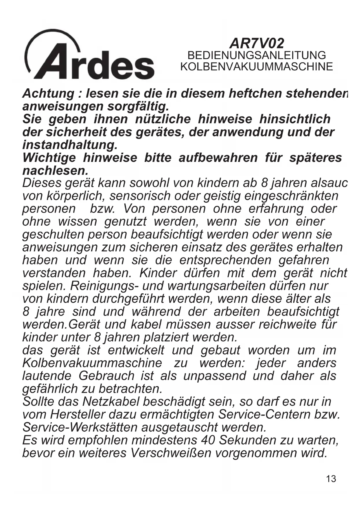 Type Aliments Temps de conservation sous pression Temps de conservation sous vide Viandes rouges 3-4 jours 8-9 jours Viandes blanches 2-3 jours 6-9 jours Poissons entiers 1-3 jours 4-5 jours Gibier 2-3 jours 5-7 jours Charcuterie 7-15 jours 25-40 jours Charcuterie coupée 4-6 jours 20-25 jours Fromages mous 5-7 jours 14-20 jours Fromages durs et semi- durs 15-20 jours 25-60 jours Légumes 1-3 jours 7-10 jours Fruits 5-7 jours 14-20 jours CONSERVATION AU REFRIGERATEUR A 5°C ± 2°C APRES CUISSON Type Aliments Temps de conservation sous pression atmosphérique Temps de conservation sous vide Potages et soupes de légumes 2-3 jours 8-10 jours Pâtes et risottos 2-3 jours 6-8 jours Viandes cuites à l'eau et rôtis 3-4 jours 10-15 jours Desserts farcis (crèmes et fruits) 2-3 jours 6-8 jours Huile à frire 10-15 jours 25-40 jours CONSERVATION AU CONGELATEUR A -18°C ± 2°C Type Aliments Temps de conservation sous pression Temps de conservation sous vide Potages et soupes de légumes 4-6 mois 15-20 mois Pâtes et risottos 3-4 mois 10-12 mois Viandes cuites à l'eau et rôtis 8-10 mois 18-24 mois13 AR7V02 BEDIENUNGSANLEITUNG KOLBENVAKUUMMASCHINE Achtung : lesen sie die in diesem heftchen stehenden anweisungen sorgfältig. Sie geben ihnen nützliche hinweise hinsichtlich der sicherheit des gerätes, der anwendung und der instandhaltung. Wichtige hinweise bitte aufbewahren für späteres nachlesen. Dieses gerät kann sowohl von kindern ab 8 jahren alsauch von körperlich, sensorisch oder geistig eingeschränkten personen bzw. Von personen ohne erfahrung oder ohne wissen genutzt werden, wenn sie von einer geschulten person beaufsichtigt werden oder wenn sie anweisungen zum sicheren einsatz des gerätes erhalten haben und wenn sie die entsprechenden gefahren verstanden haben. Kinder dürfen mit dem gerät nicht spielen. Reinigungs- und wartungsarbeiten dürfen nur von kindern durchgeführt werden, wenn diese älter als 8 jahre sind und während der arbeiten beaufsichtigt werden.Gerät und kabel müssen ausser reichweite für kinder unter 8 jahren platziert werden. das gerät ist entwickelt und gebaut worden um im Kolbenvakuummaschine zu werden: jeder anders lautende Gebrauch ist als unpassend und daher als gefährlich zu betrachten. Sollte das Netzkabel beschädigt sein, so darf es nur in vom Hersteller dazu ermächtigten Service-Centern bzw. Service-Werkstätten ausgetauscht werden. Es wird empfohlen mindestens 40 Sekunden zu warten, bevor ein weiteres Verschweißen vorgenommen wird.14
