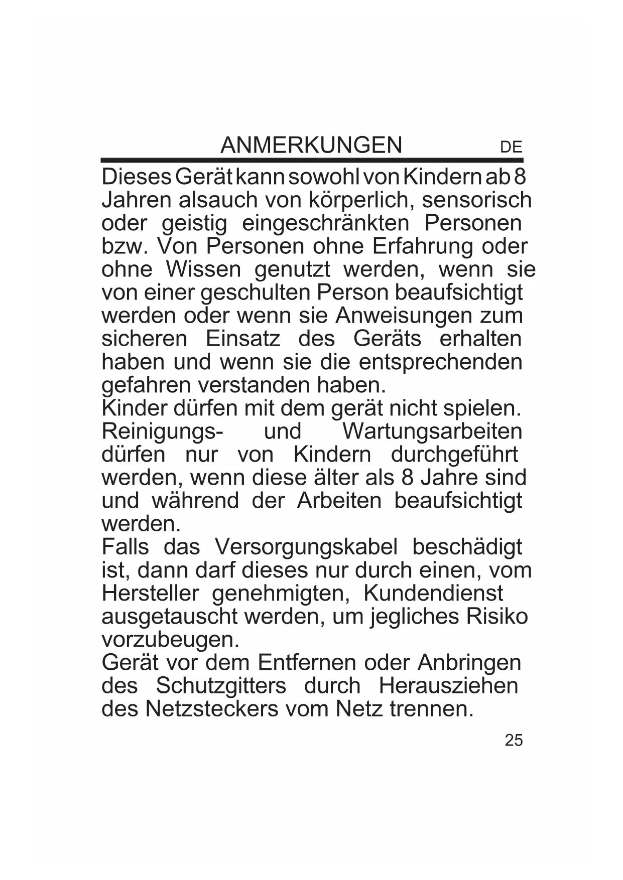 INFORMATION UTILISATEUR « Mise en oeuvre de la directive 2012/19/UE sur les déchets d’équipements électriques et électroniques (DEEE) », relative à la réduction de l’utilisation de substances dangereuses dans les appareils électriques et électroniques, ainsi qu’à l’élimination des déchets. Le symbole de la poubelle sur roulettes barrée sur l’appareil ou sur son emballage indique que le produit doit être éliminé séparément des autres déchets à la n de sa durée de vie. L’utilisateur doit donc apporter l’appareil à jeter à des centres de collecte séparés appropriés pour les déchets électriques et électroniques. Pour plus de détails, veuillez contacter l’autorité locale spéciale. Une collecte séparée appropriée de l’appareil pour un recyclage, un traitement ou une élimination respectueux de l’environnement permet d’éviter les dommages à l’environnement et à la santé humaine et encourage la réutilisation et/ou le recyclage des matériaux qui composent l’appareil. L’élimination abusive du produit par l’utilisateur entraînera l’application d’amendes administratives conformément aux lois en vigueur. ÉLIMINATION EMBALLAGES An de respecter l’environnement, les matériaux d’emballage doivent être éliminés correctement, conformément à la collecte sélective. Vériez les réglementations locales.24 GARANTIE Conditions La garantie a une durée de 24 mois à compter de la date d’achat. Cette garantie est valable seulement si correctement compilée et accompagnée du ticket de caisse qui conrme la date d’achat. L’appareil doit être remis exclusivement à notre SAV agréé. La garantie couvre la substitution ou la réparation des composants de l’appareil défectueux à l’origine à cause de vices de fabrication. Nous garantissons toute de même l’assistance (payante) même des produits hors garantie. Le consommateur est titulaire des droits applicables par la législation nationale disciplinant la vente de biens de consommations ; cette garantie ne compromet pas les droits en question. Le fabricant décline toute responsabilité pour les éventuels dommages physiques ou matériels dérivant de l’utilisation impropre de l’appareil et du non-respect des consignes indiquées dans le manuel. Limitations Tous les droits de garantie et toutes nos responsabilités déchoient si l’appareil a été : -modié de la part de personnel non autorisé. -utilisé, conservé ou transporté de façon impropre. La garantie ne couvre pas les pertes de prestations esthétiques ou celles qui ne compromettent pas l’origine des fonctions. Si malgré l’attention dédiée au choix des composants et l’engagement dans la réalisation du produit que vous venez d’acheter vous remarquez des défauts ou si vous avez besoin d’informations, veuillez vous adresser au revendeur de zone.25 Dieses Gerät kann sowohl von Kindern ab 8 Jahren alsauch von körperlich, sensorisch oder geistig eingeschränkten Personen bzw. Von Personen ohne Erfahrung oder ohne Wissen genutzt werden, wenn sie von einer geschulten Person beaufsichtigt werden oder wenn sie Anweisungen zum sicheren Einsatz des Geräts erhalten haben und wenn sie die entsprechenden gefahren verstanden haben. Kinder dürfen mit dem gerät nicht spielen. Reinigungs- und Wartungsarbeiten dürfen nur von Kindern durchgeführt werden, wenn diese älter als 8 Jahre sind und während der Arbeiten beaufsichtigt werden. Falls das Versorgungskabel beschädigt ist, dann darf dieses nur durch einen, vom Hersteller genehmigten, Kundendienst ausgetauscht werden, um jegliches Risiko vorzubeugen. Gerät vor dem Entfernen oder Anbringen des Schutzgitters durch Herausziehen des Netzsteckers vom Netz trennen. ANMERKUNGEN DE26 ACHTUNG: Lesen Sie diese Broschüre sorgfältig durch, sie enthält wichtige Anweisungen für eine sichere Installation, Verwendung und Wartung. Bewahren Sie diese Anleitung zum späteren Nachschlagen auf. Es ist verboten, dass Kinder mit dem Gerät spielen. Dieses Gerät darf nur für den Zweck verwendet werden, für den es ausdrücklich konzipiert wurde; jede Verwendung, die nicht den in der Bedienungsanleitung enthaltenen Anweisungen entspricht, gilt als unsachgemäß und gefährlich. Der Hersteller haftet nicht für eventuelle Schäden, die durch eine unsachgemäße und/oder unvernünftige Verwendung verursacht werden. Dieses Gerät ist NICHT für den Einsatz in explosionsgefährdeter Umgebung geeignet (bei Vorhandensein von entammbaren Stoen wie Gas, Dampf, Nebel oder Staub, unter atmosphärischen Bedingungen, wenn sich die Verbrennung nach der Zündung in der Luft ausbreitet). Das Verpackungsmaterial (Plastikbeutel, Styropor usw.) muss für Kinder und Behinderte unzugänglich aufbewahrt werden, da es eine potenzielle Gefahrenquelle darstellt. Die Installation/Montage des Geräts erfolgt nach den Angaben des Herstellers. Eine falsche Vorgehensweise kann zu Schäden an Personen, Tieren oder Gegenständen führen, für die der Hersteller nicht verantwortlich gemacht werden kann. Aufstellen und benutzen das Gerät auf einer waagerechten und stabilen Fläche. Überprüfen Sie vor dem Gebrauch die Unversehrtheit des Geräts und des Netzkabels. Falls Sie sich nicht sicher sind, wenden Sie sich an eine qualizierte Person. Vergewissern Sie sich vor dem Einschalten des Geräts, dass die Leistung (Spannung und Frequenz) dem Netz entspricht und die Steckdose für den Stecker des Geräts geeignet ist. Vergewissern Sie sich, dass das Stromnetz mit einem geeigneten Schutz gemäß den geltenden Vorschriften ausgestattet ist. Betreiben Sie das Gerät NICHT über Mehrfachsteckdosen. Vermeiden Sie nach Möglichkeit die Verwendung von Adaptern und/oder Verlängerungskabeln; wenn deren Verwendung unbedingt erforderlich ist, verwenden Sie nur Materialien, die den geltenden Sicherheitsvorschriften Das Gerät nicht an die Stromversorgung anschließen und verwenden Sie es nicht sei de