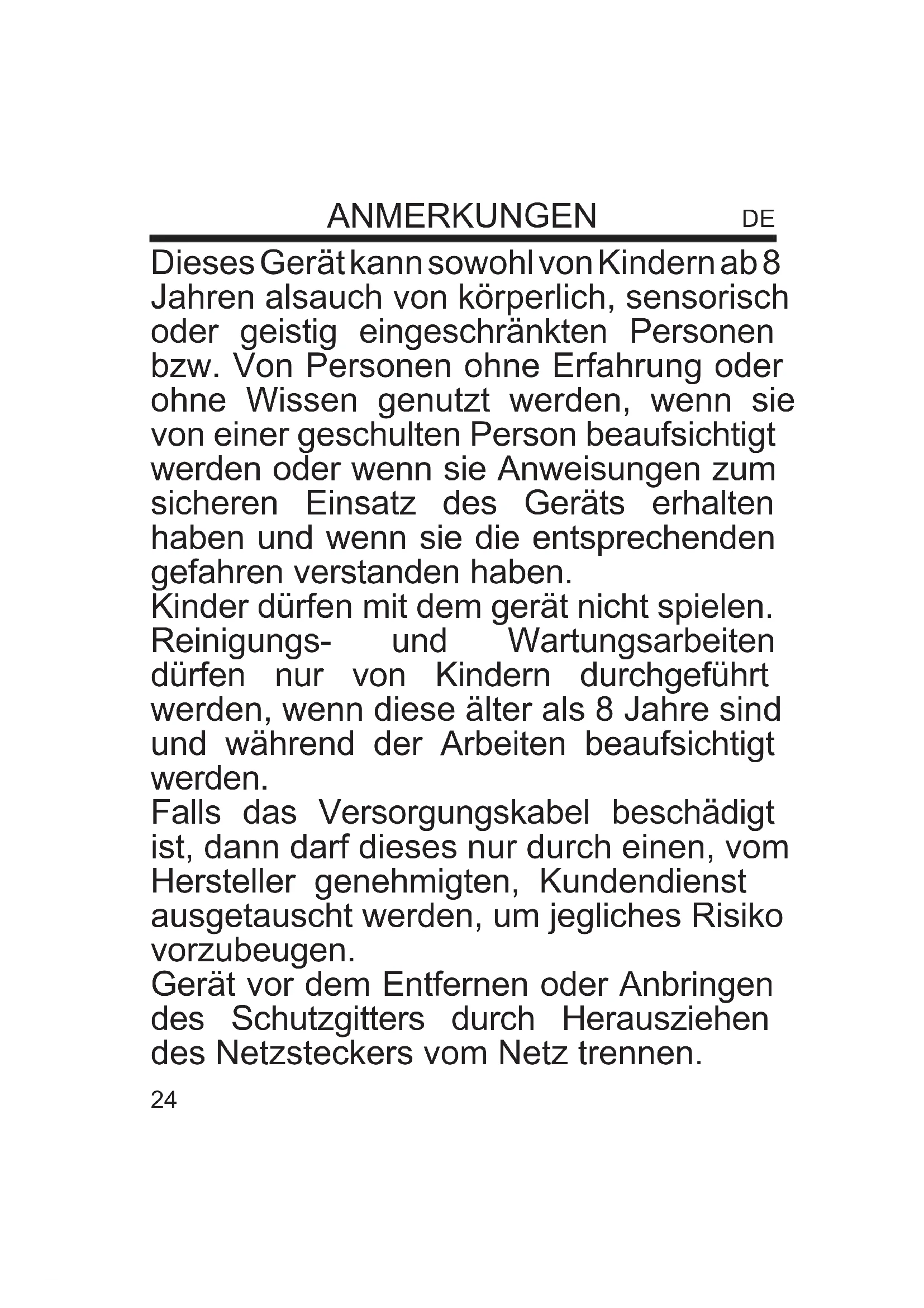 INFORMATION UTILISATEUR « Mise en oeuvre de la directive 2012/19/UE sur les déchets d’équipements électriques et électroniques (DEEE) », relative à la réduction de l’utilisation de substances dangereuses dans les appareils électriques et électroniques, ainsi qu’à l’élimination des déchets. Le symbole de la poubelle sur roulettes barrée sur l’appareil ou sur son emballage indique que le produit doit être éliminé séparément des autres déchets à la n de sa durée de vie. L’utilisateur doit donc apporter l’appareil à jeter à des centres de collecte séparés appropriés pour les déchets électriques et électroniques. Pour plus de détails, veuillez contacter l’autorité locale spéciale. Une collecte séparée appropriée de l’appareil pour un recyclage, un traitement ou une élimination respectueux de l’environnement permet d’éviter les dommages à l’environnement et à la santé humaine et encourage la réutilisation et/ou le recyclage des matériaux qui composent l’appareil. L’élimination abusive du produit par l’utilisateur entraînera l’application d’amendes administratives conformément aux lois en vigueur. ÉLIMINATION EMBALLAGES An de respecter l’environnement, les matériaux d’emballage doivent être éliminés correctement, conformément à la collecte sélective. Vériez les réglementations locales.23 GARANTIE Conditions La garantie a une durée de 24 mois à compter de la date d’achat. Cette garantie est valable seulement si correctement compilée et accompagnée du ticket de caisse qui conrme la date d’achat. L’appareil doit être remis exclusivement à notre SAV agréé. La garantie couvre la substitution ou la réparation des composants de l’appareil défectueux à l’origine à cause de vices de fabrication. Nous garantissons toute de même l’assistance (payante) même des produits hors garantie. Le consommateur est titulaire des droits applicables par la législation nationale disciplinant la vente de biens de consommations ; cette garantie ne compromet pas les droits en question. Le fabricant décline toute responsabilité pour les éventuels dommages physiques ou matériels dérivant de l’utilisation impropre de l’appareil et du non-respect des consignes indiquées dans le manuel. Limitations Tous les droits de garantie et toutes nos responsabilités déchoient si l’appareil a été : -modié de la part de personnel non autorisé. -utilisé, conservé ou transporté de façon impropre. La garantie ne couvre pas les pertes de prestations esthétiques ou celles qui ne compromettent pas l’origine des fonctions. Si malgré l’attention dédiée au choix des composants et l’engagement dans la réalisation du produit que vous venez d’acheter vous remarquez des défauts ou si vous avez besoin d’informations, veuillez vous adresser au revendeur de zone.24 Dieses Gerät kann sowohl von Kindern ab 8 Jahren alsauch von körperlich, sensorisch oder geistig eingeschränkten Personen bzw. Von Personen ohne Erfahrung oder ohne Wissen genutzt werden, wenn sie von einer geschulten Person beaufsichtigt werden oder wenn sie Anweisungen zum sicheren Einsatz des Geräts erhalten haben und wenn sie die entsprechenden gefahren verstanden haben. Kinder dürfen mit dem gerät nicht spielen. Reinigungs- und Wartungsarbeiten dürfen nur von Kindern durchgeführt werden, wenn diese älter als 8 Jahre sind und während der Arbeiten beaufsichtigt werden. Falls das Versorgungskabel beschädigt ist, dann darf dieses nur durch einen, vom Hersteller genehmigten, Kundendienst ausgetauscht werden, um jegliches Risiko vorzubeugen. Gerät vor dem Entfernen oder Anbringen des Schutzgitters durch Herausziehen des Netzsteckers vom Netz trennen. ANMERKUNGEN DE25 Garantiebescheinigung, skalische Quittung und Bedienungsanleitung für jede spätere Konsultation bitte aufbewahren. Nach Entfernen der Verpackung vergewissere man sich der Integrität des Gerätes und sollte man bei dieser Überprüfung sichtbare Beschädigungen festestellen, das Gerät nicht benutzen und sich direkt an qualiziertes Fachpersonal wenden. Keinerlei Verpackungsteile für Kinder zugänglich zurücklassen, das Gerät auch nicht als ein Spielzeug verwenden: es ist ein Elektrogerät und als solches zu behandeln. Bevor man das Gerät an die Netzspannung anschließt, stelle man sicher daß die an der Steckdose liegende Spannung auch derjenigen des Typenschildes des Gerätes entspricht. Die Sicherheit dieses Gerätes ist nur dann gewährleistet, wenn das Gerät auch an eine leistungsfähige Erdungsanlage angeschlossen ist. Sollten Stecker und Steckdose nicht kompatibel sein, so lasse man die Steckdose durch eine passende Steckdose ersetzen. Diese Arbeit ist von einem qualizierten Fachmann durchzuführen. Keine Adapter oder Verlängerungsschnuren verwenden die nicht den Forderungen der gegenwärtig geltenden Sicherheitsnormen genügen oder die die Stromgrenzwerte überschreiten. Trennen Sie das Gerät vom Stromnetz, wenn es nicht verwendet wird. Am Netzkabel oder am Gerät selbst nicht ziehen um Stecker aus der Steckdose herauszuziehen. Der Gebrauch irgendeines Elektrogerätes erfordert immer die Beachtung einiger grundlegenden Regeln und zwar insbesondere: - Man darf niemals das Gerät mit nassen oder feuchten Händen berühren. - Das Gerät niemals barfuß benutzen. - Das Gerät nicht den Witterungseinüssen ausgesetzt lassen (Regen, Sonnenstrahlung). - Gerät nicht Schlag-oder Stoßbeanspruchungen aussetzen. Es ist zu empfehlen, das Netzkabel für seine ganze Länge abzuwickeln um somit eventuelle Überhitzungen zu vermeiden. Sollte man sich dafür entscheiden diesen Gerätetyp nicht mehr zu benutzen, so ist es angebracht das Gerät unbenutzbar zu machen durch Abschneiden des Netzkabels, natürlich nach dessen Abtrennung von der Steckdose. Das Gerät nicht an die Stromversorgung anschließen und verwenden Sie es nicht sei denn, es ist komplett montiert (si